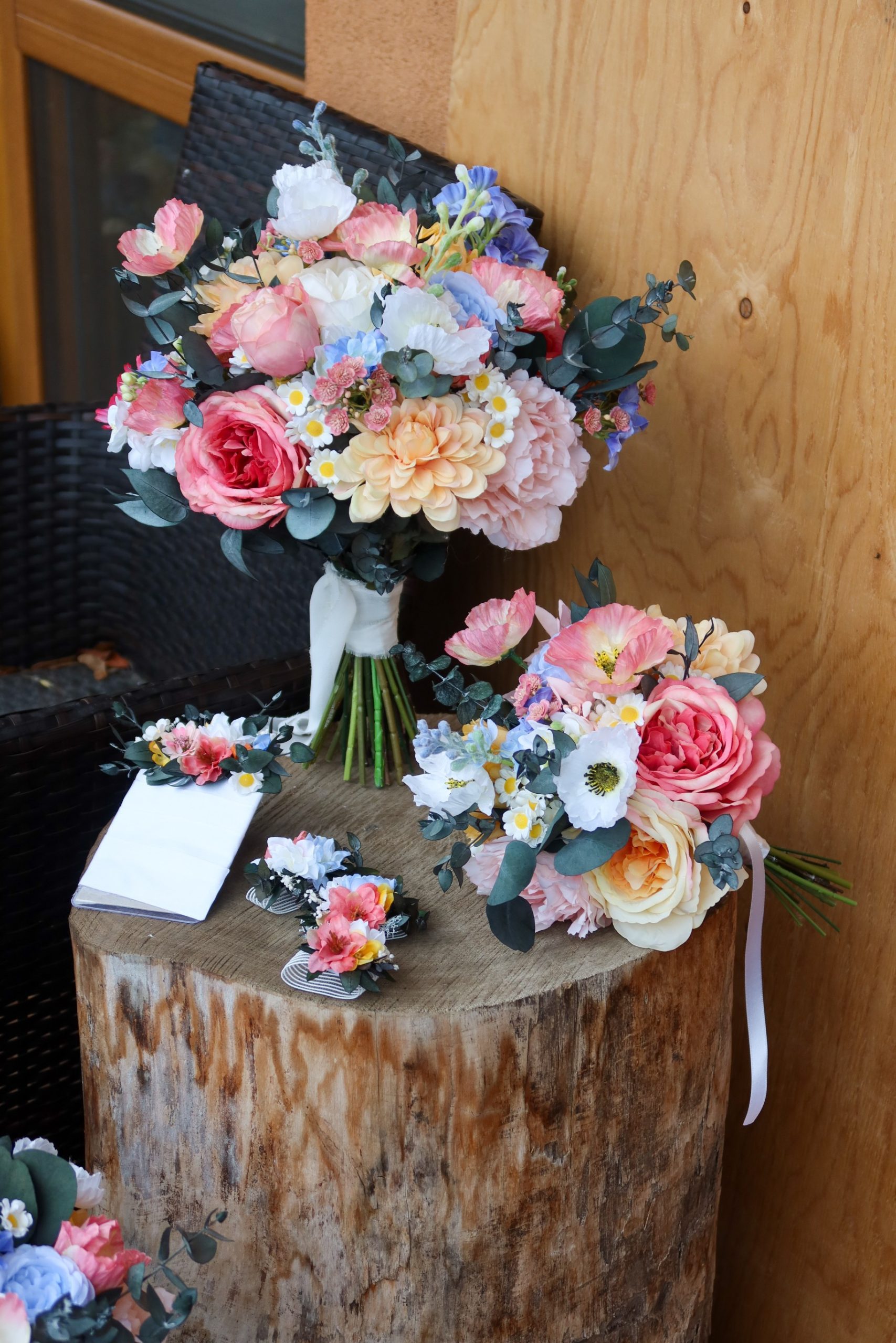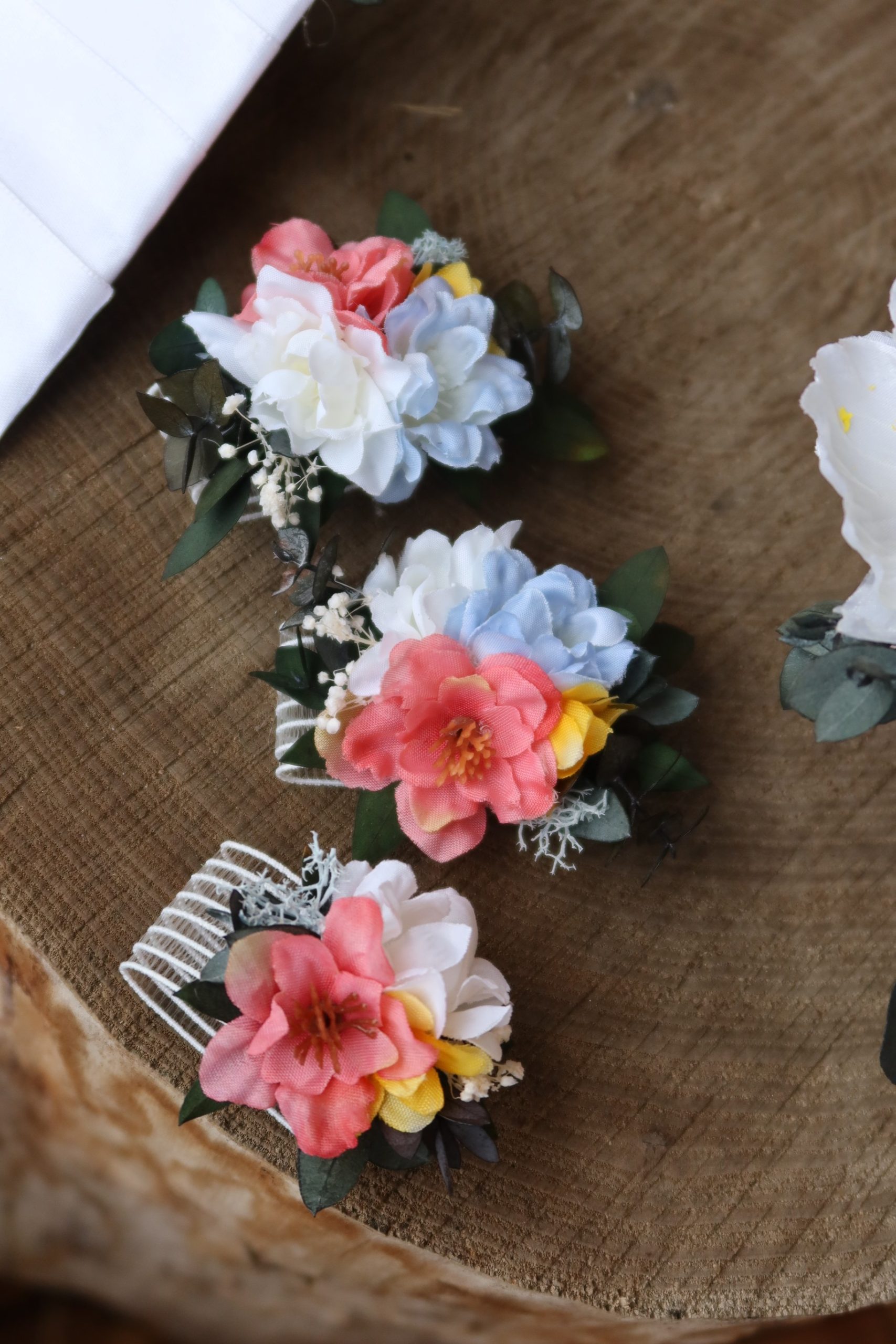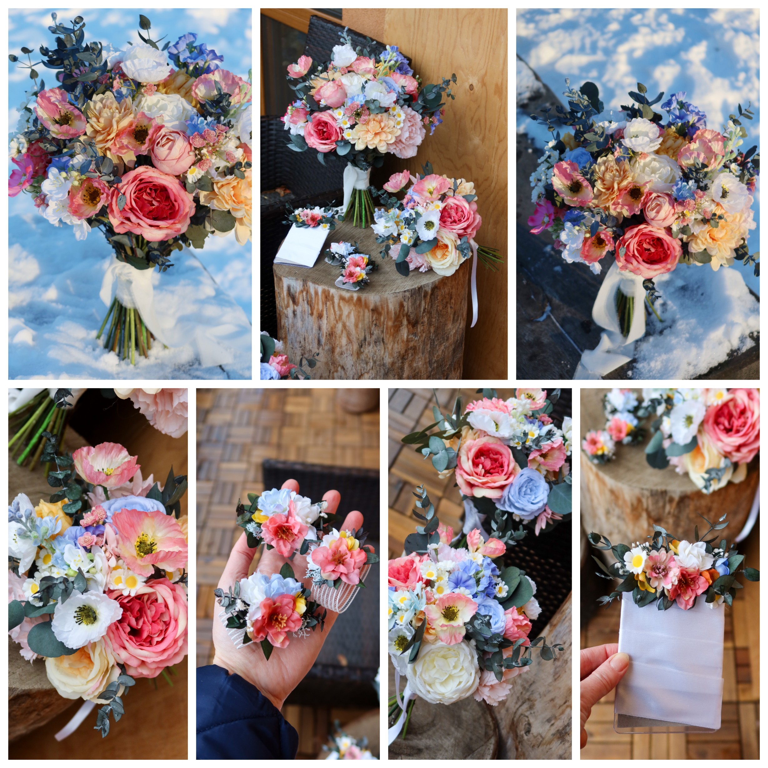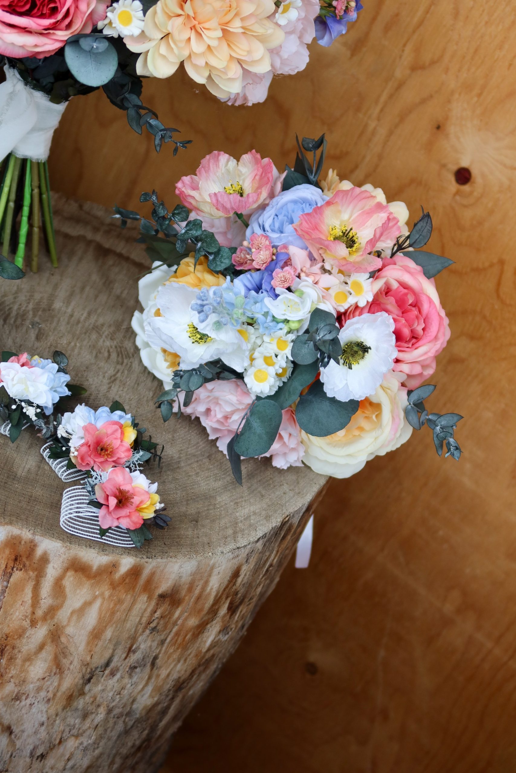 Svatební komplet na zakázku z kvalitních látkových květin, stabilizovaného eukalyptu a dalších přízdob obsahuje: