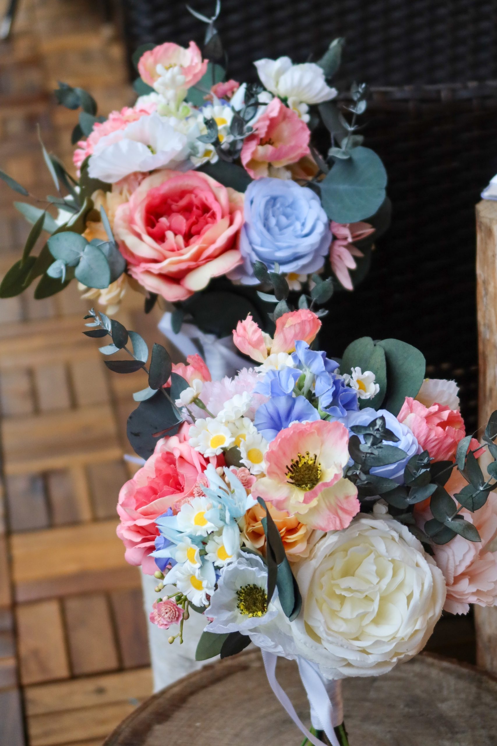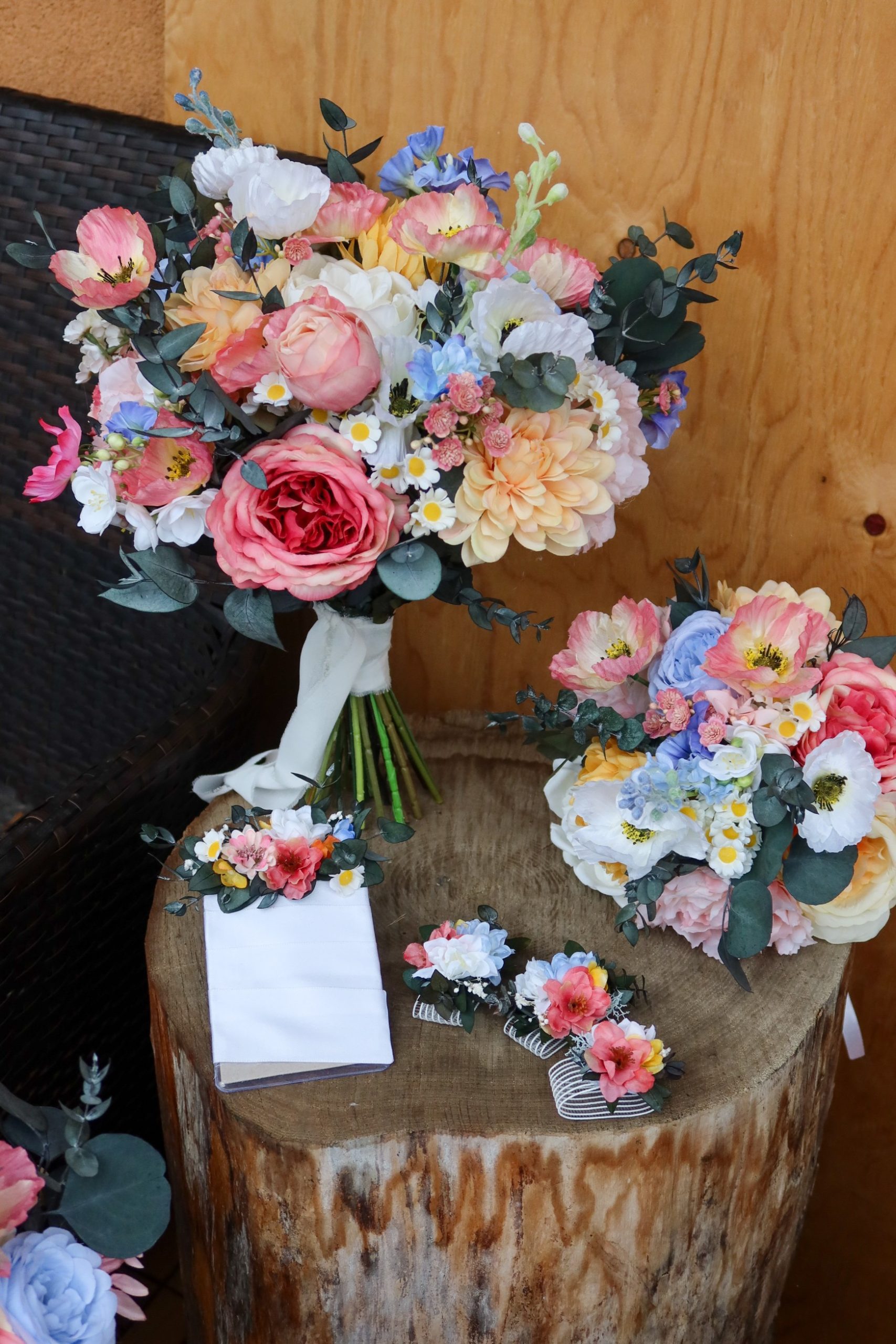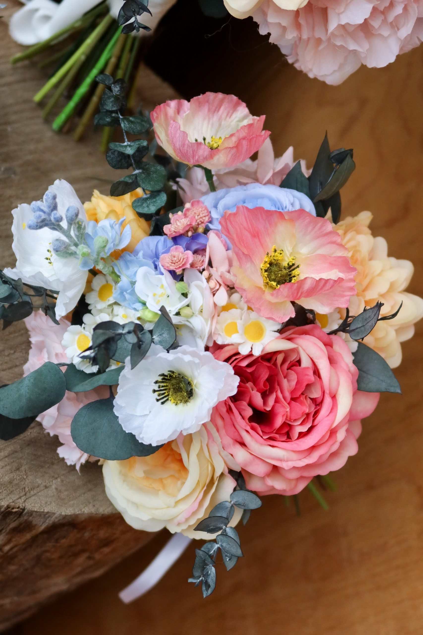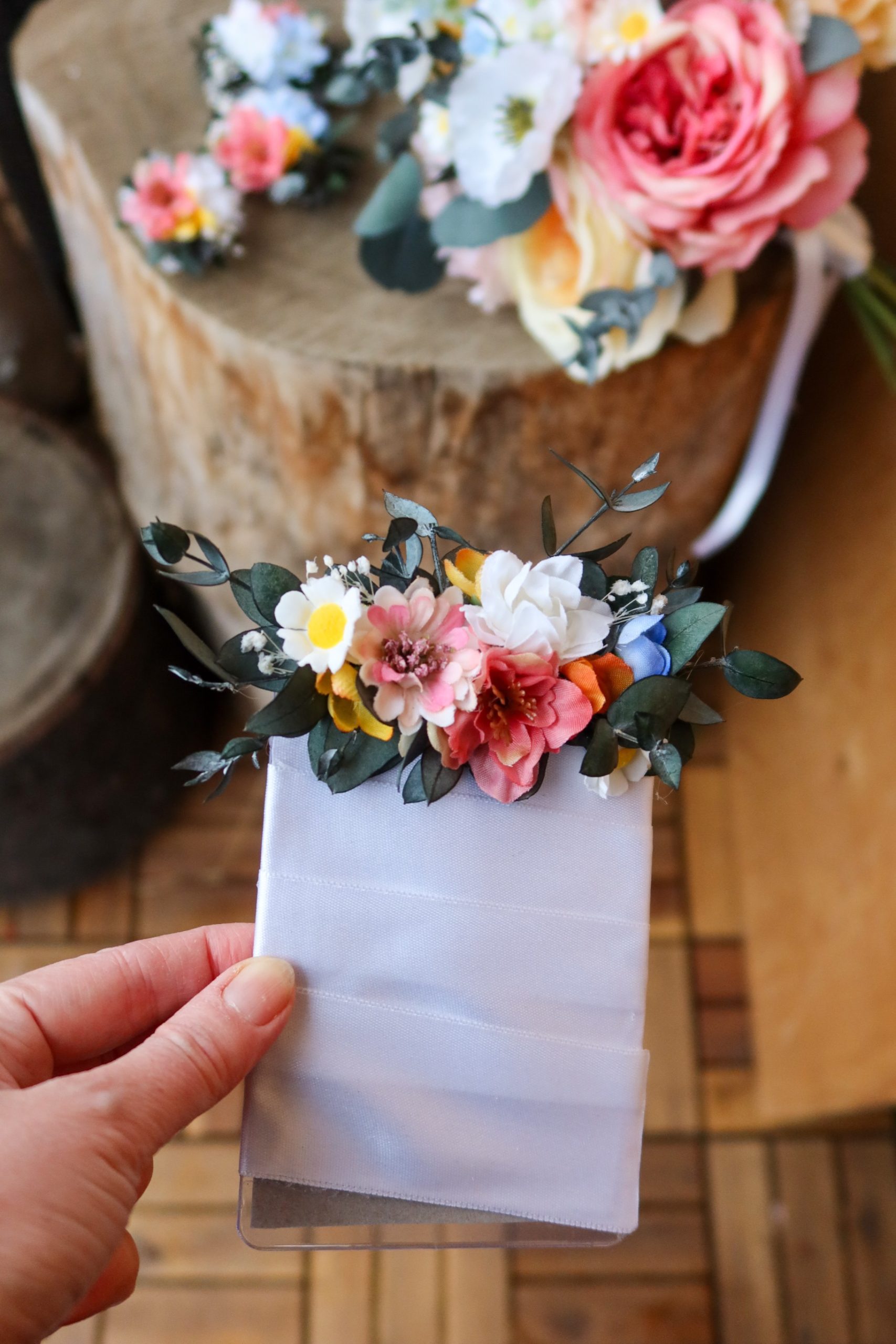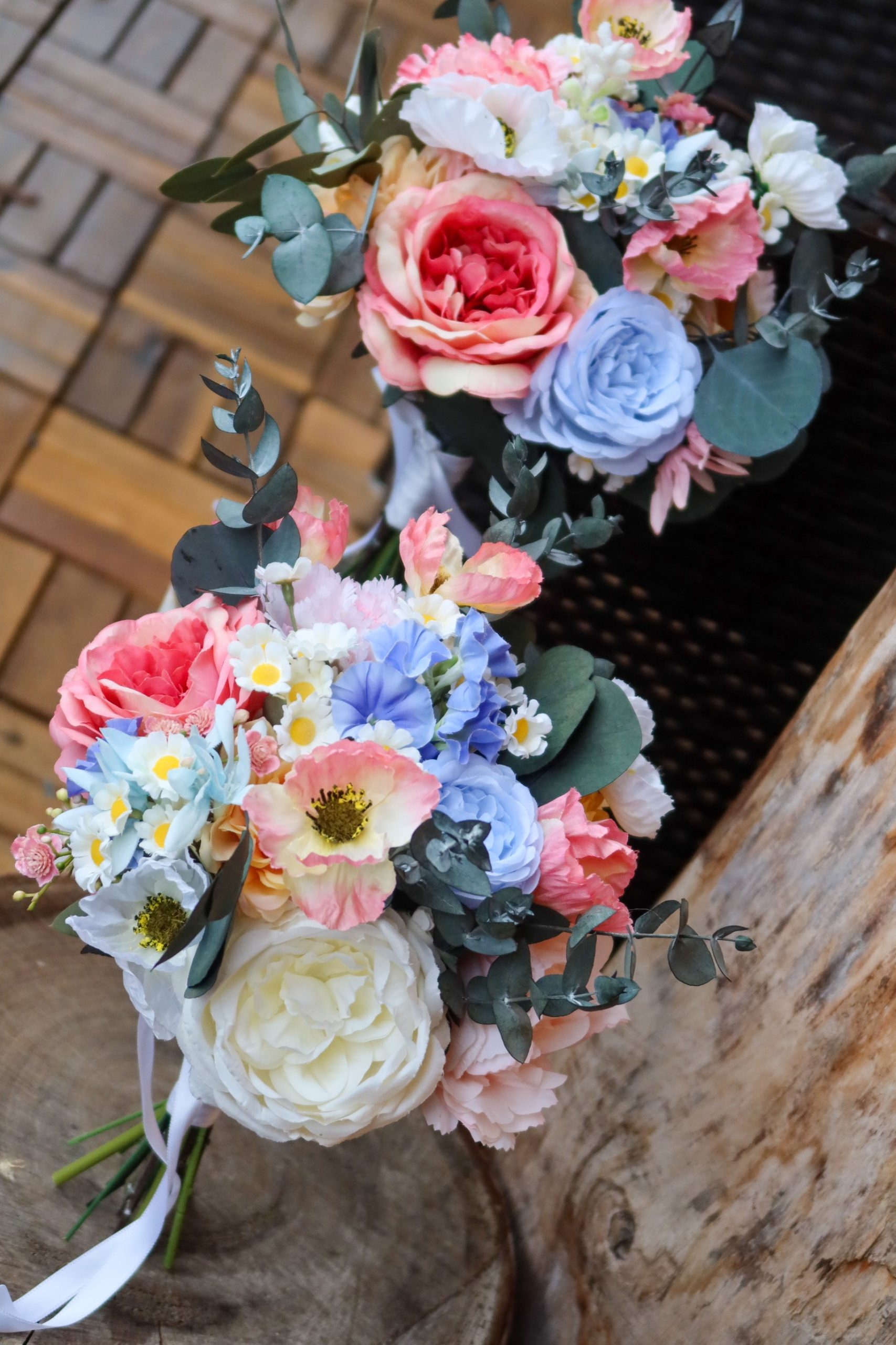 Svatební komplet na zakázku z kvalitních látkových květin, stabilizovaného eukalyptu a dalších přízdob obsahuje: