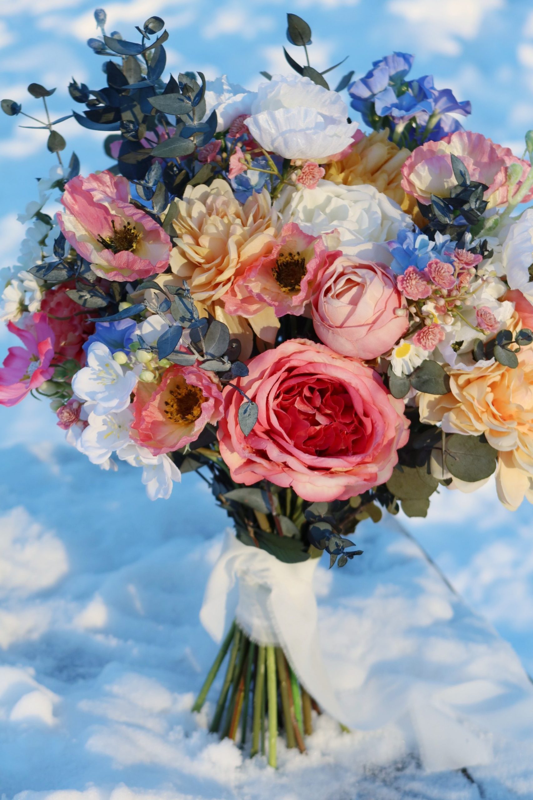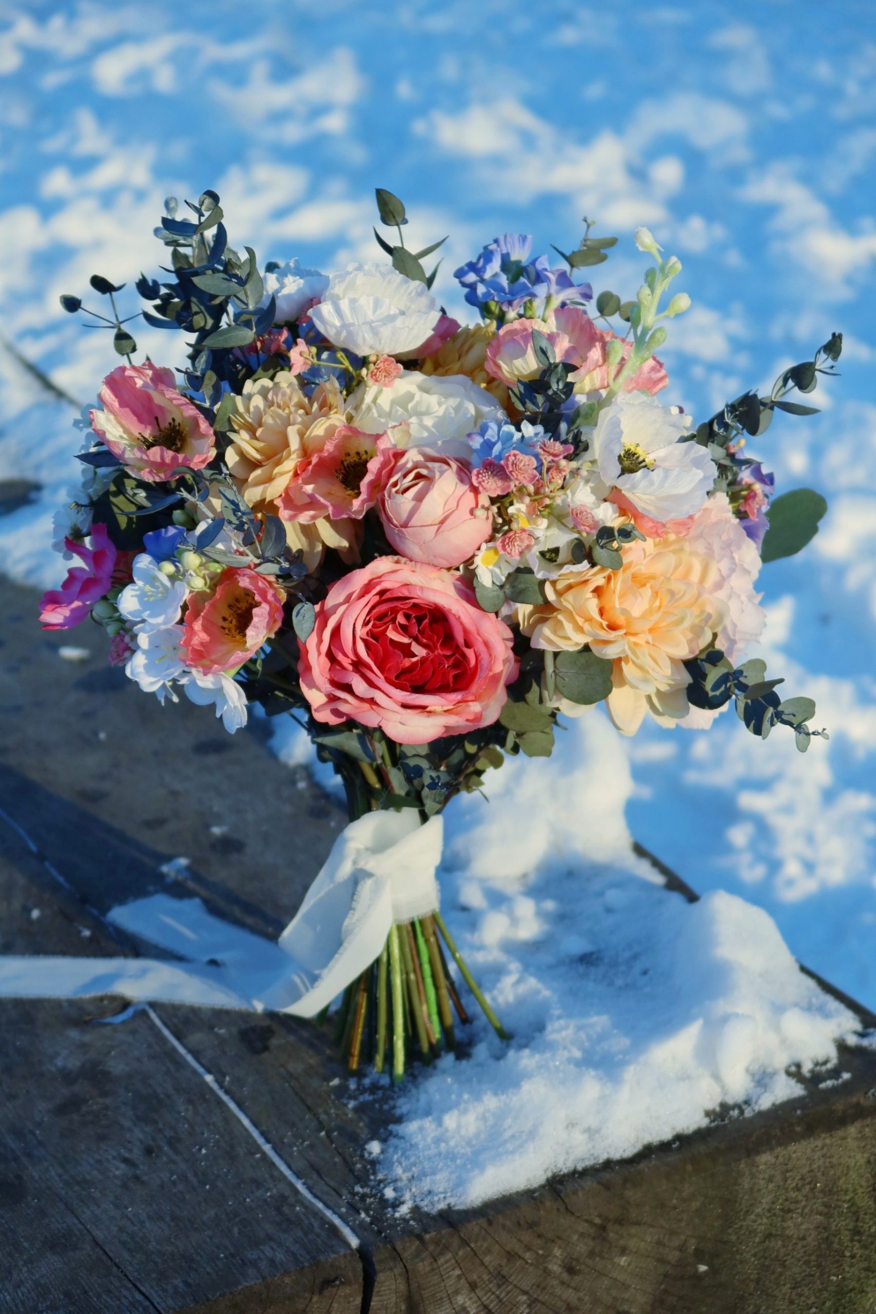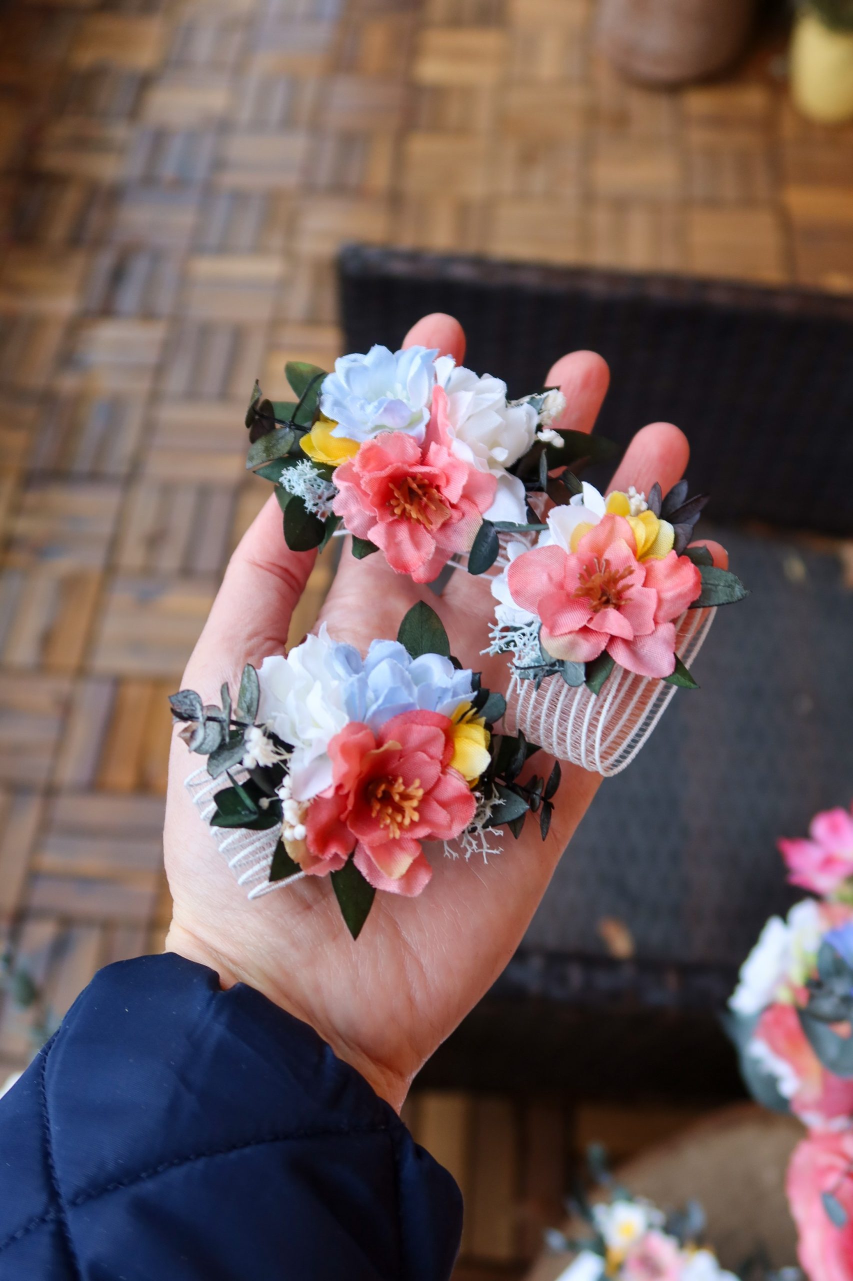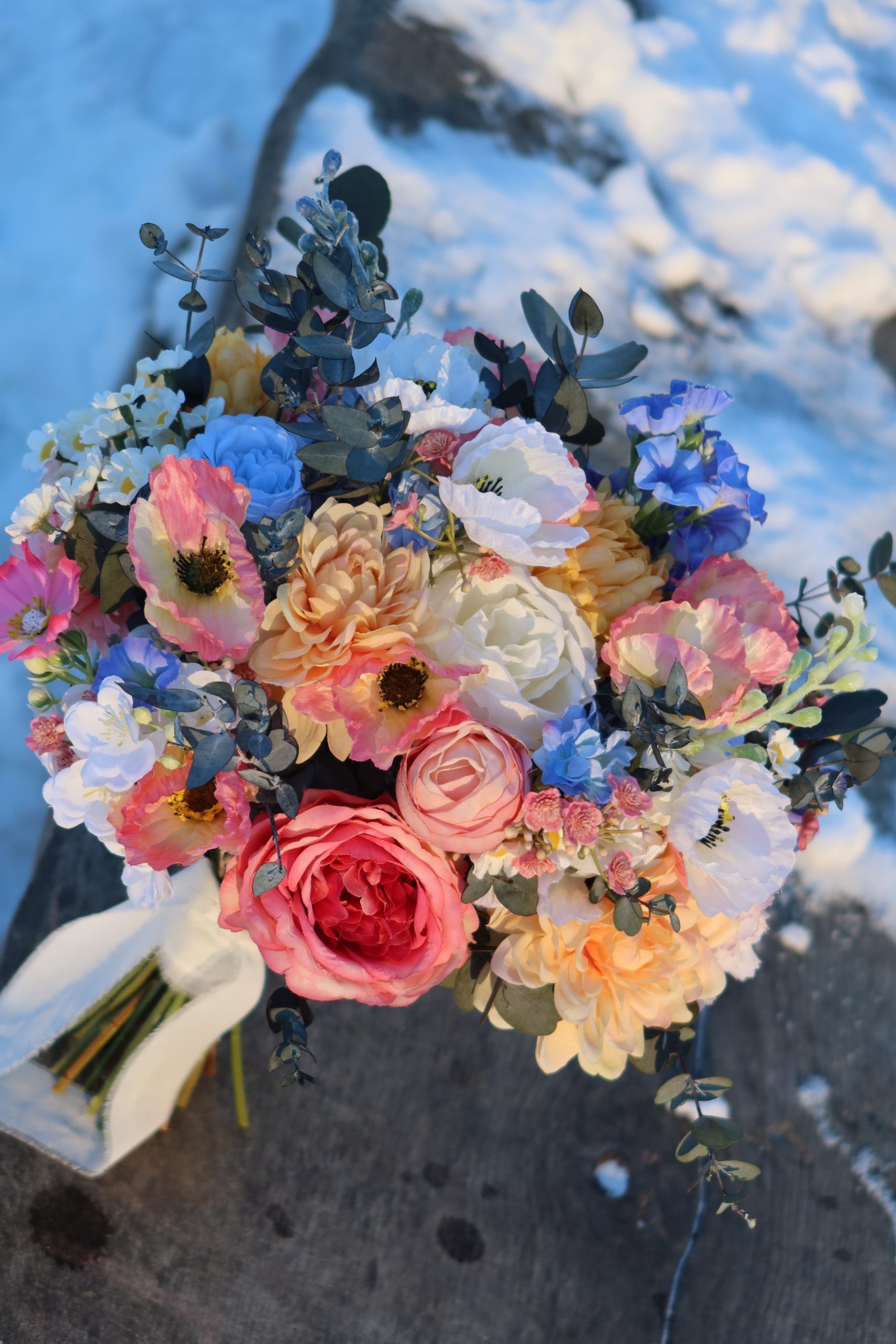 Svatební komplet na zakázku z kvalitních látkových květin, stabilizovaného eukalyptu a dalších přízdob obsahuje: