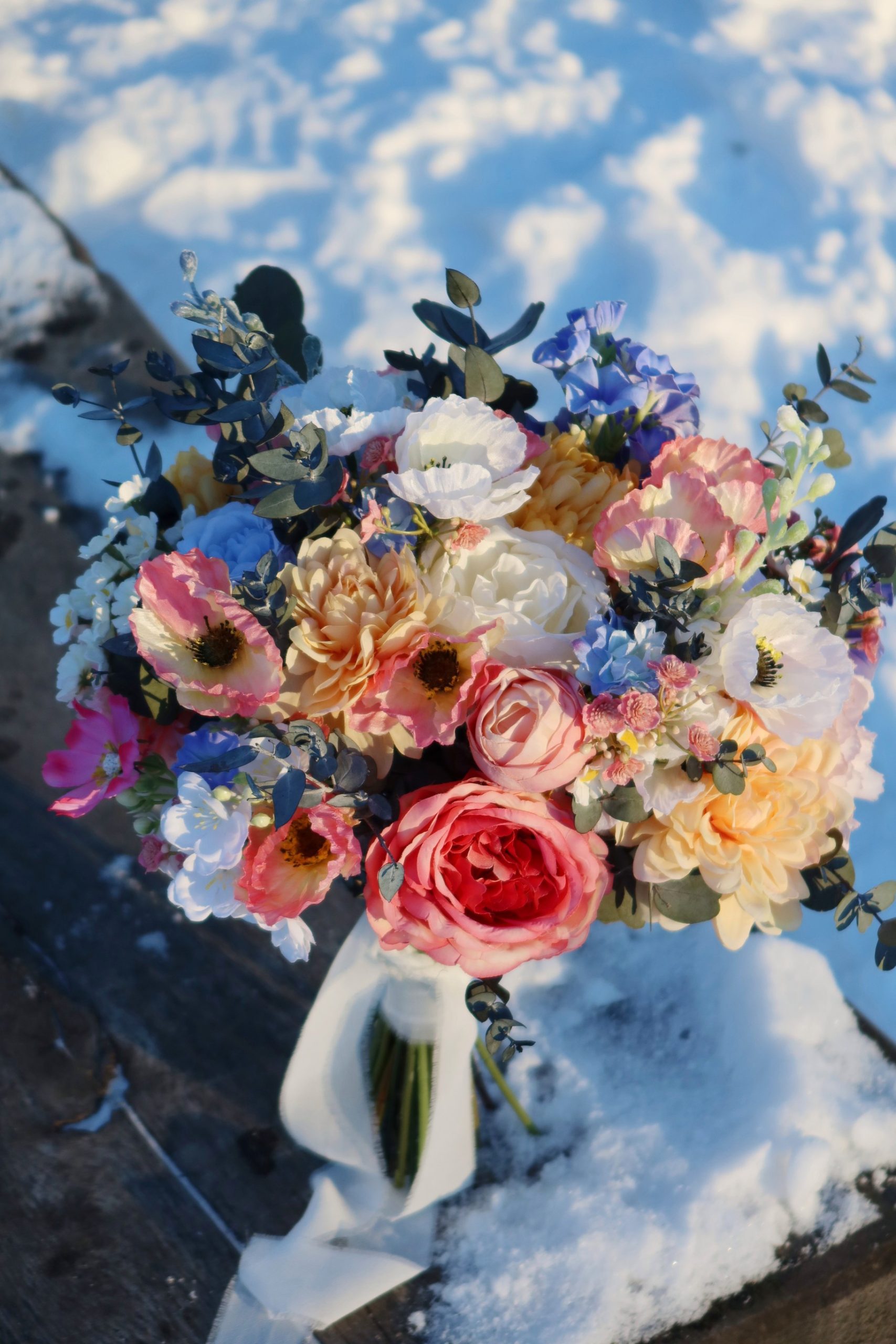 – 1x svatební kytice, průměr cca 30 cm, cena 2500