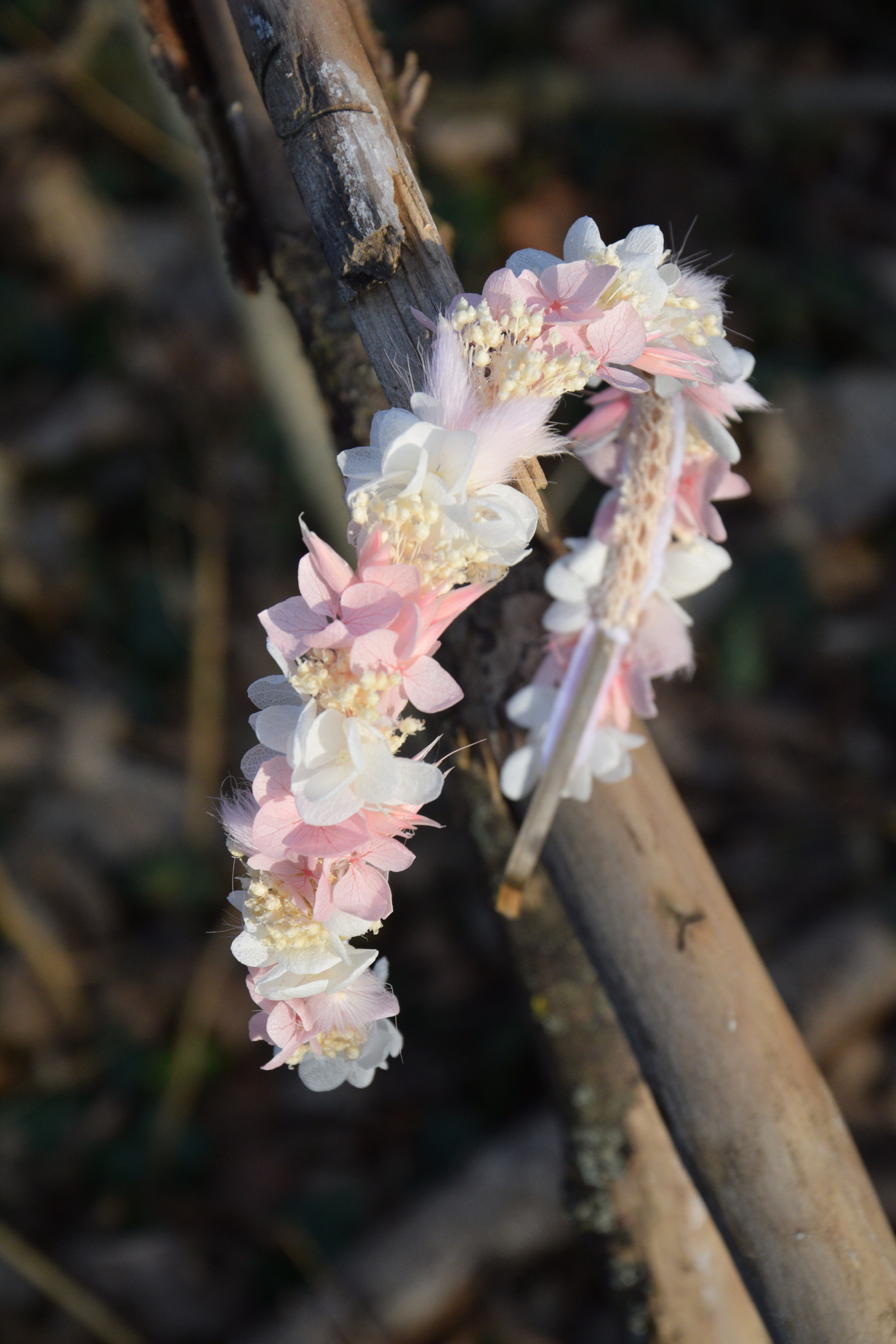 Něžná čelenka na zlatém kovovém základu zdobená stabilizovanými hortenziemi a dalšími přírodními přízdobami.