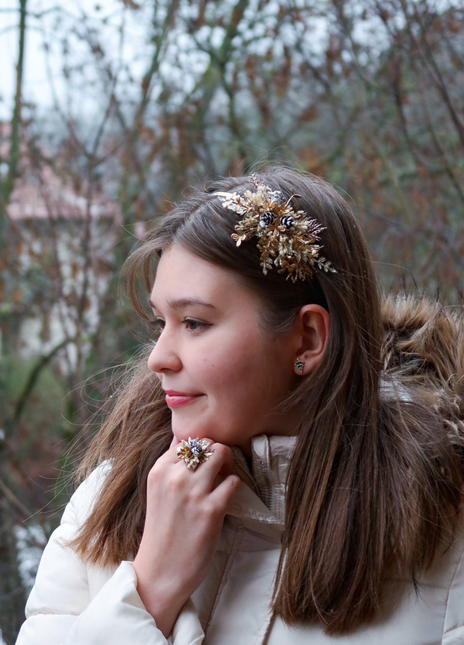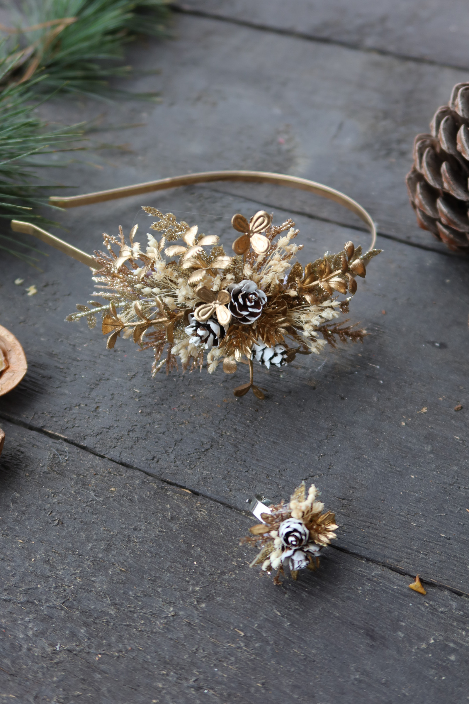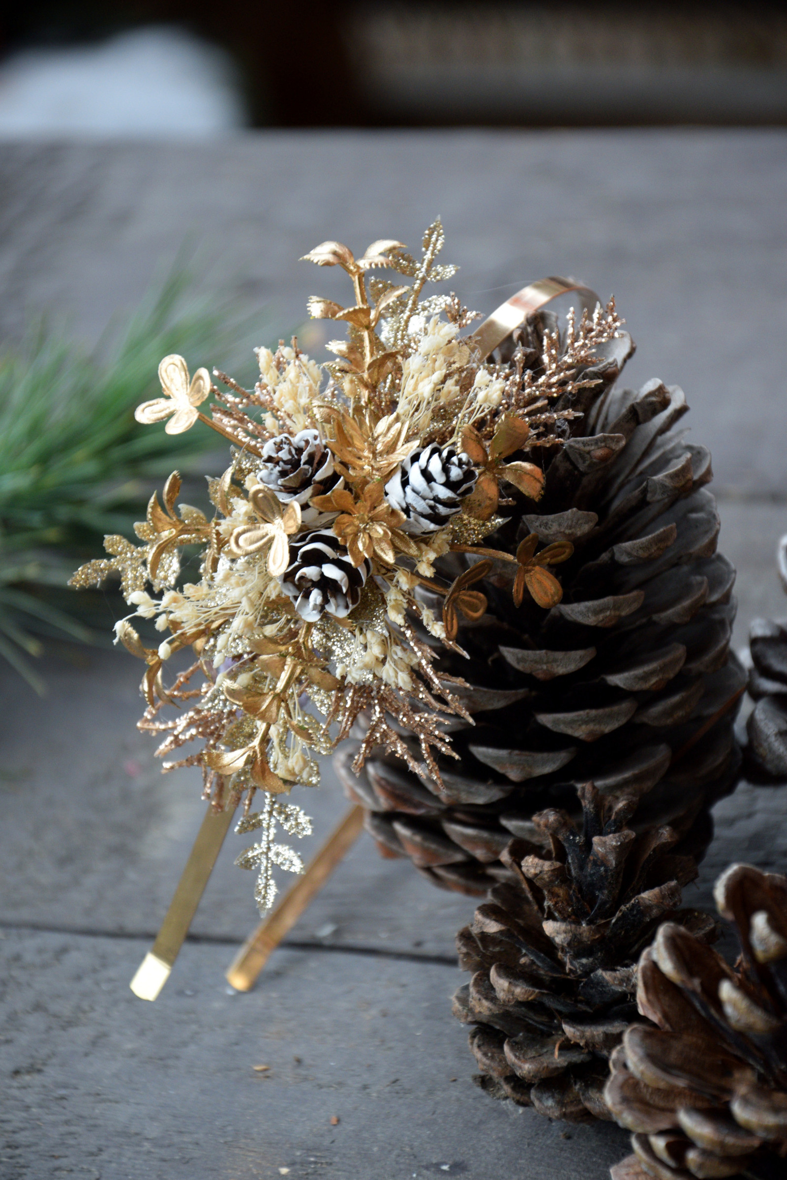 Sváteční čelenka na zlatém kovovém základu zdobená zlatými třpytivými přízdobami, zasněženými šiškami aj.