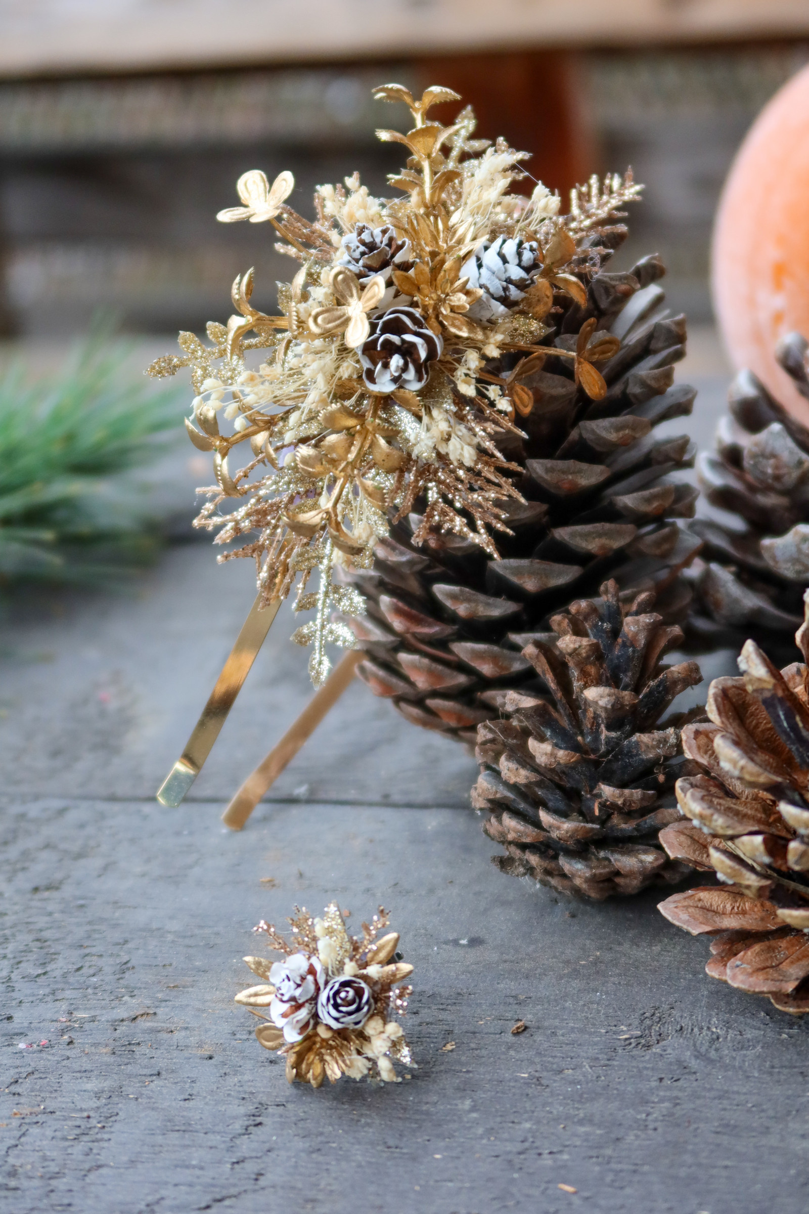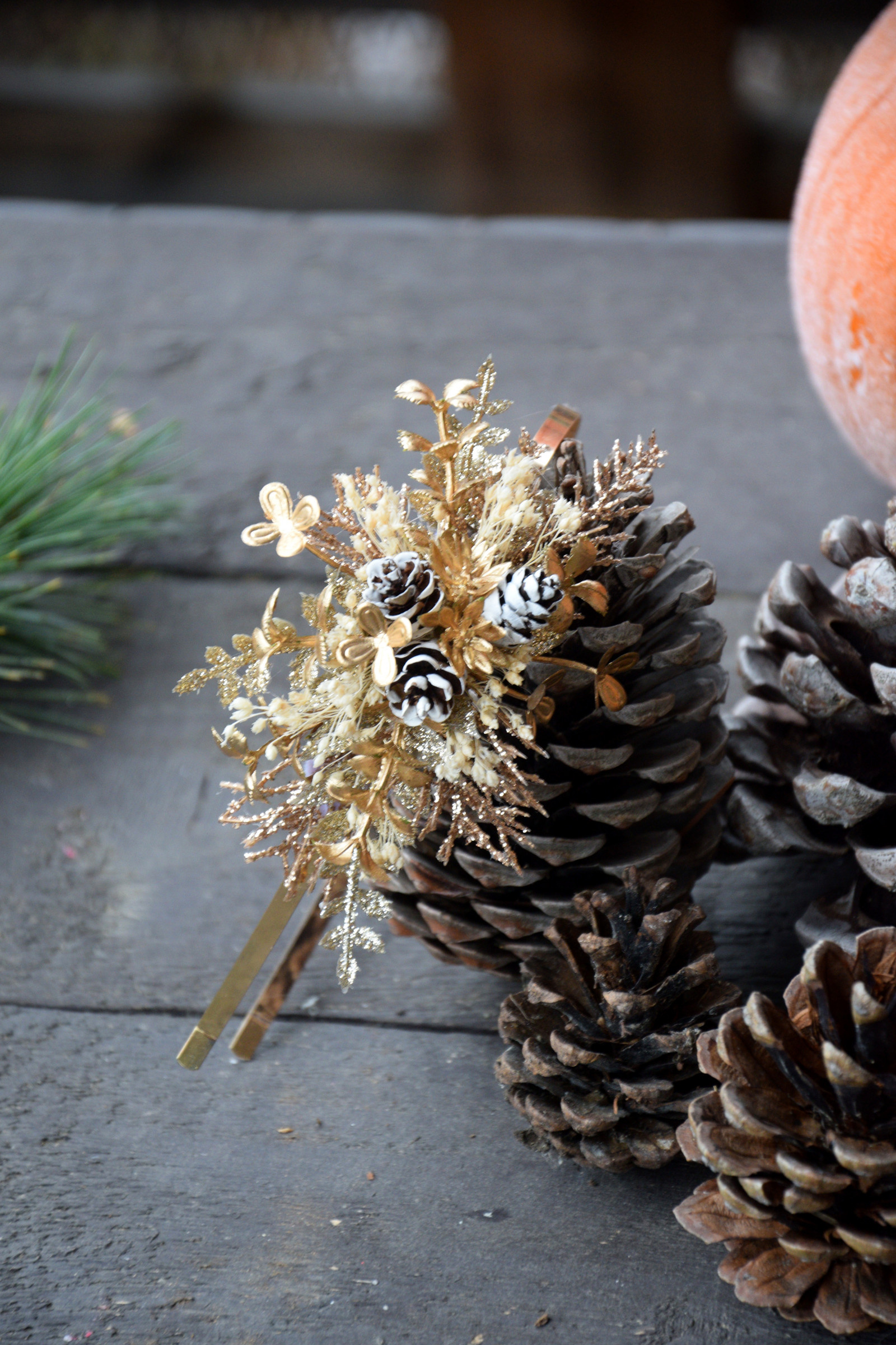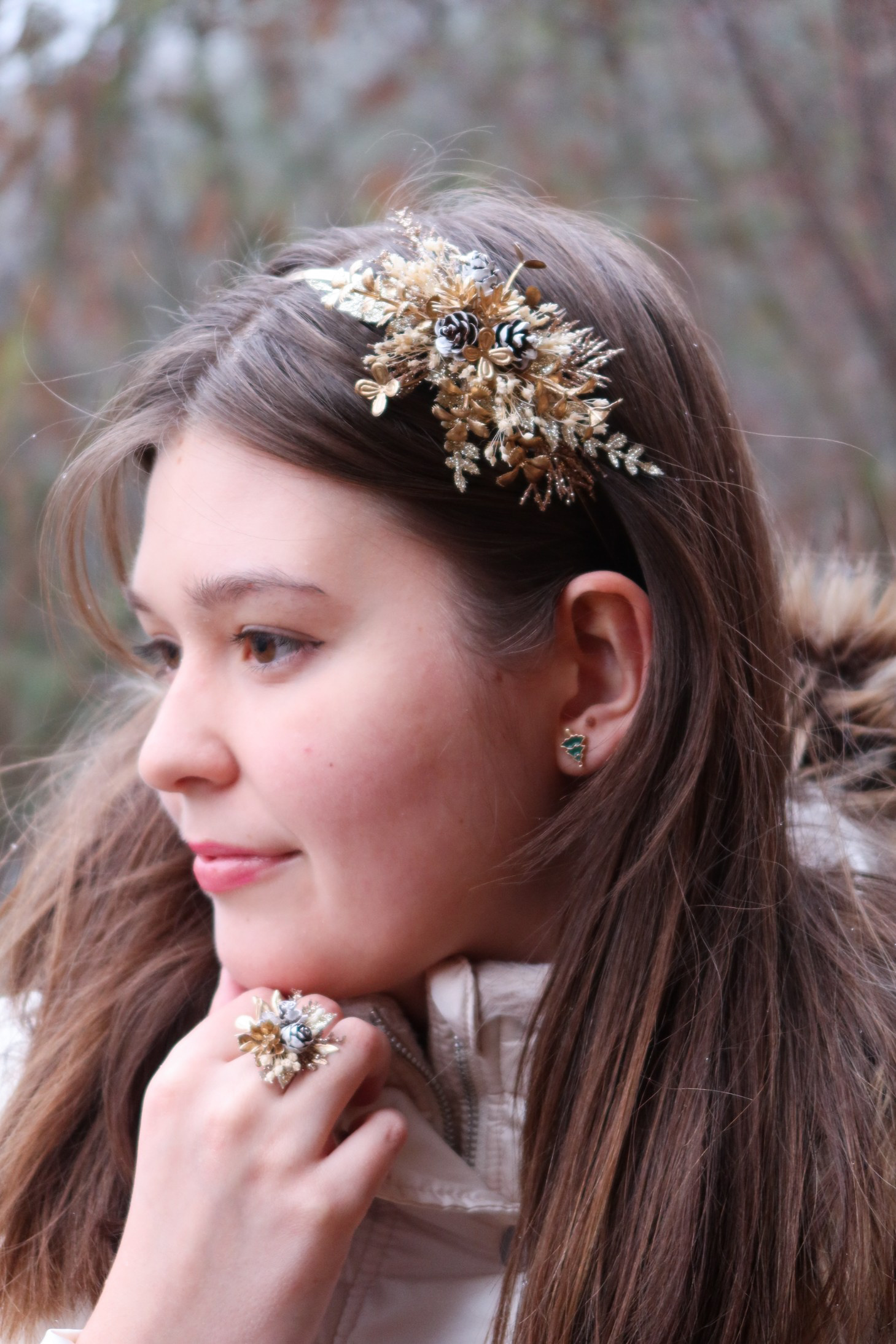 Sváteční čelenka na zlatém kovovém základu zdobená zlatými třpytivými přízdobami, zasněženými šiškami aj.