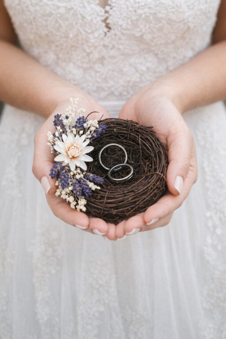 Přírodní hnízdečko na snubní prstýnky. Průměr cca 8 cm.