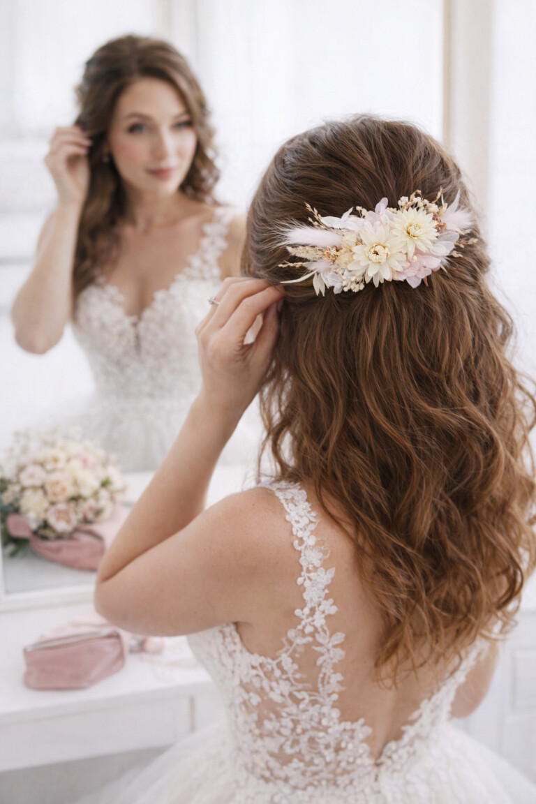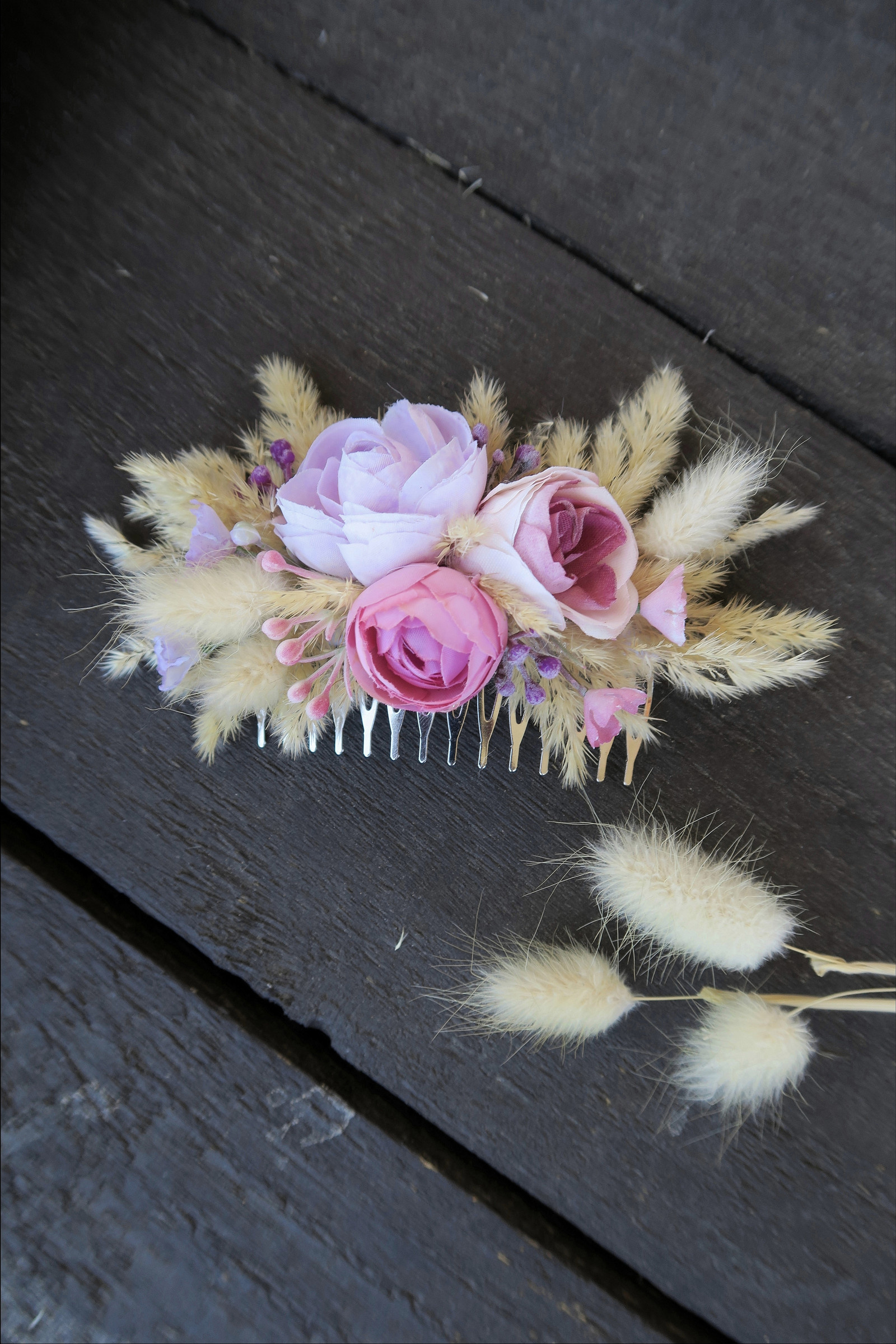 Květinový hřebínek na kovovém základu zdobený textilními kytičkami a dalšími umělými a přírodními přízdobami.