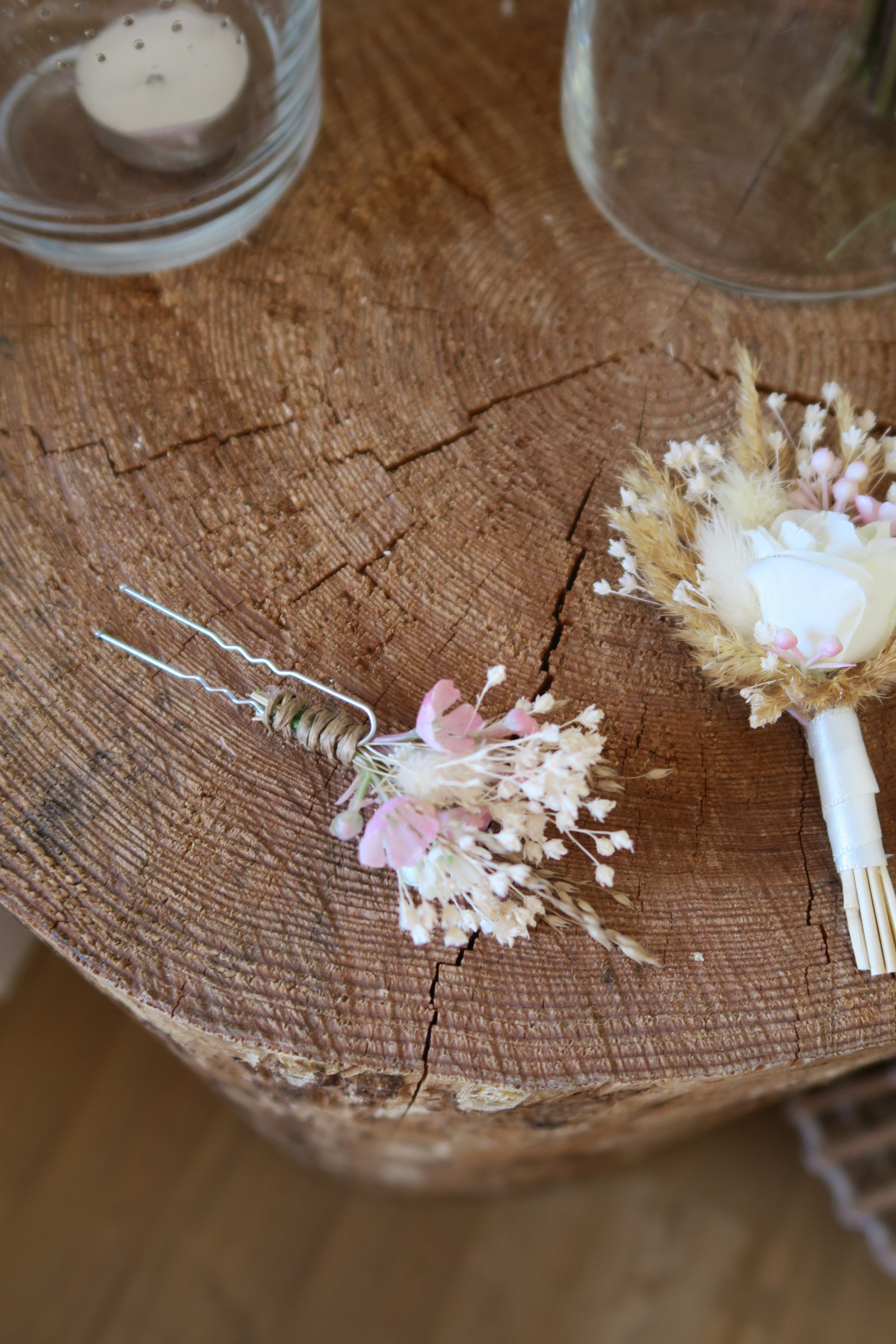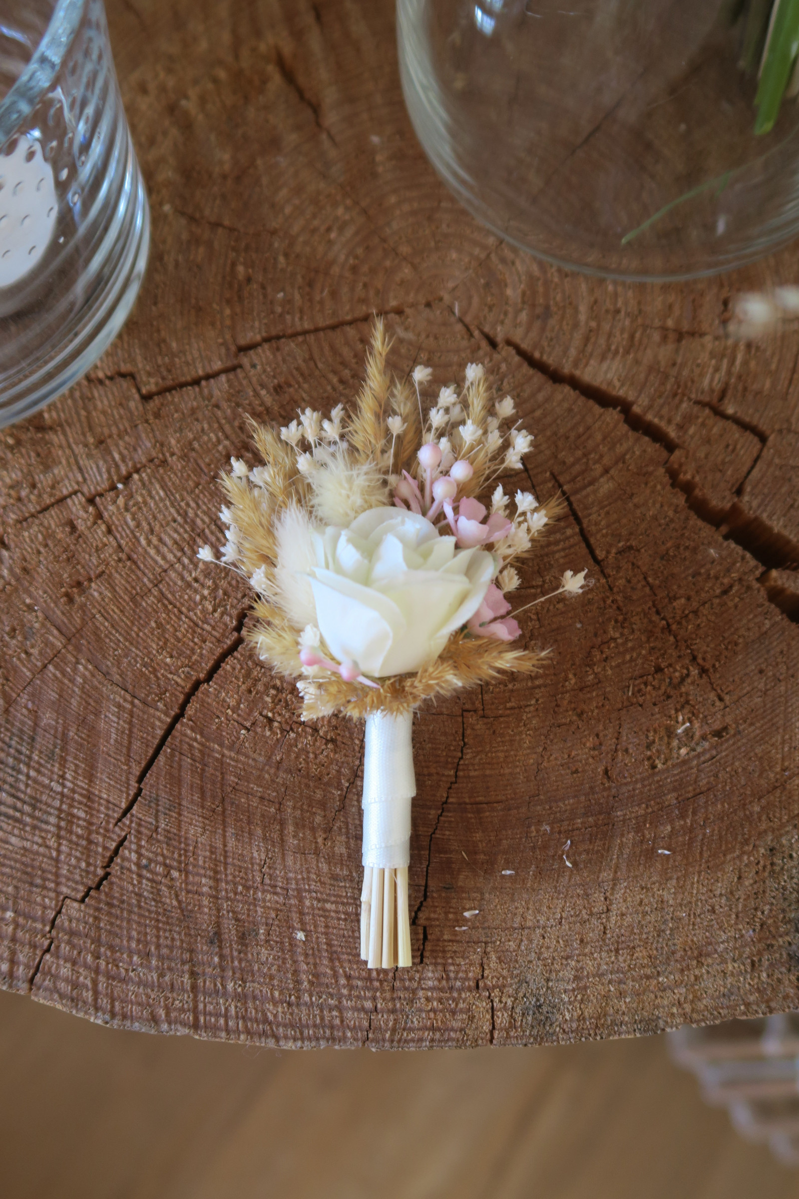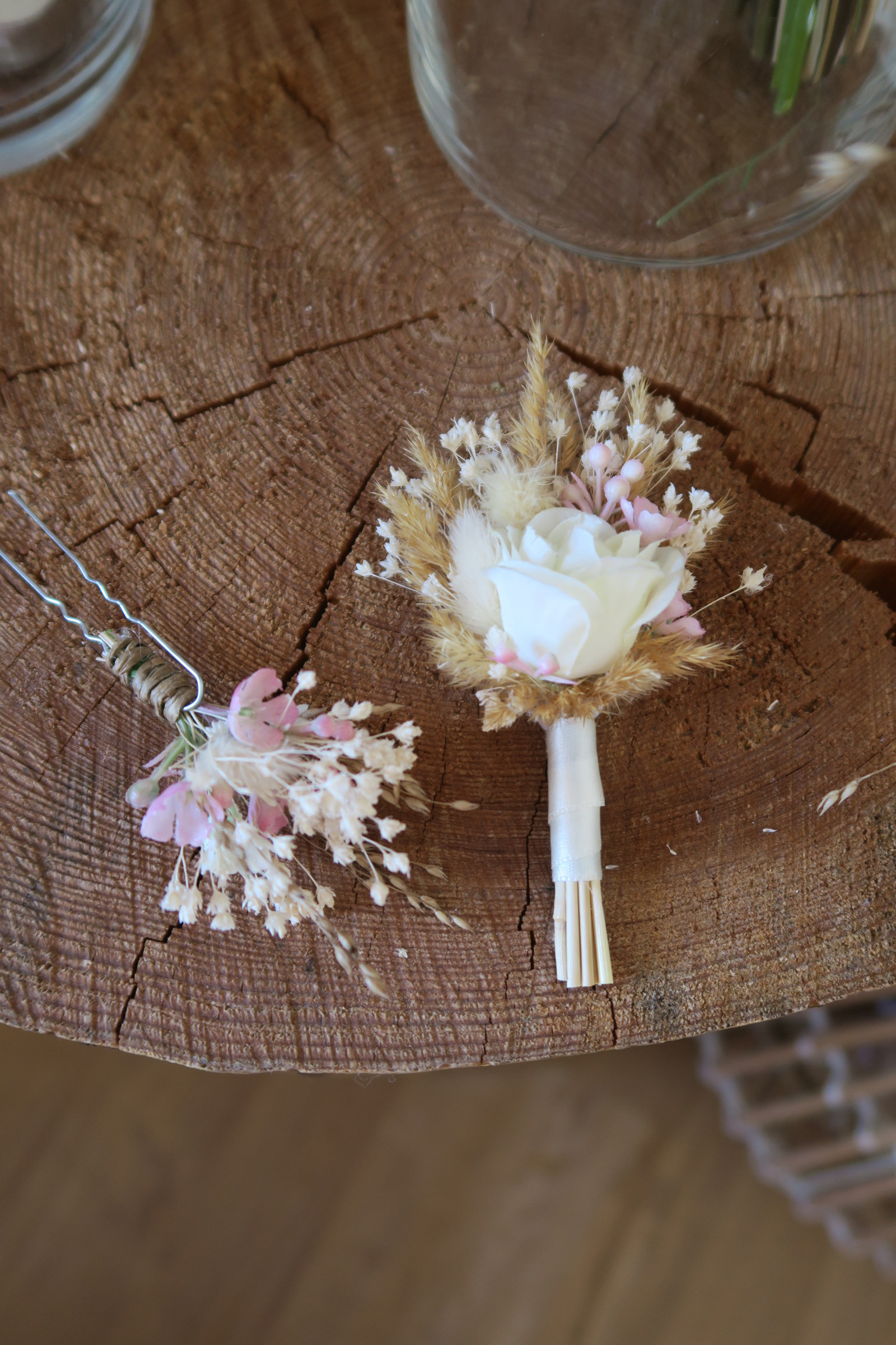 Květinová korsáž. Součástí je floristická pomůcka pro snadné přichycení na oděv. Na objednání.