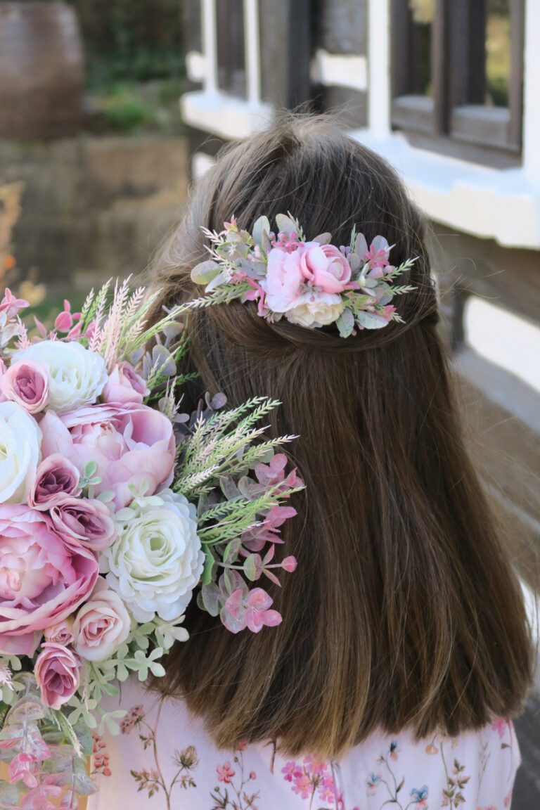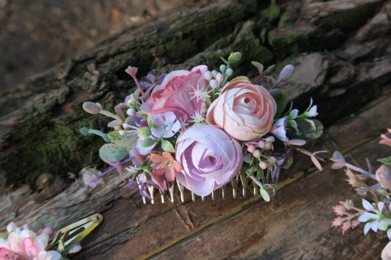 Květinový hřebínek na kovovém základu zdobený textilními kytičkami a dalšími přízdobami.
