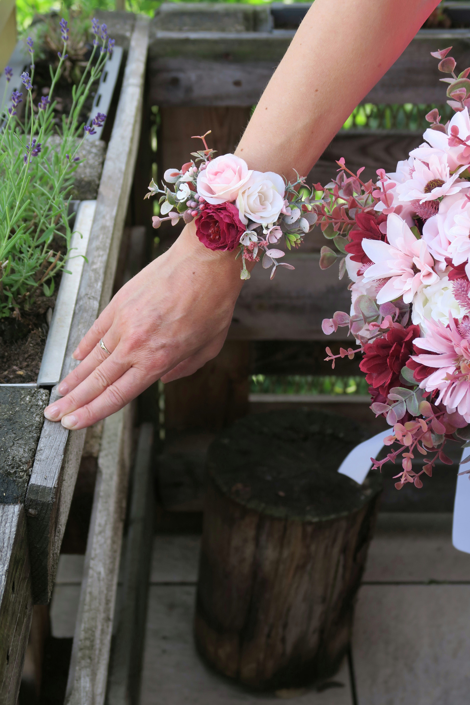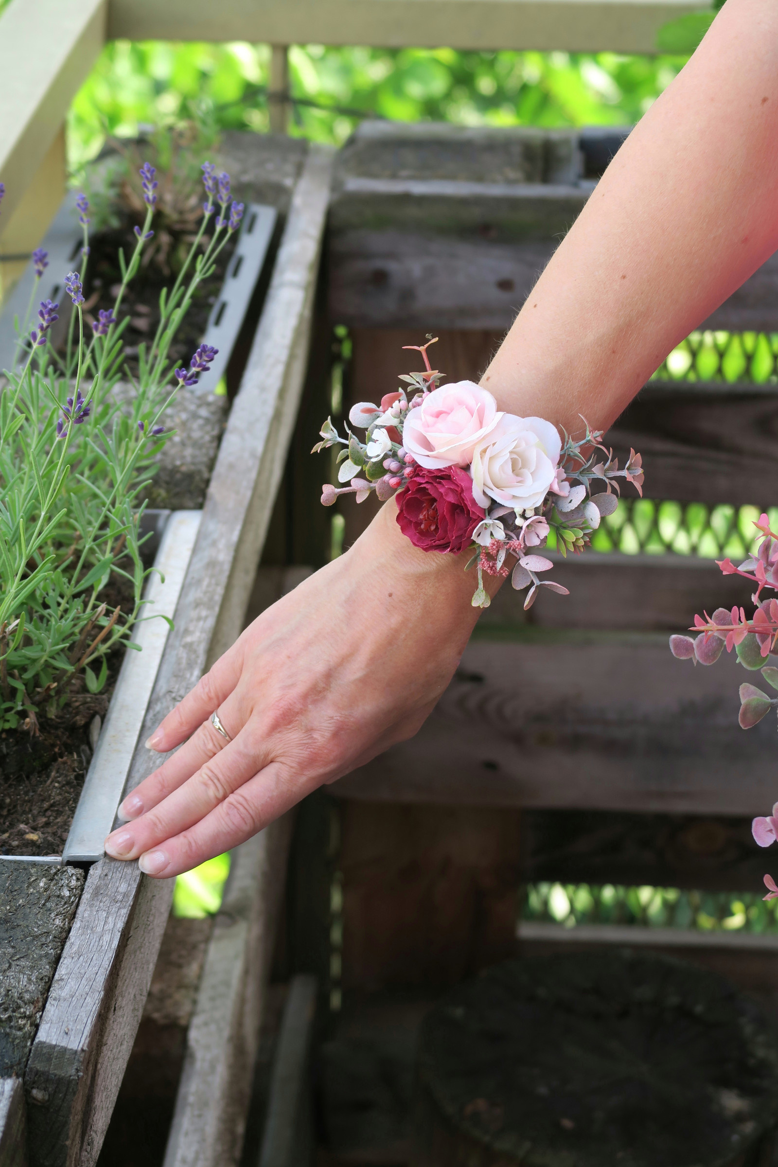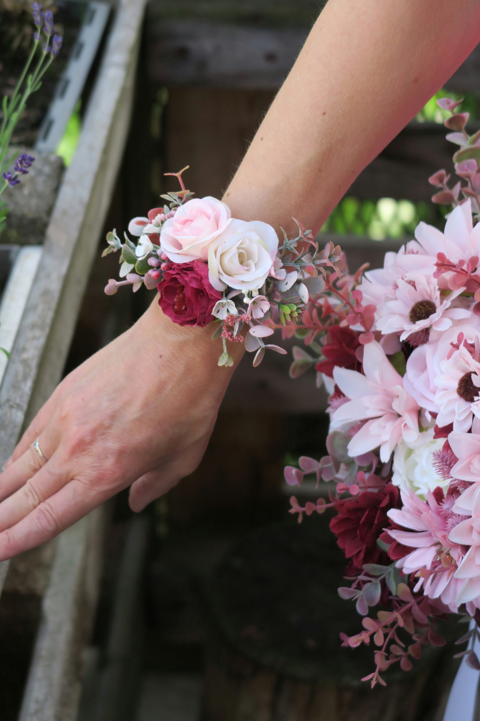 Květinový náramek na elastické pružence zdobený textilními kytičkami a dalšími přízdobami.