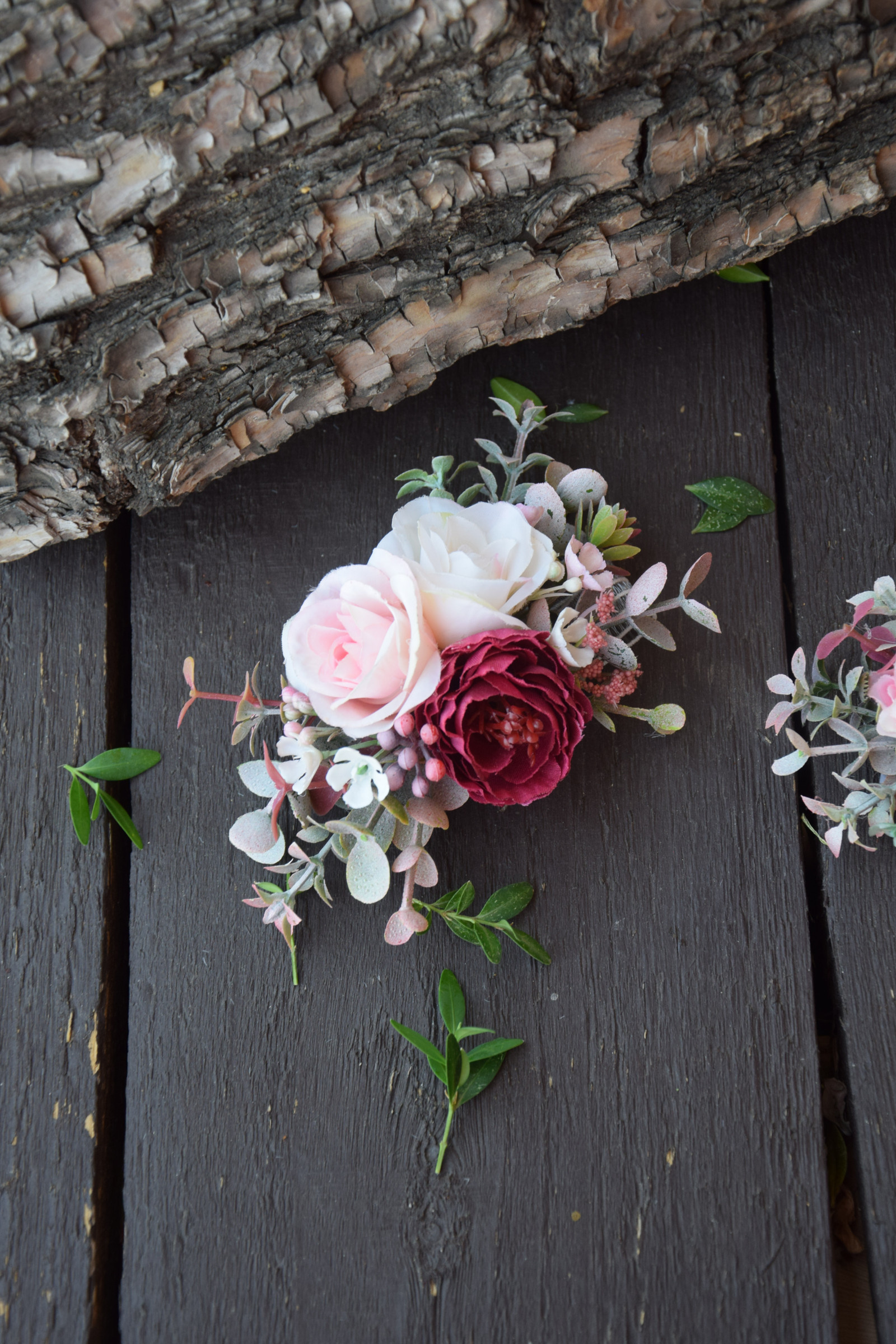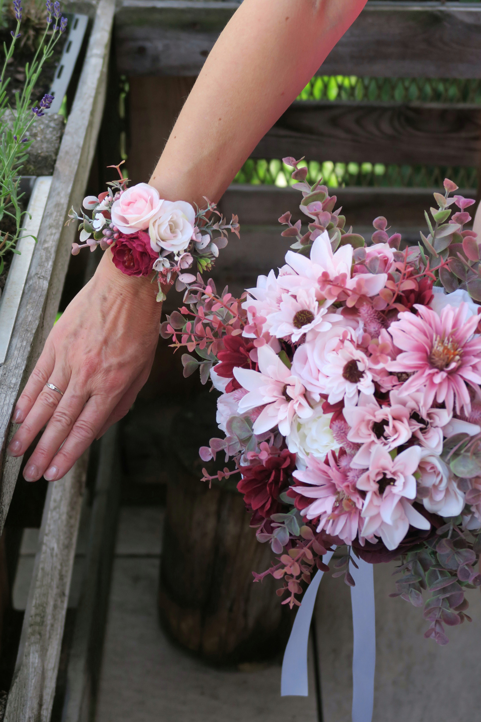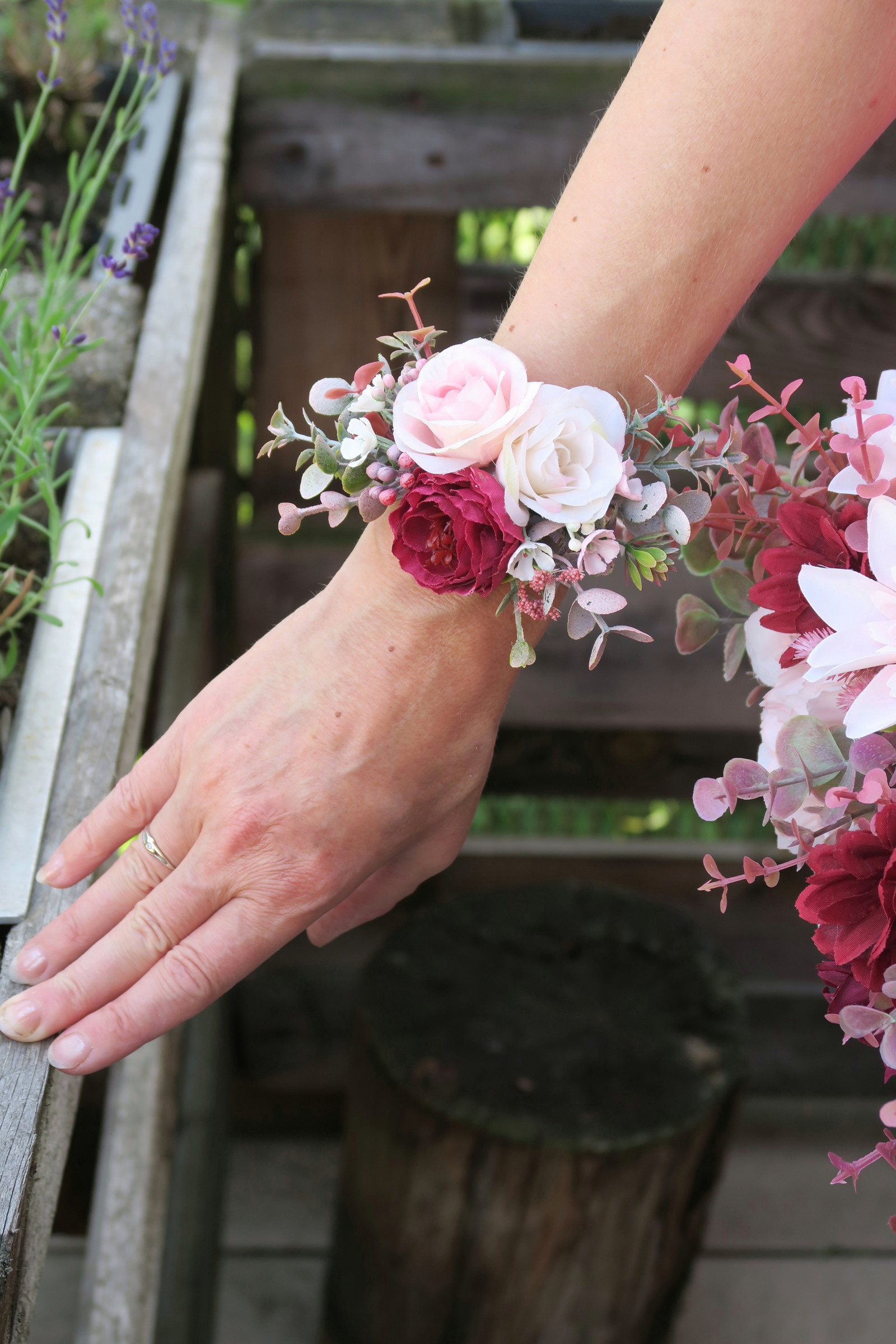 Květinový náramek na elastické pružence zdobený textilními kytičkami a dalšími přízdobami.