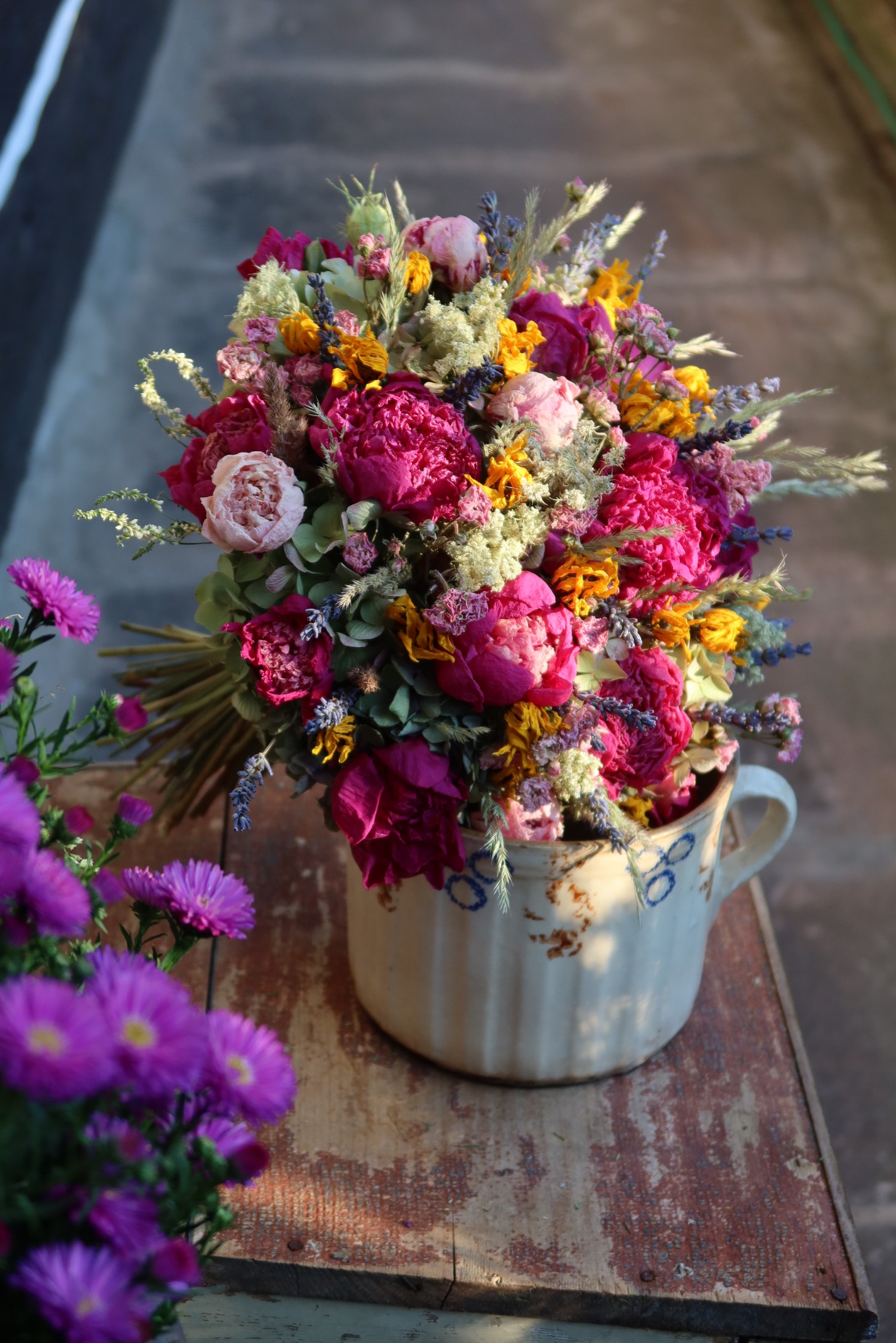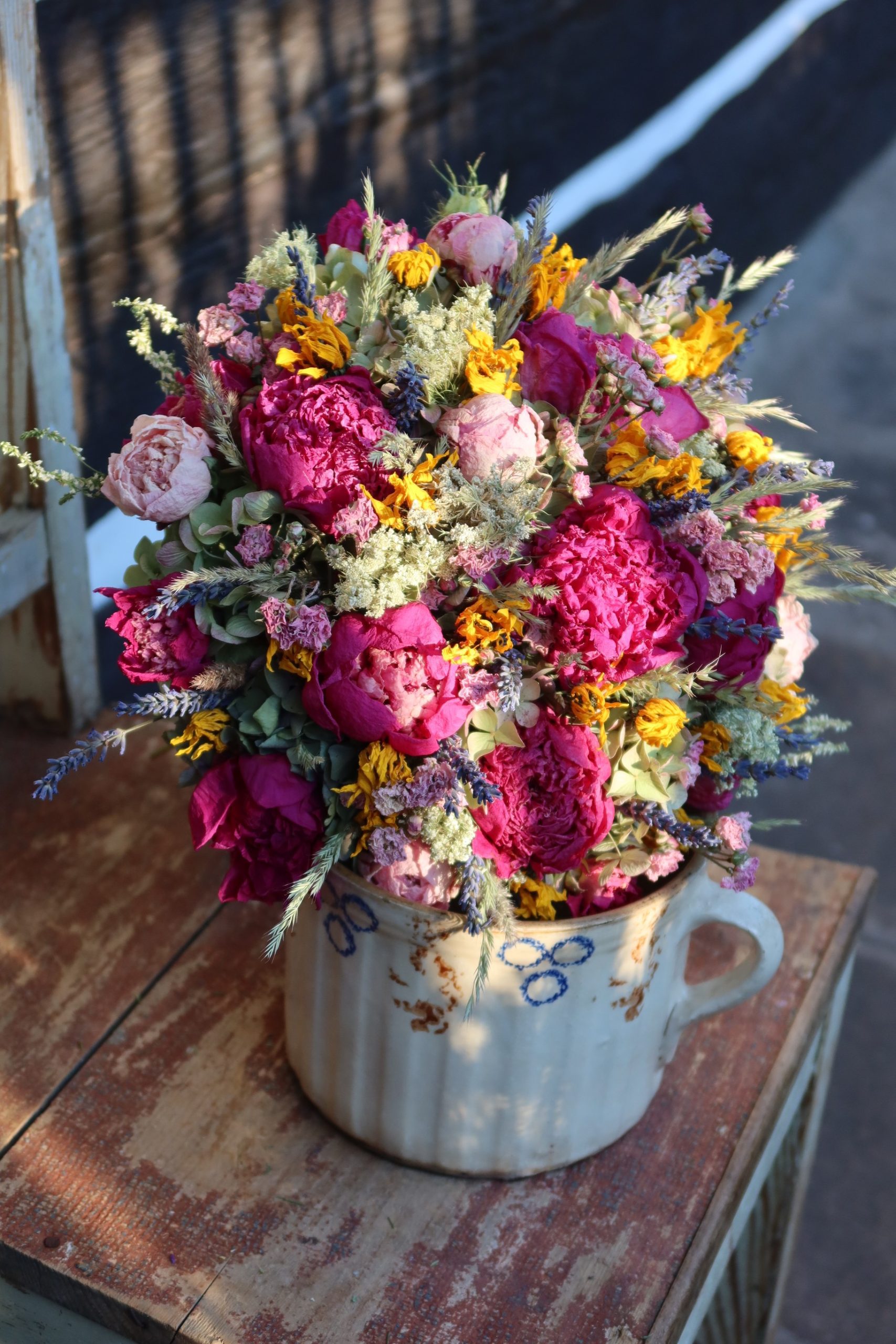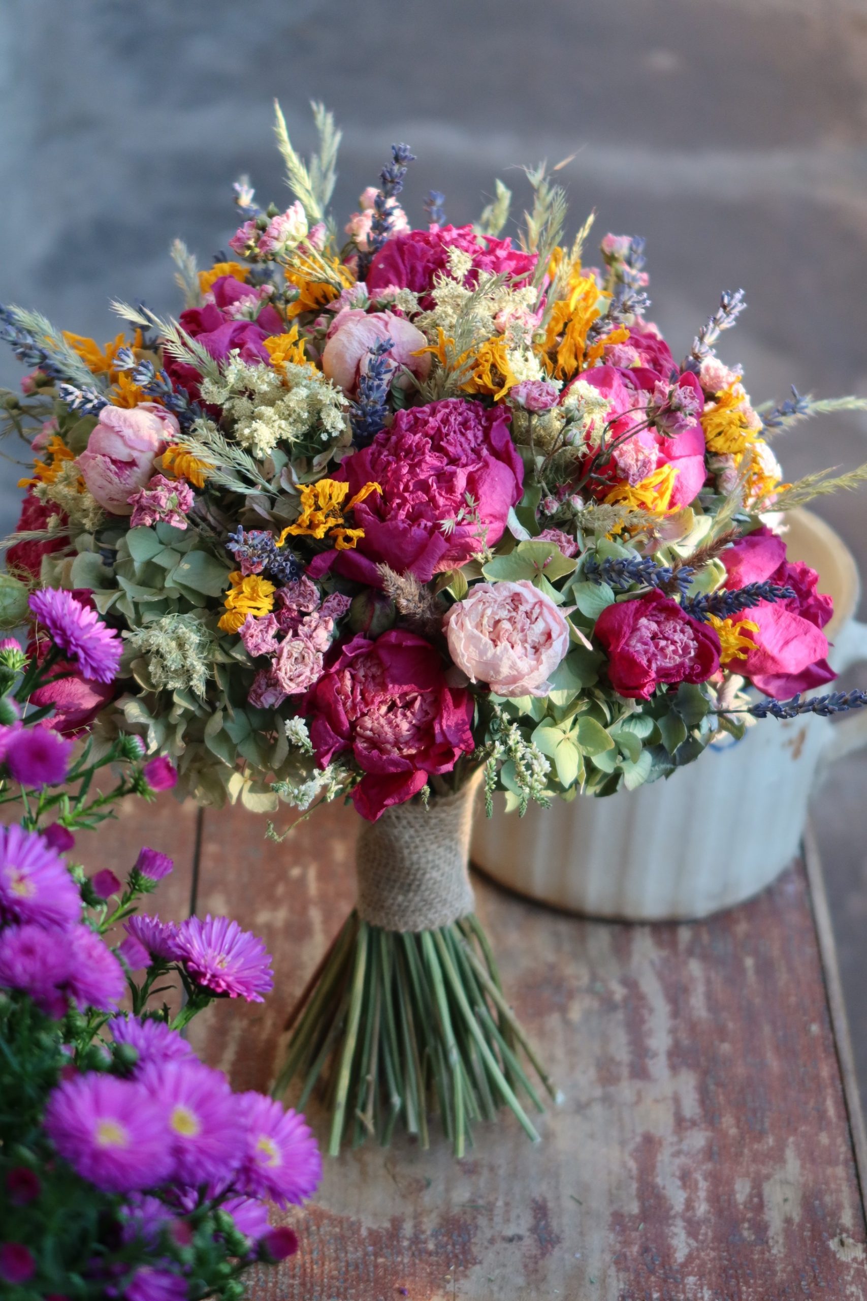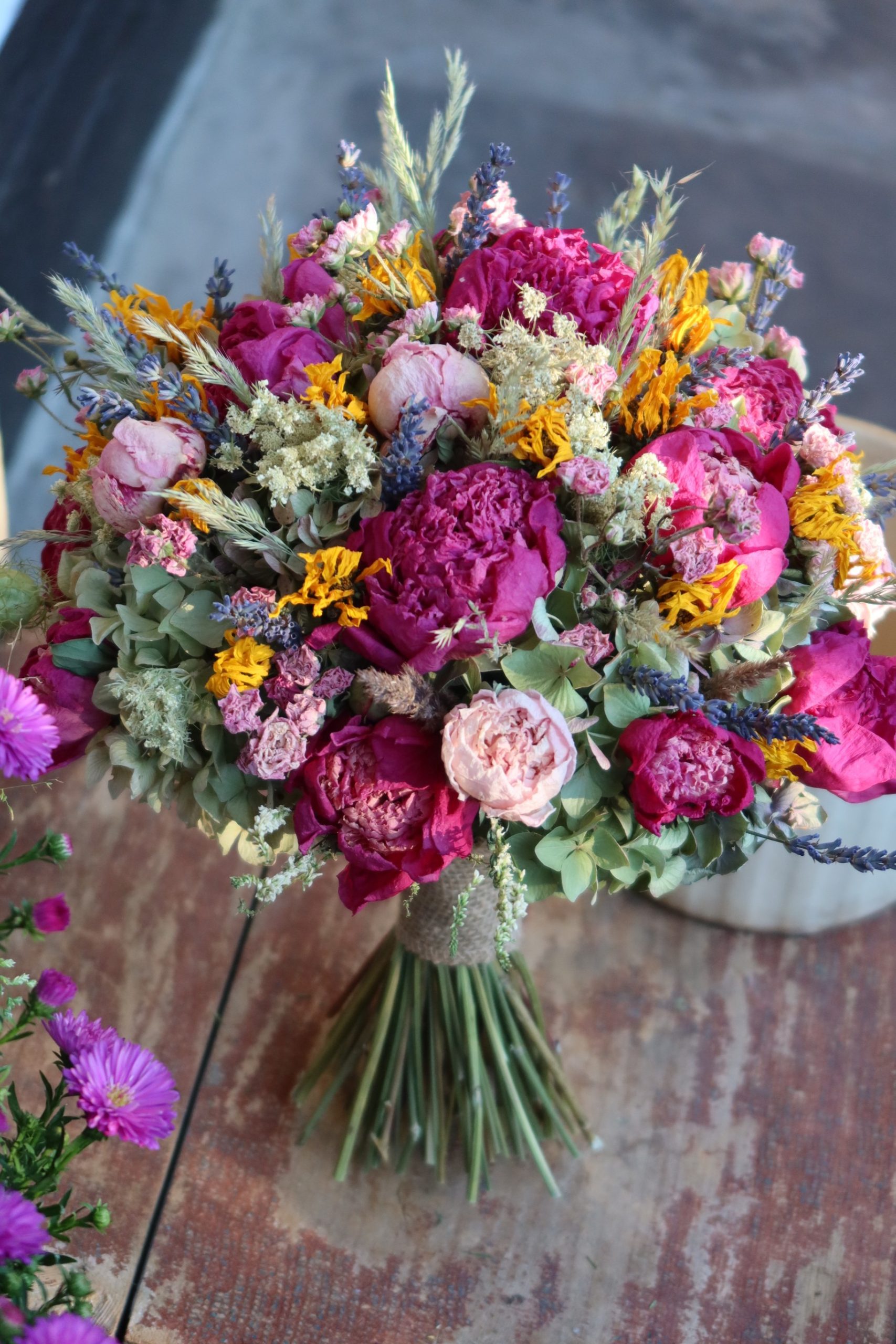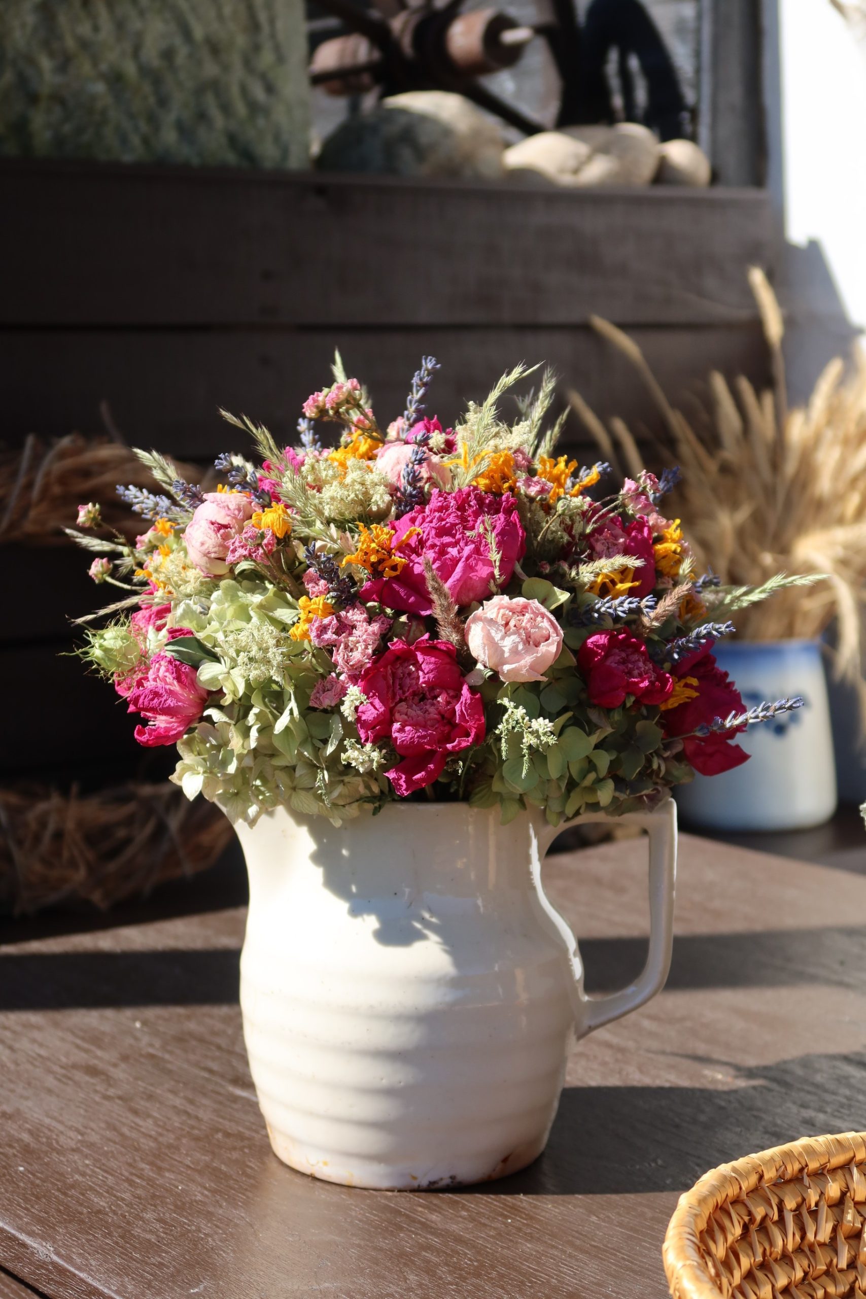 Dekorační vonička ze sušených kytiček z Podkrkonoší. Jutová stuha.