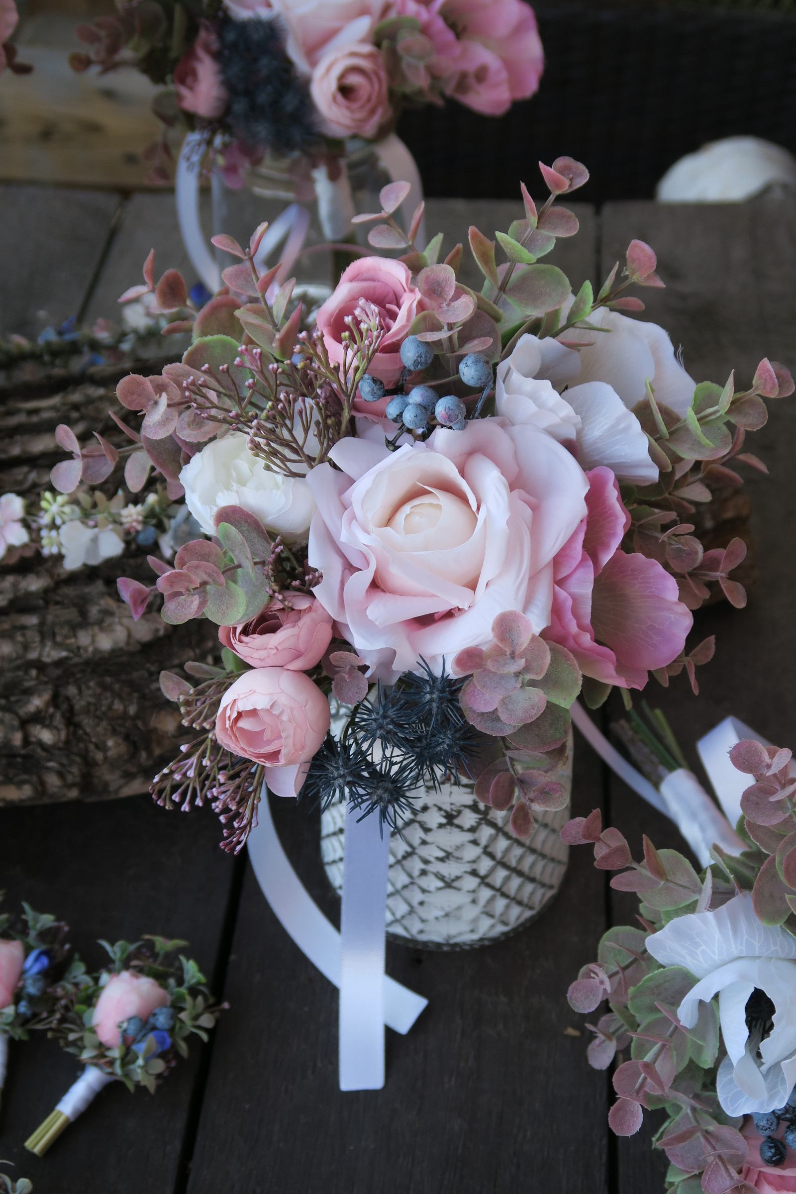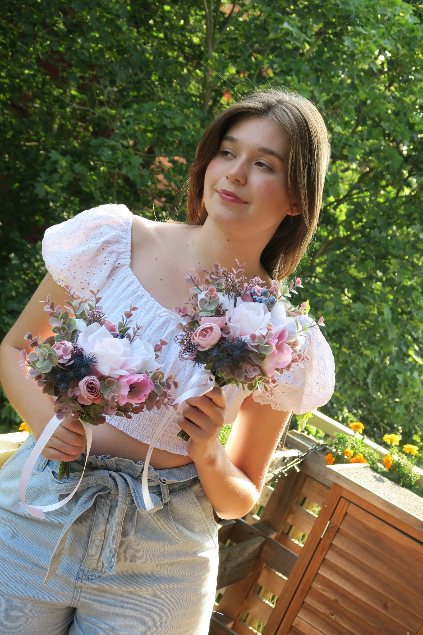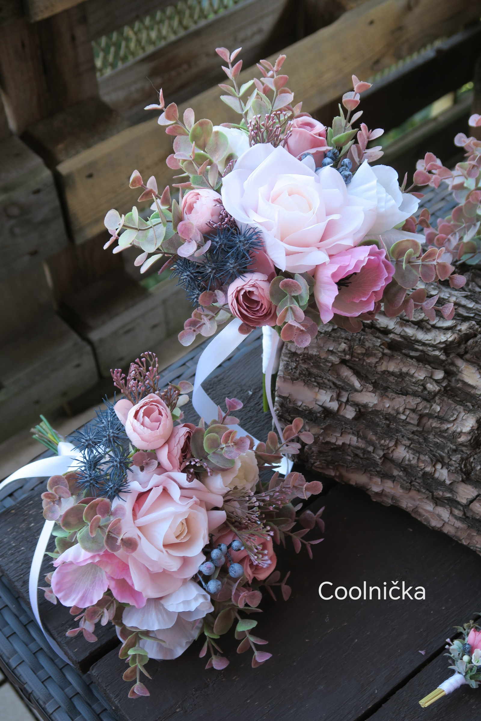 Menší kytička z kvalitních látkových květin a různých přízdob. Stuha bílé barvy.