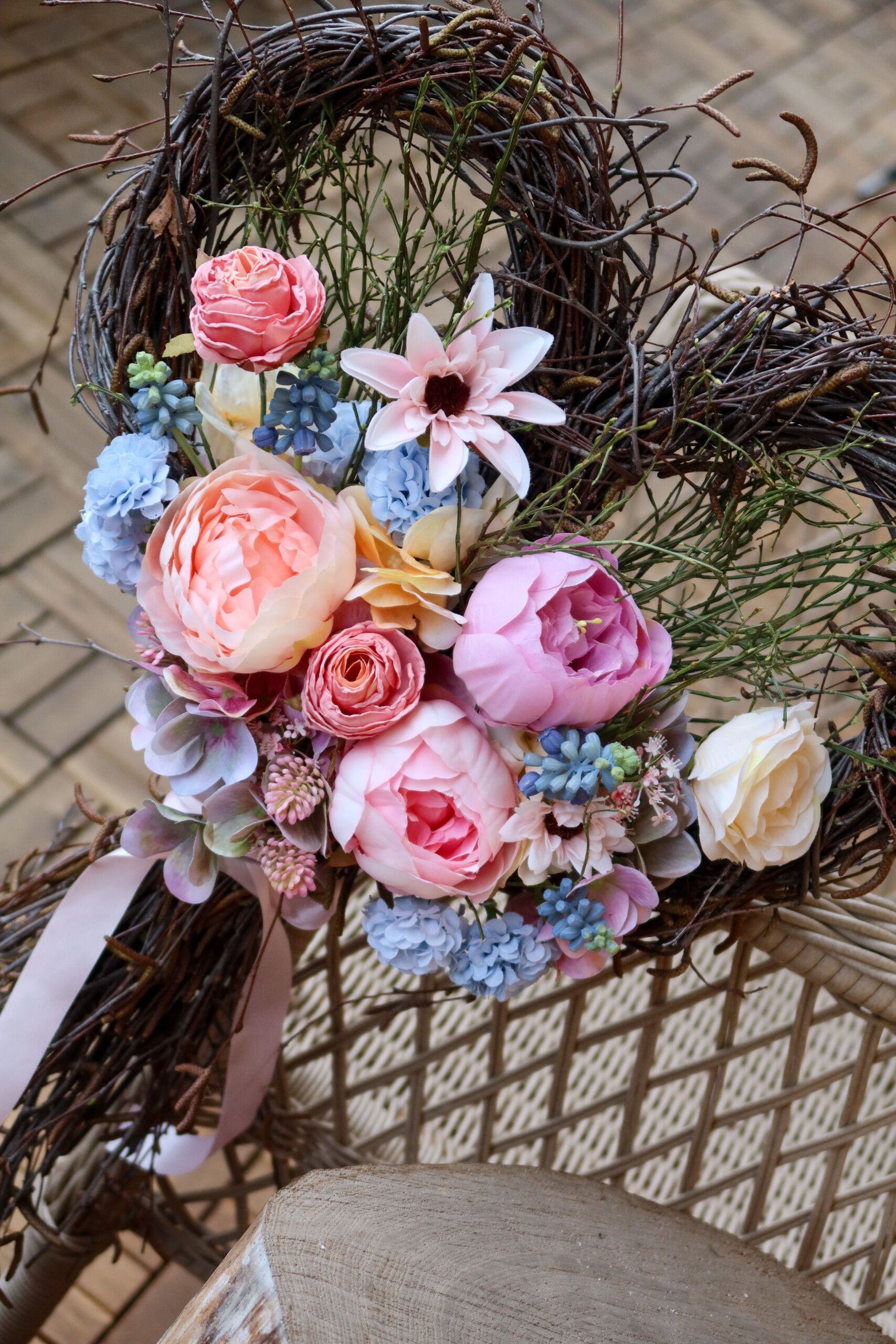 Ručně pletený proutěný základ, všechny přízdoby ručně lepeny.