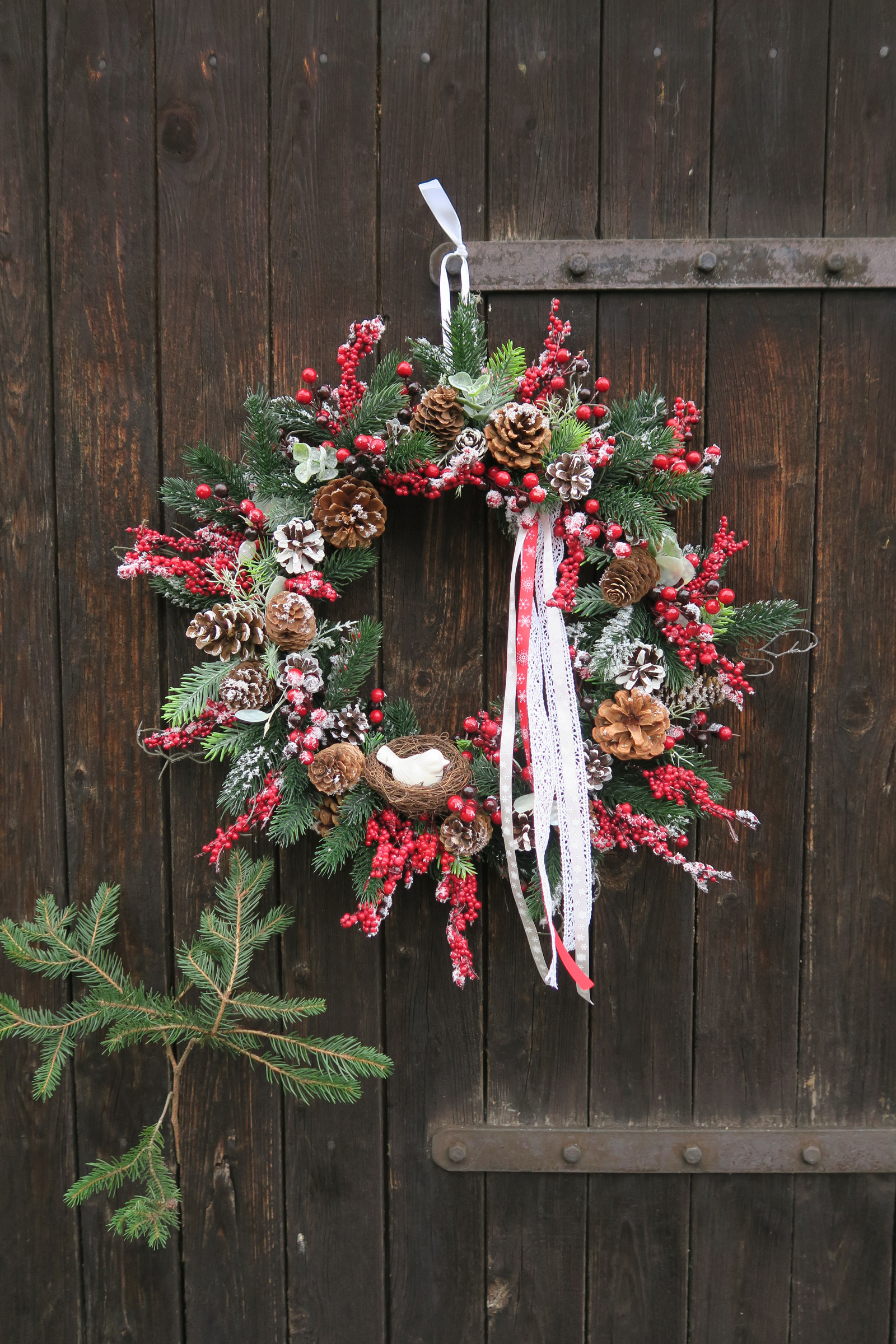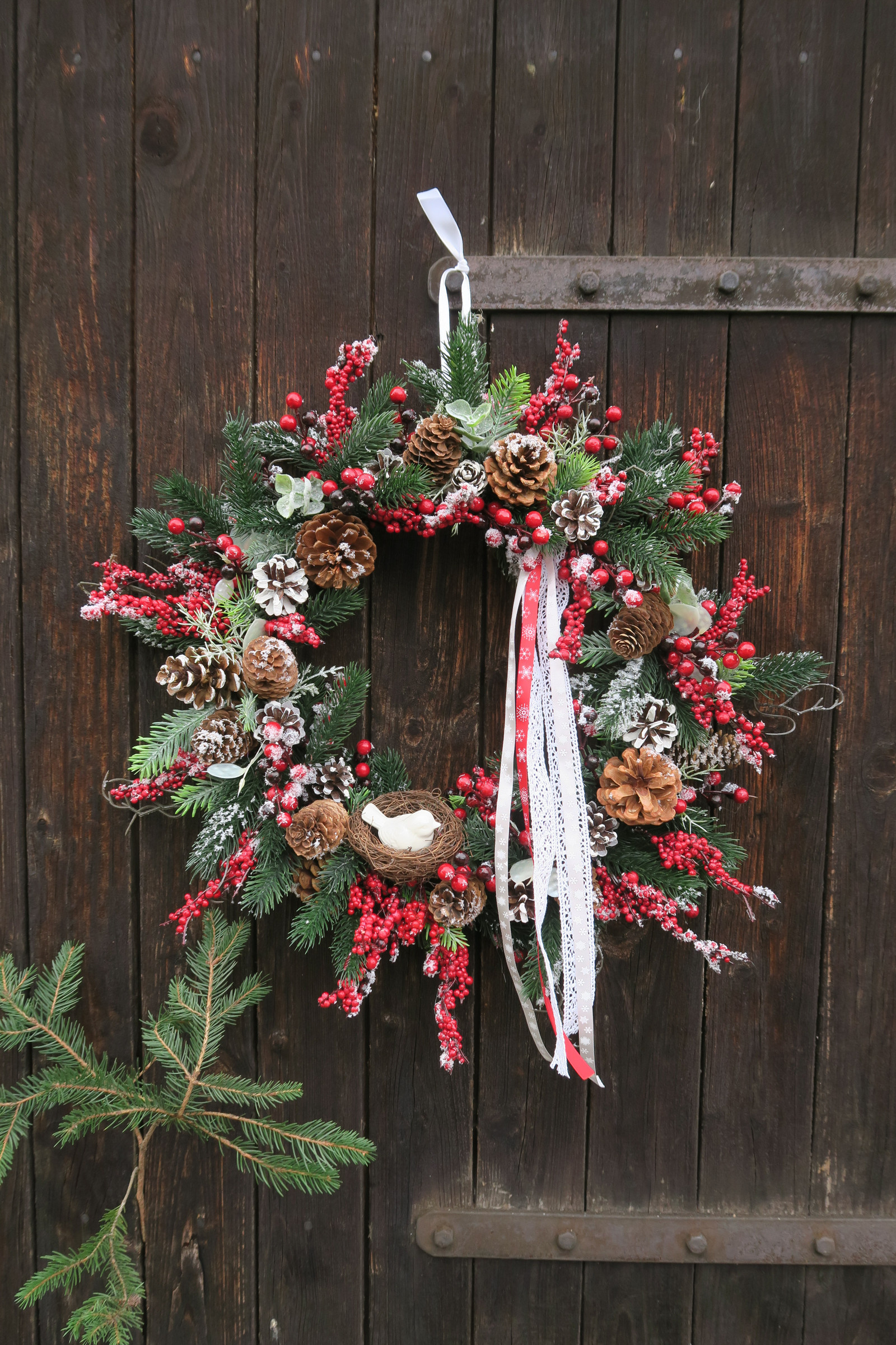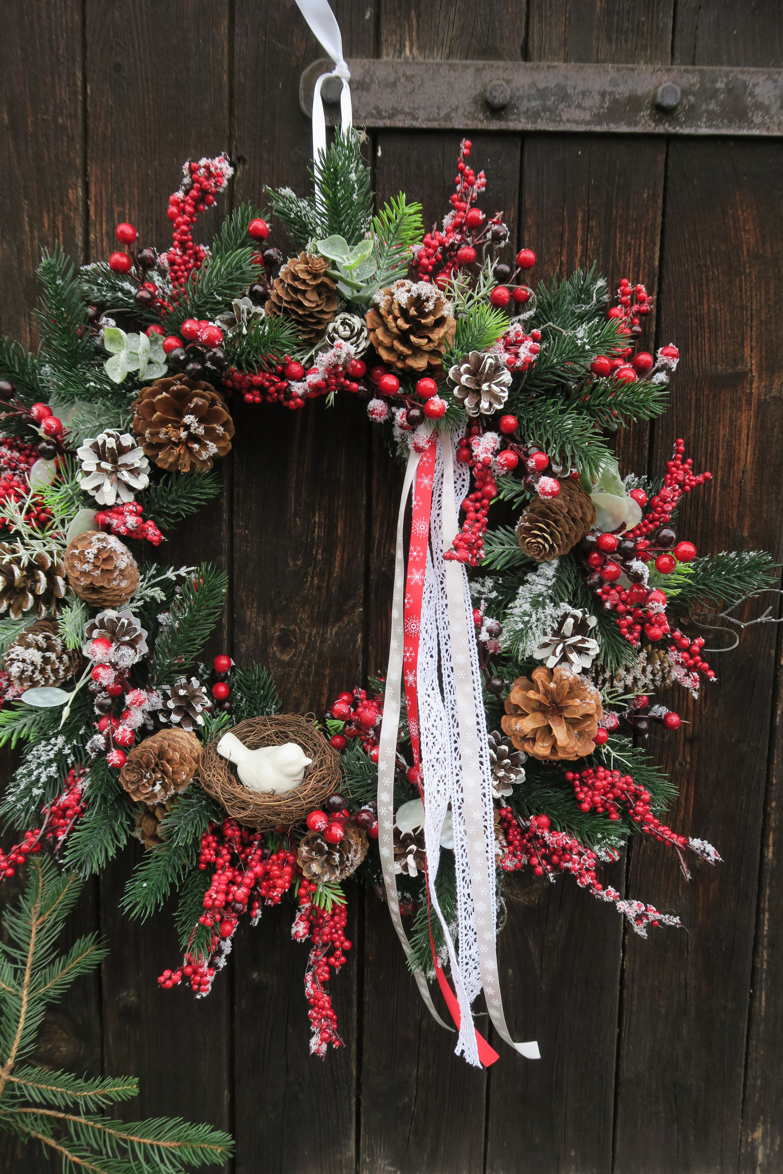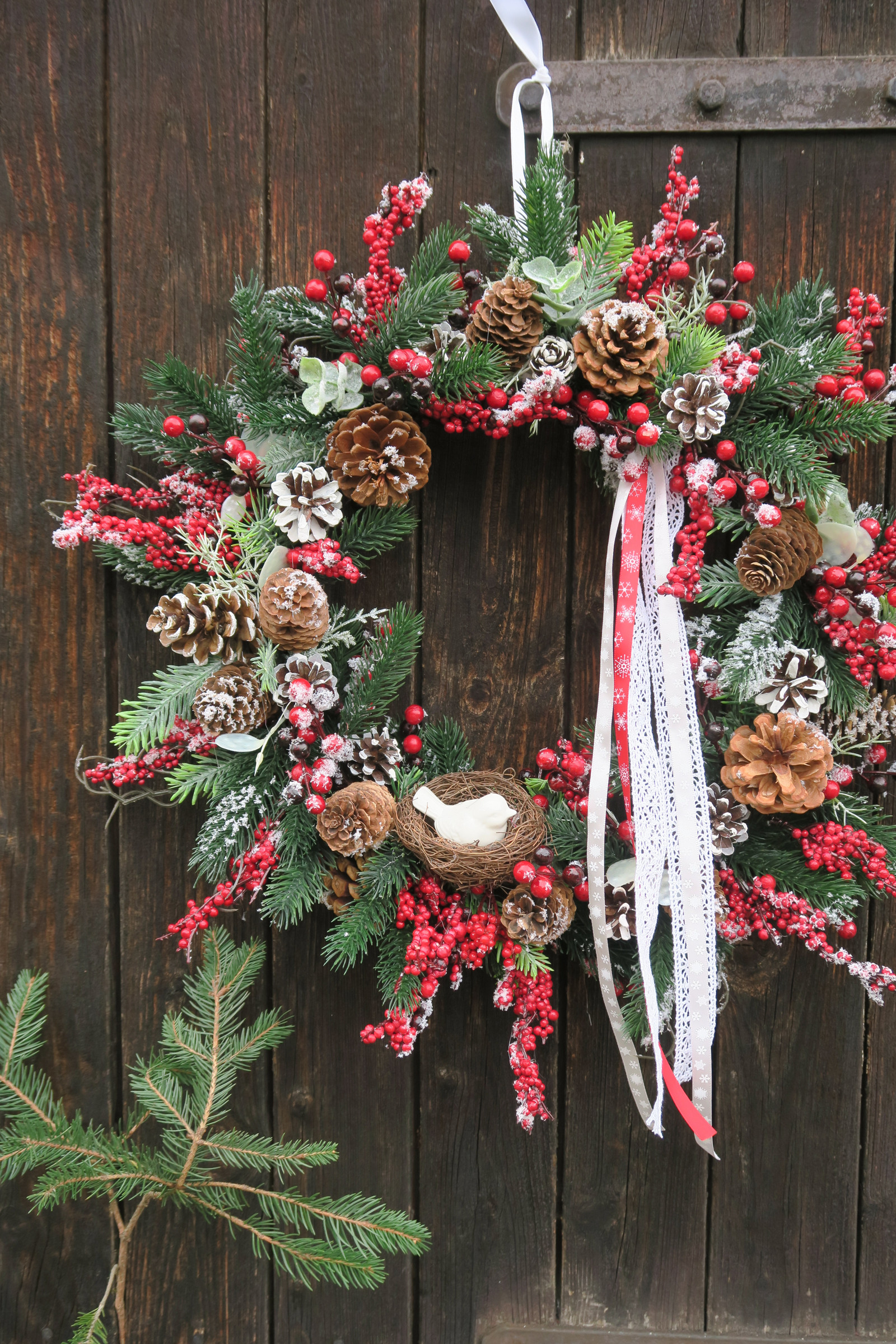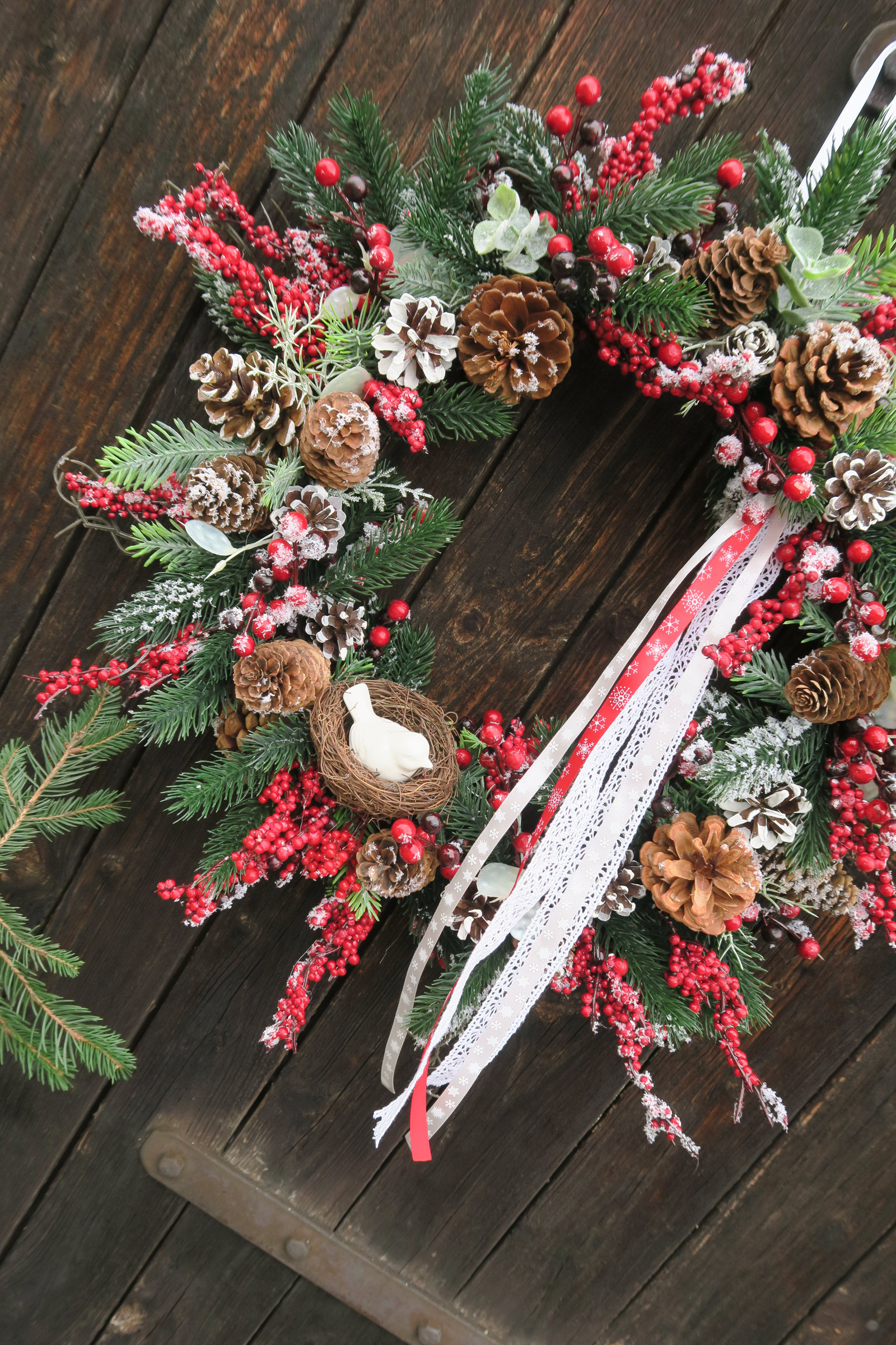 Velký věnec z kvalitního umělého jehličí, bobulek a různých dalších přízdob. Vhodný pro období zimy. V hnízdu sedí keramický ptáček.