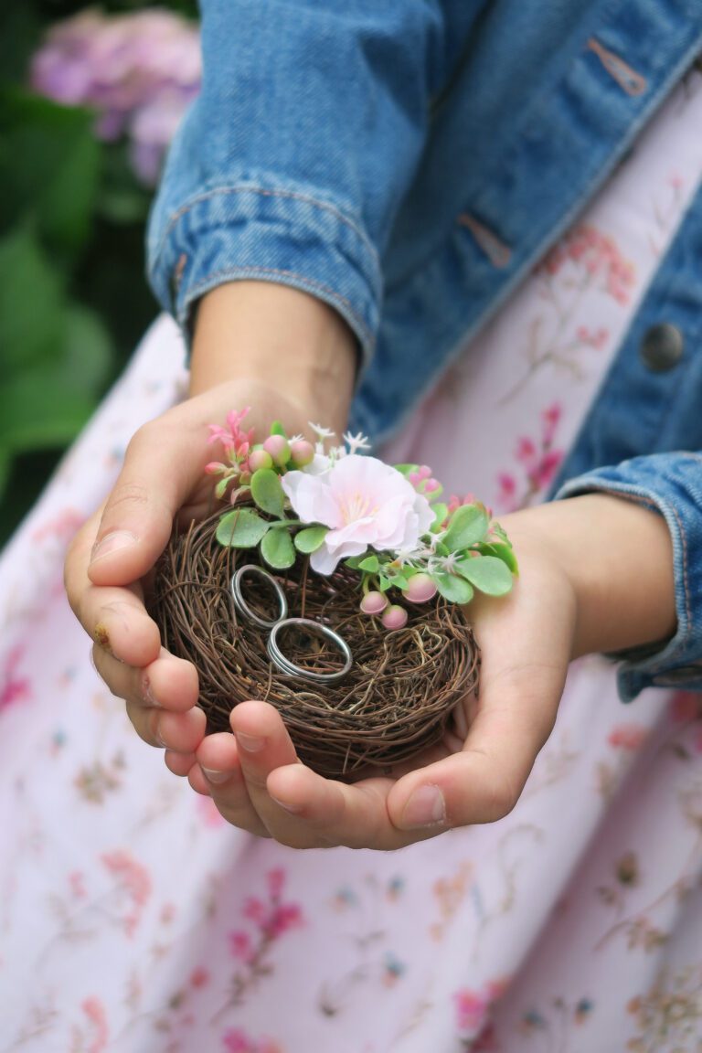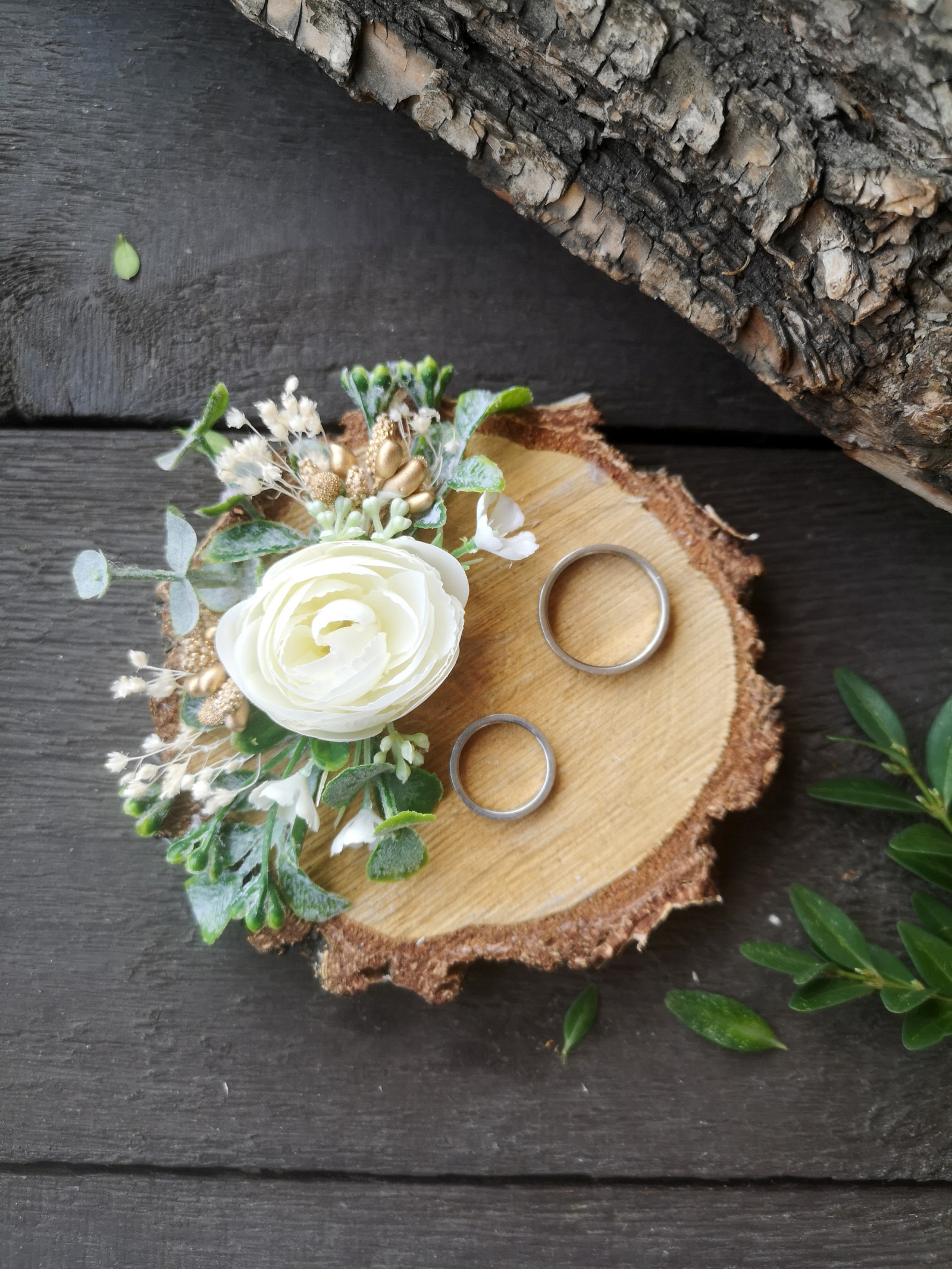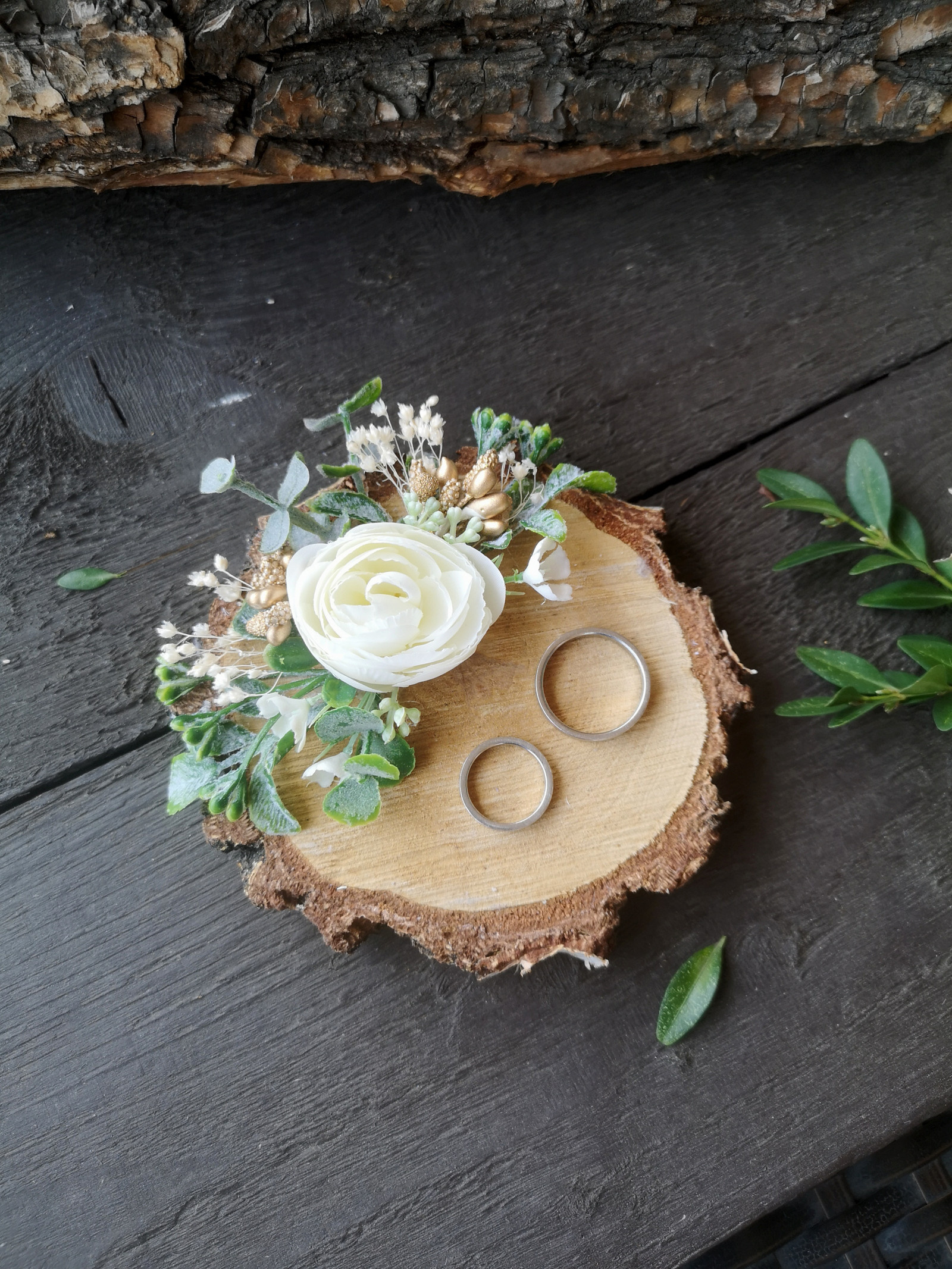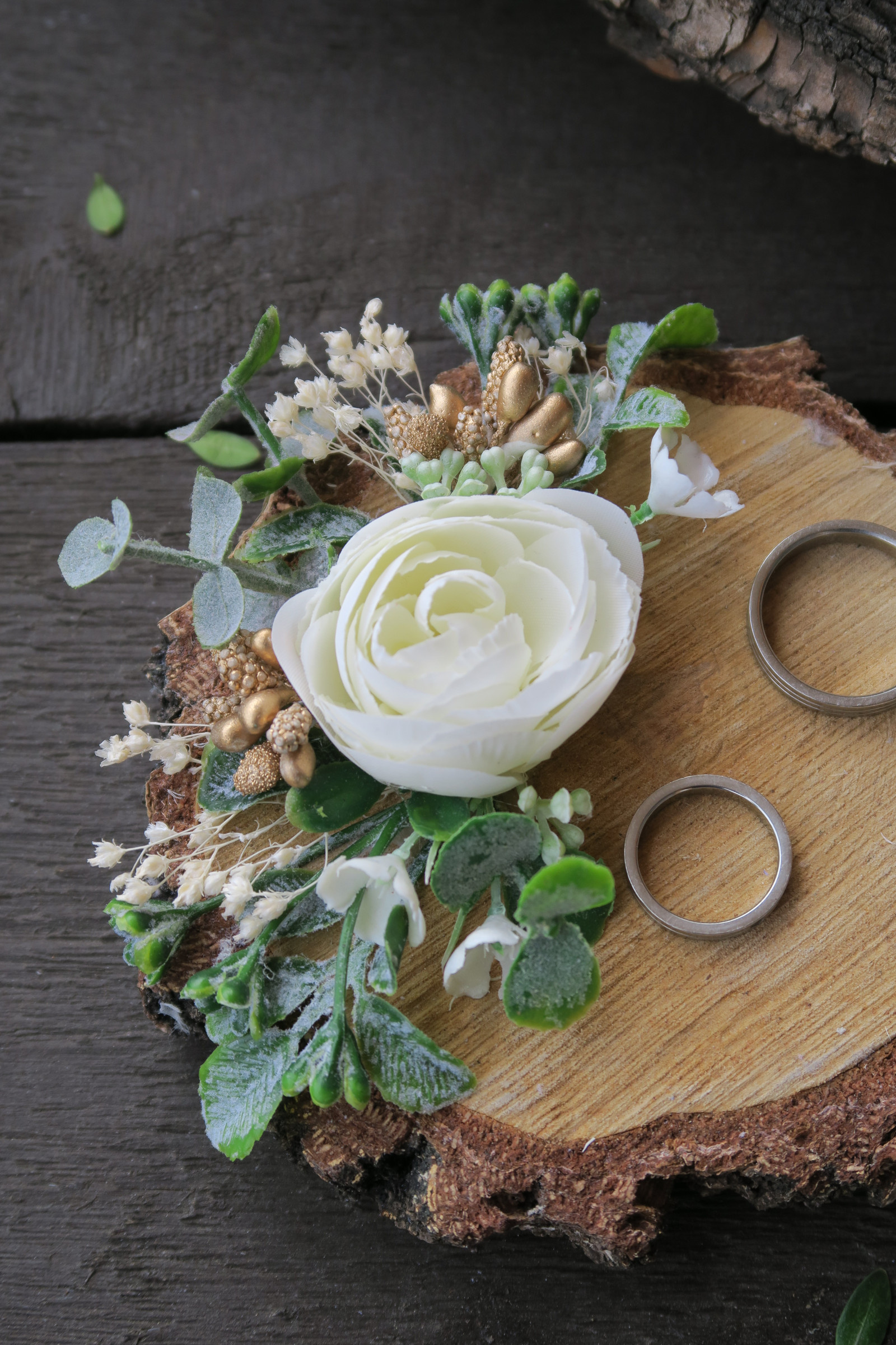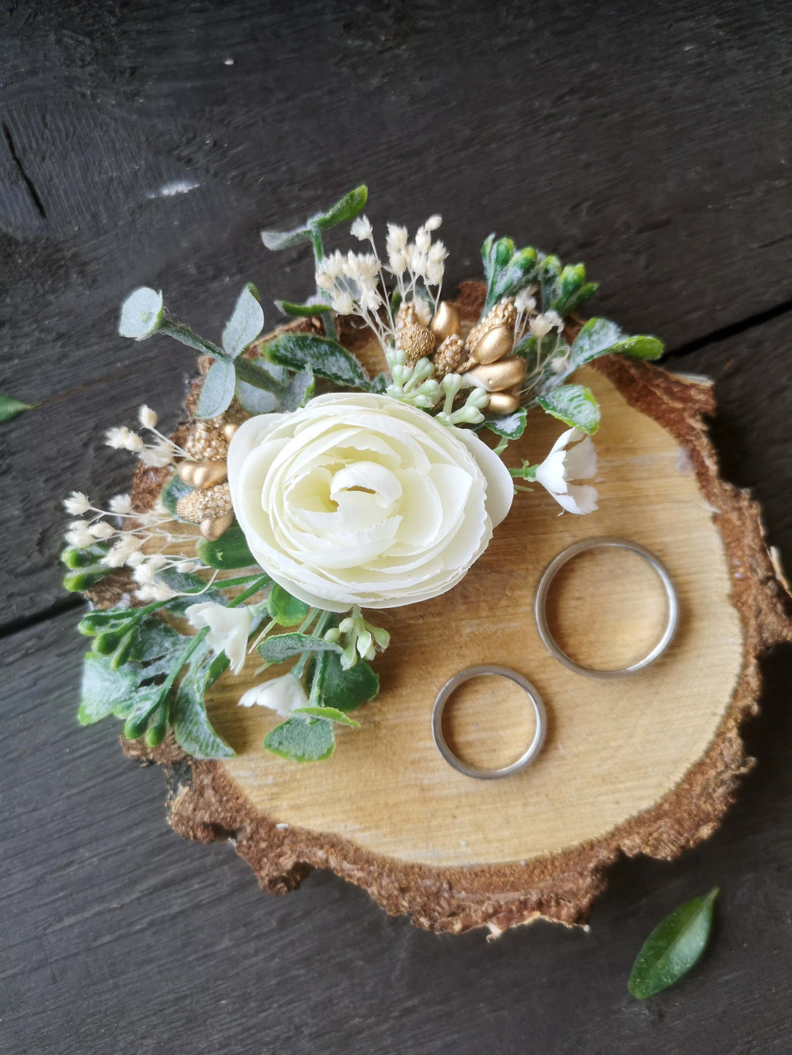 Přírodní dekorace pod snubní prstýnky s květinovou ozdobou a zlatými prvky.