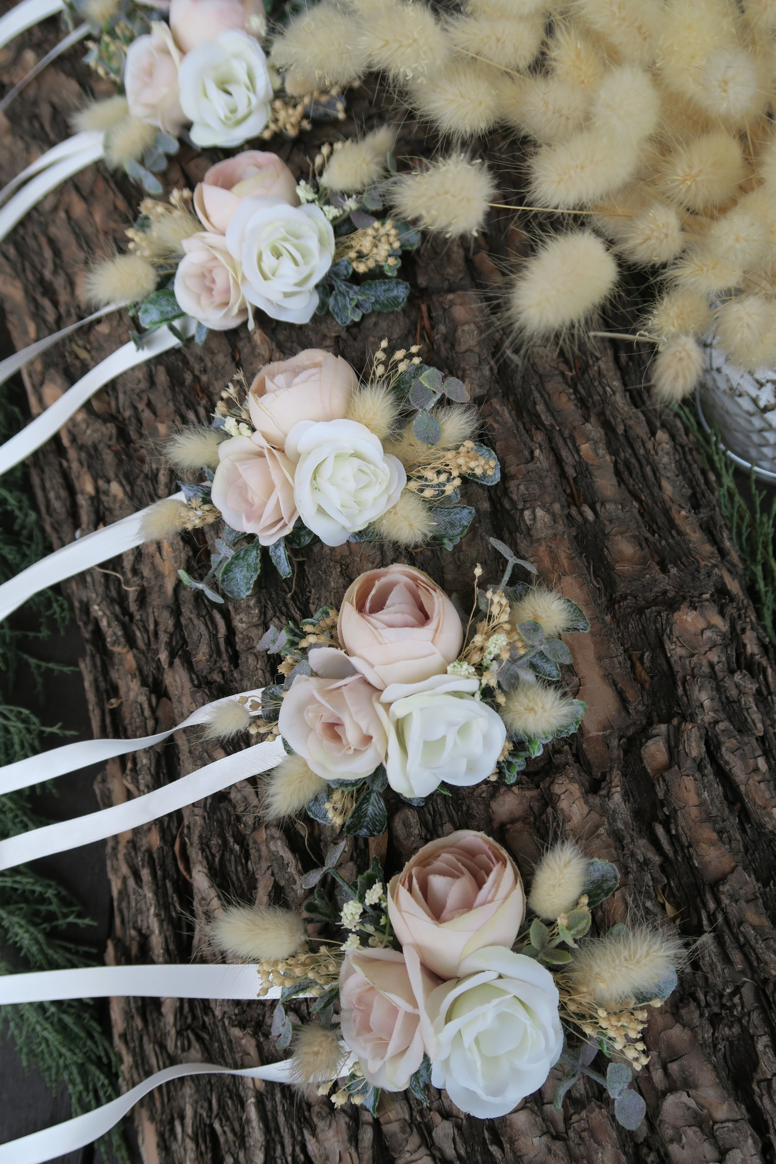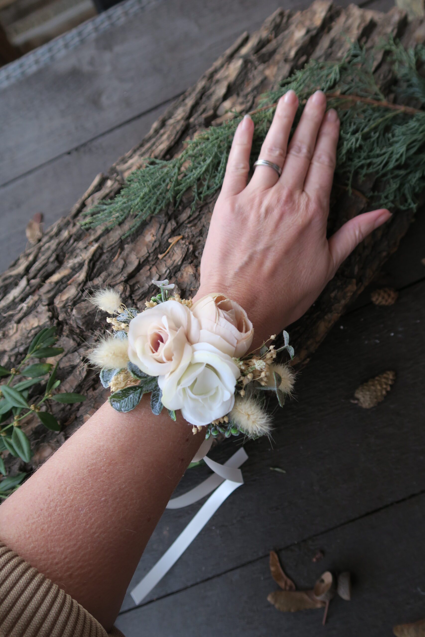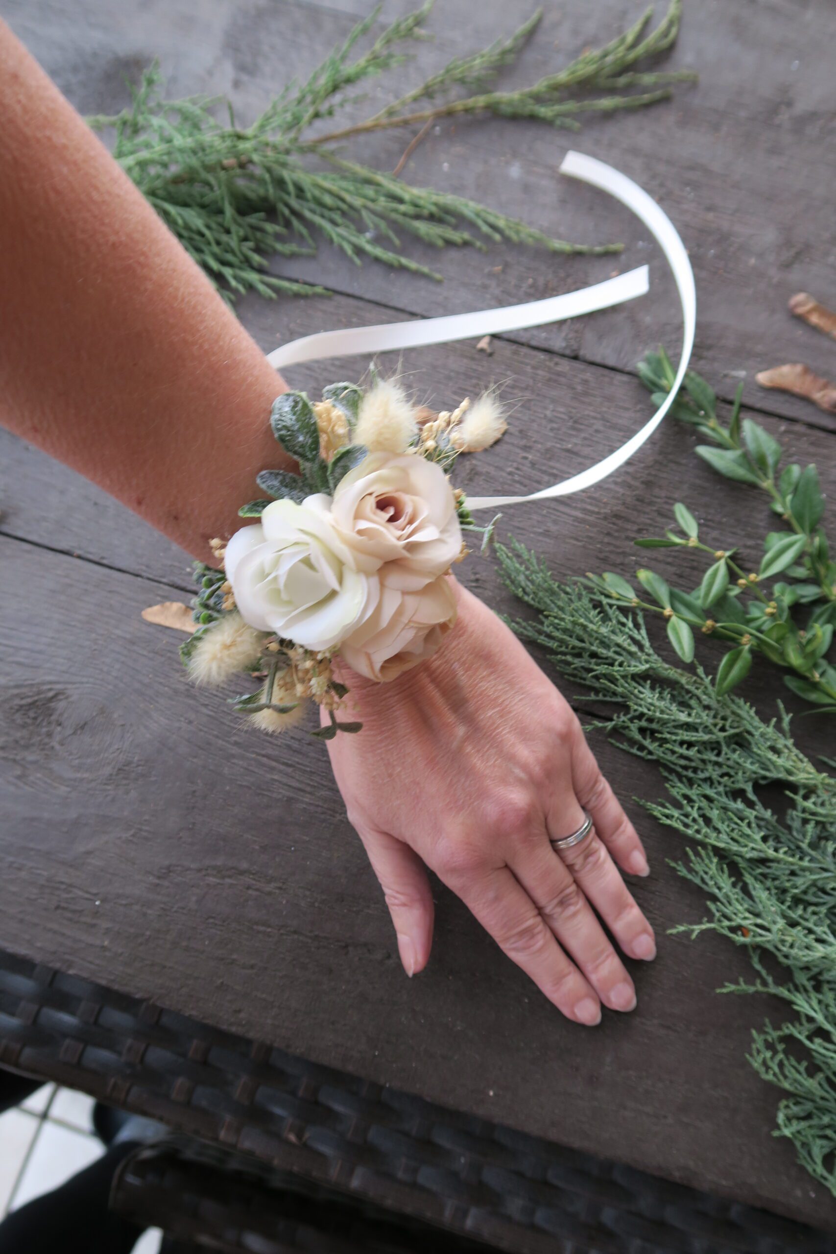 Květinový náramek na stužce v boho stylu zdobený textilními kytičkami a dalšími přízdobami.