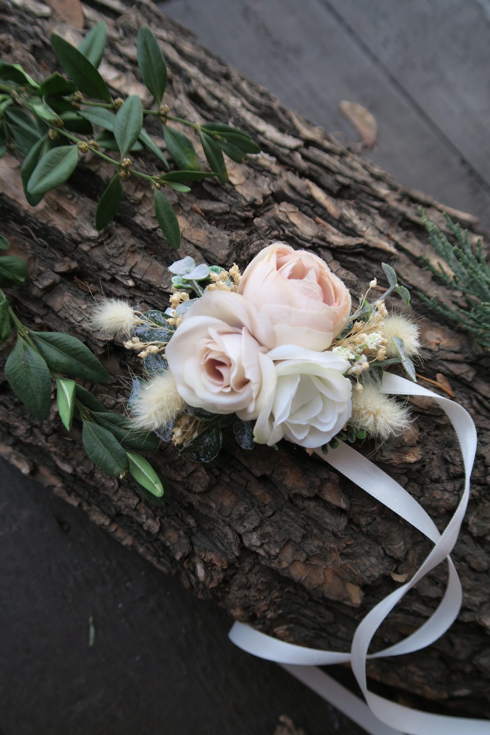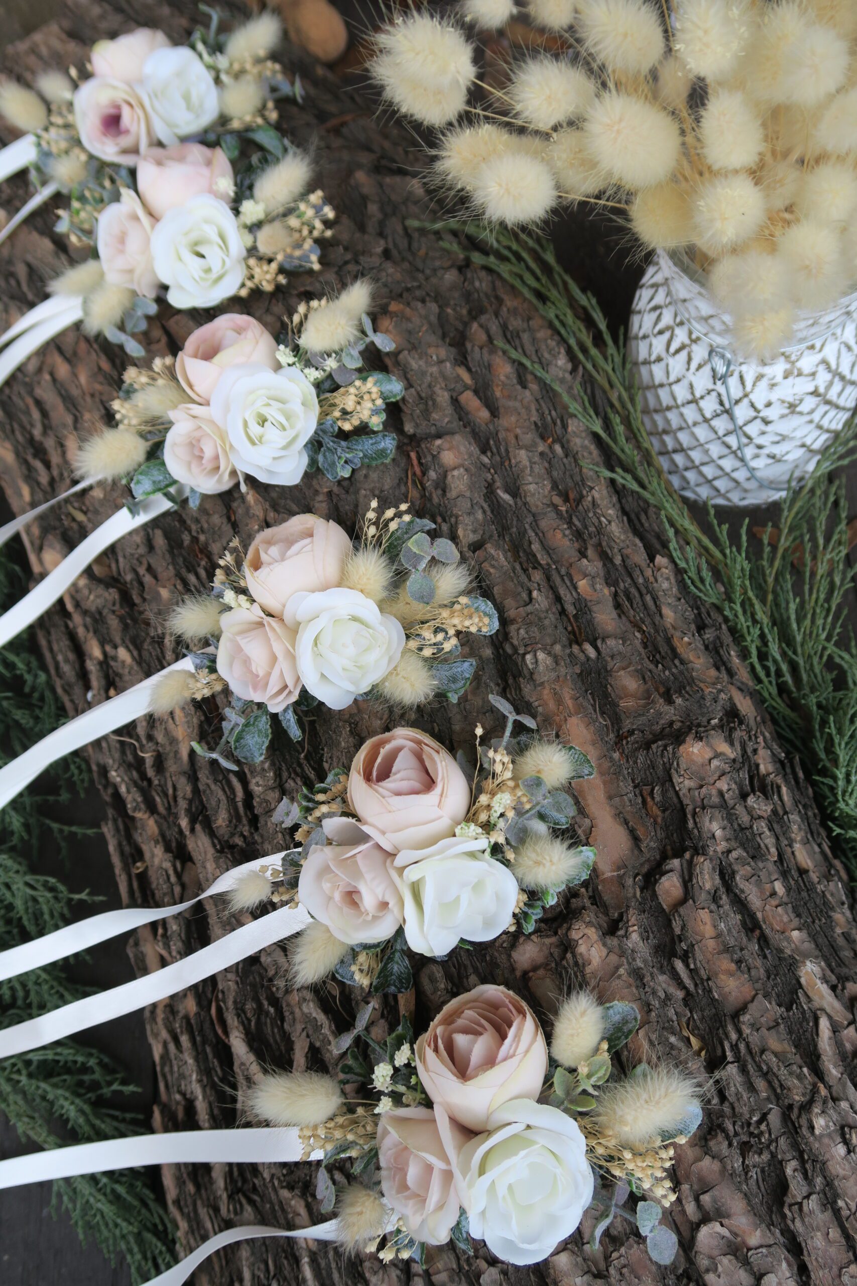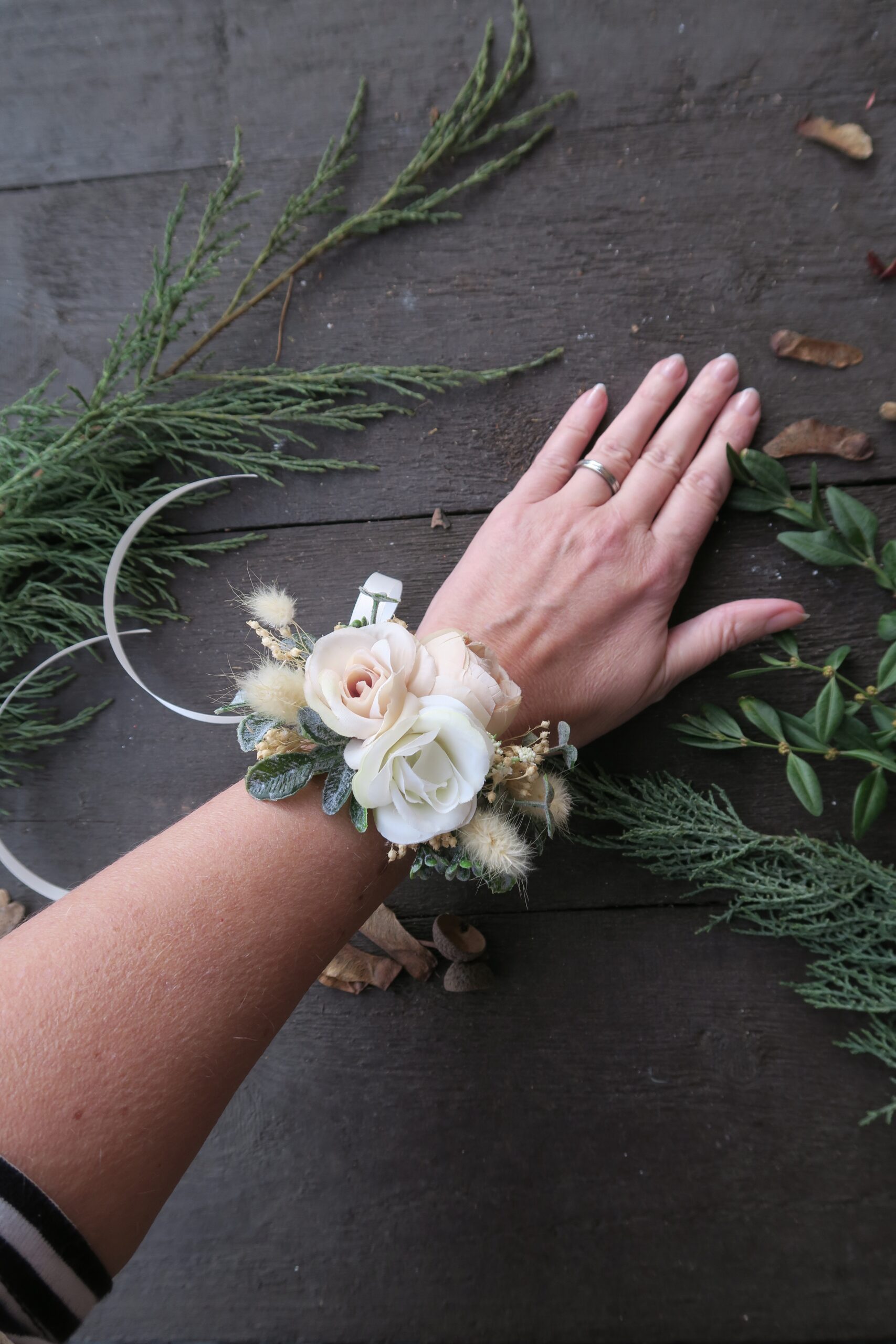 Květinový náramek na stužce v boho stylu zdobený textilními kytičkami a dalšími přízdobami.
