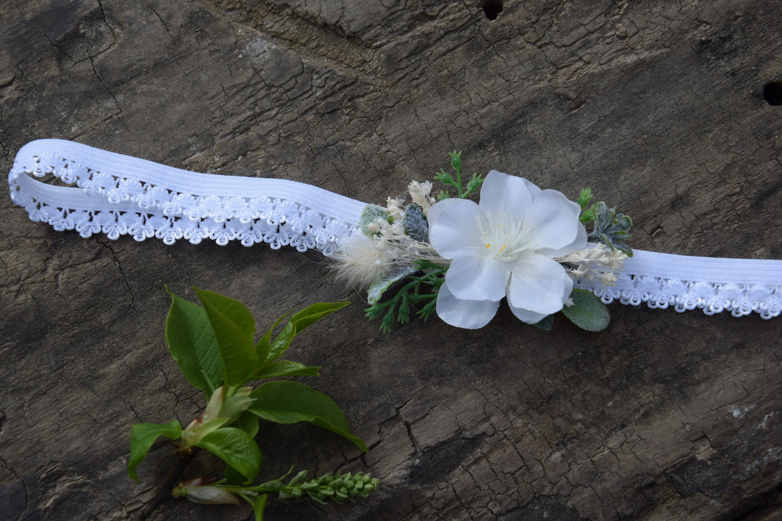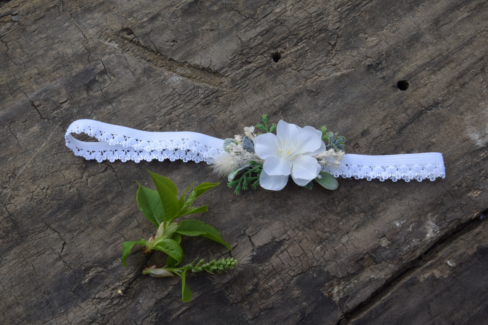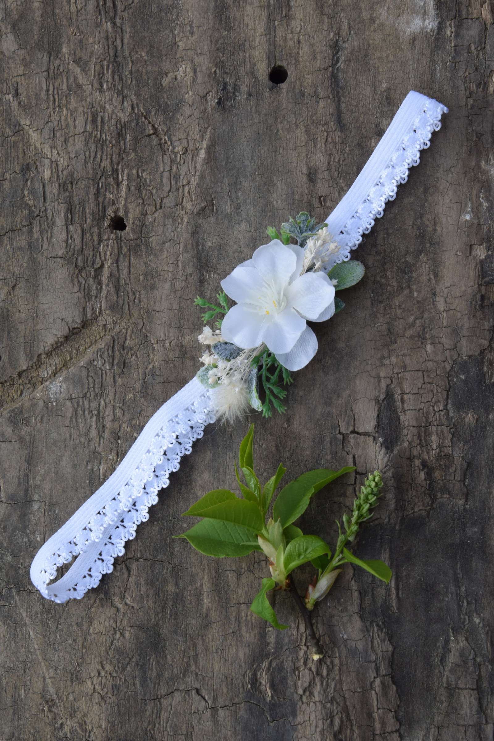 Květinový podvazek na elastické pružence zdobený textilními kytičkami a dalšími přízdobami.