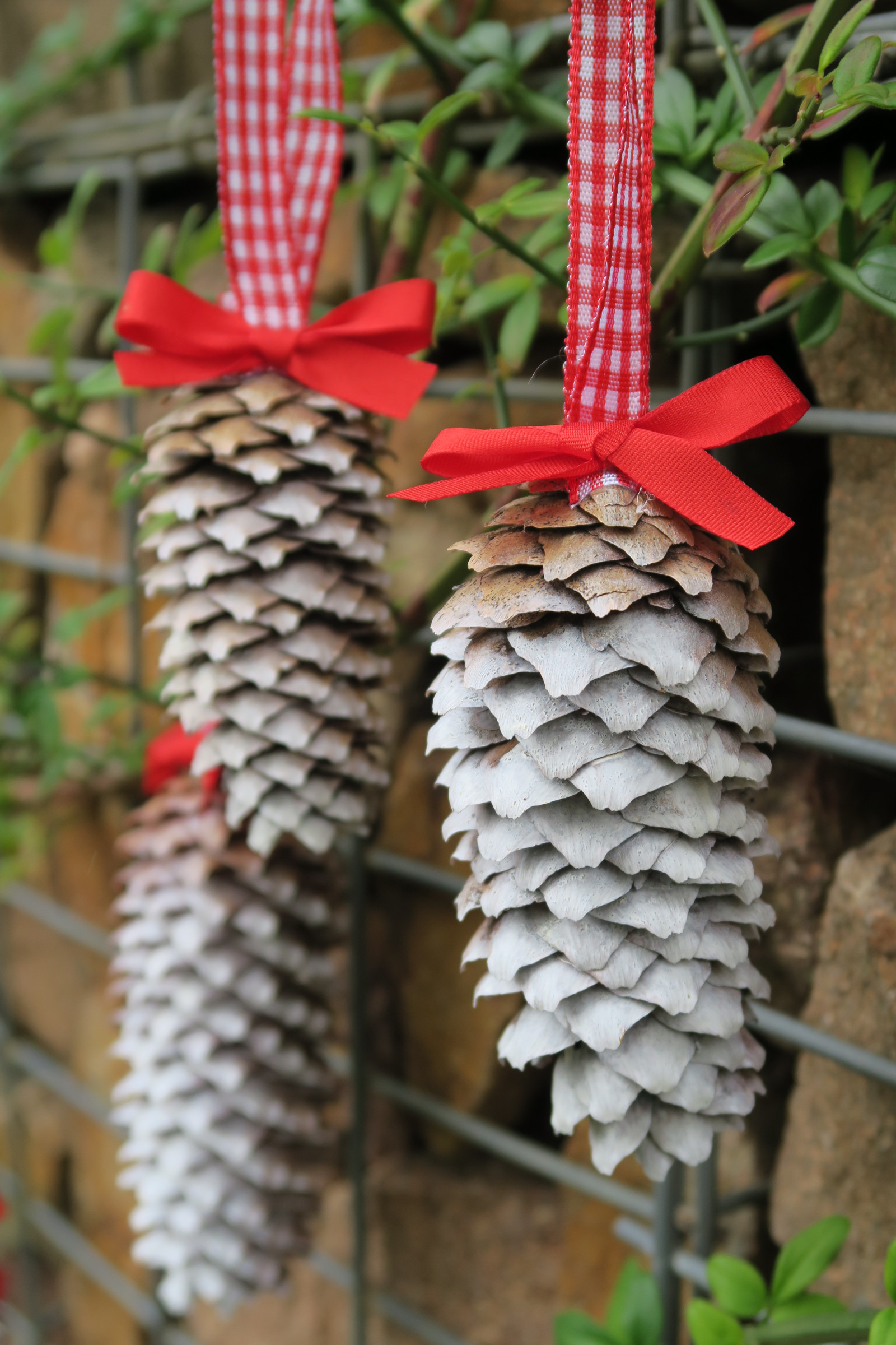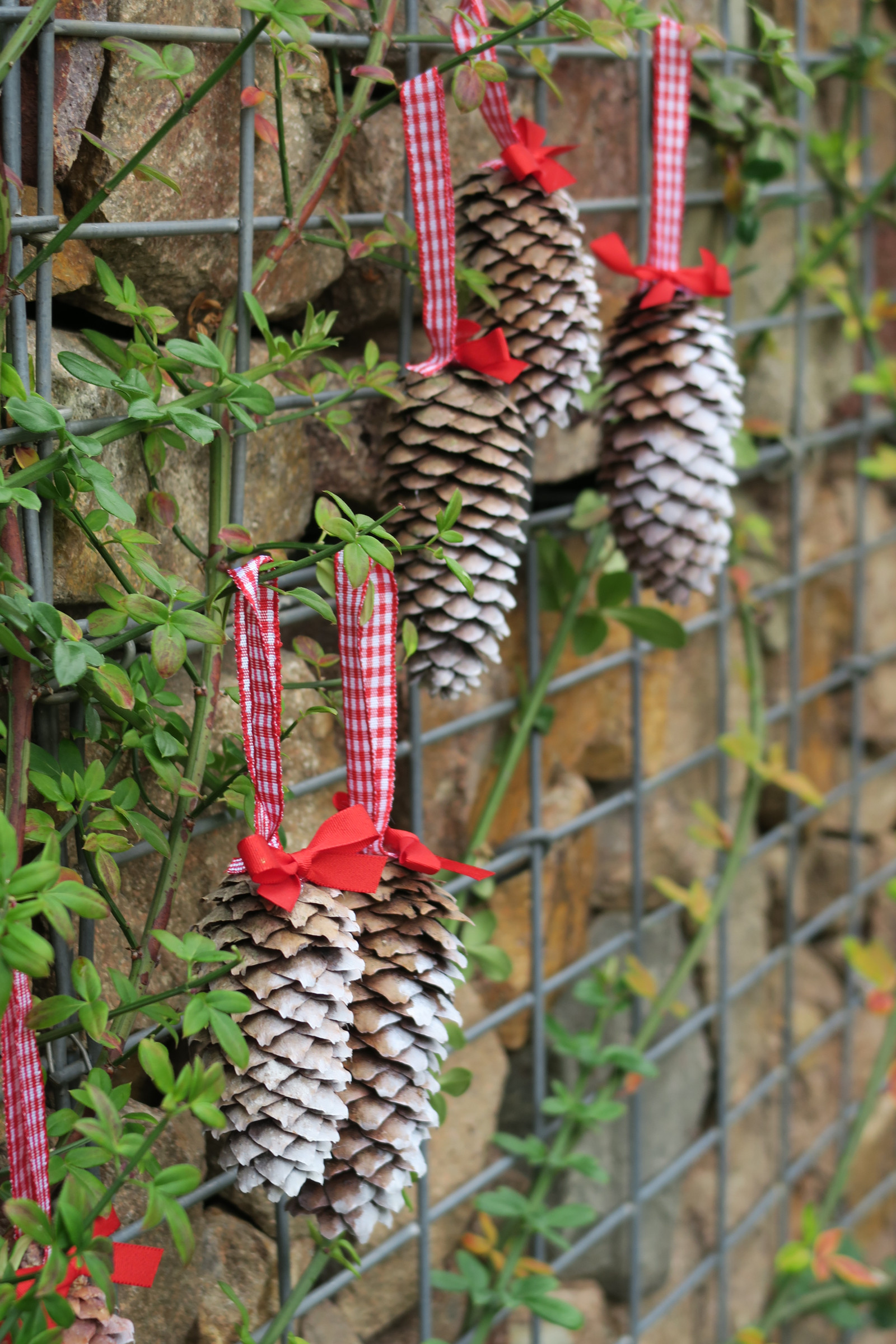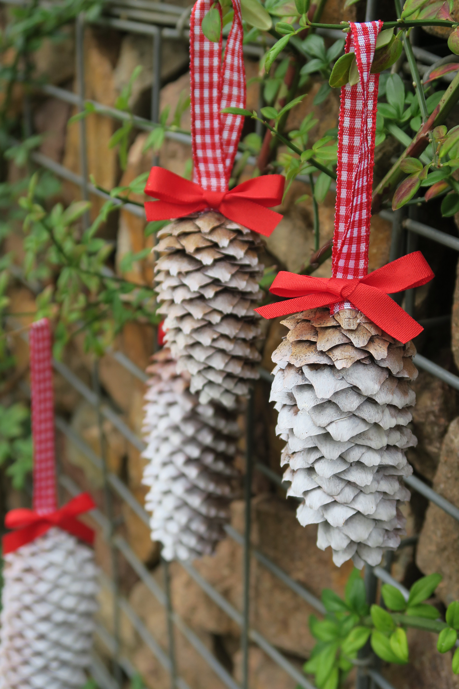 Vánočně laděné šišky se zasněženým efektem.