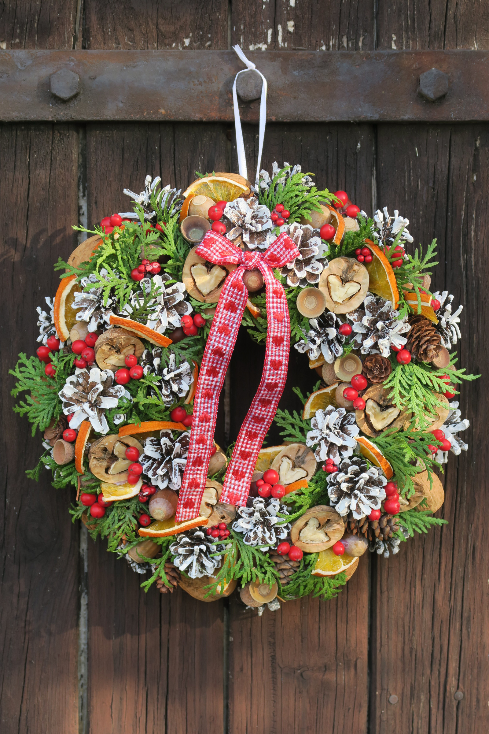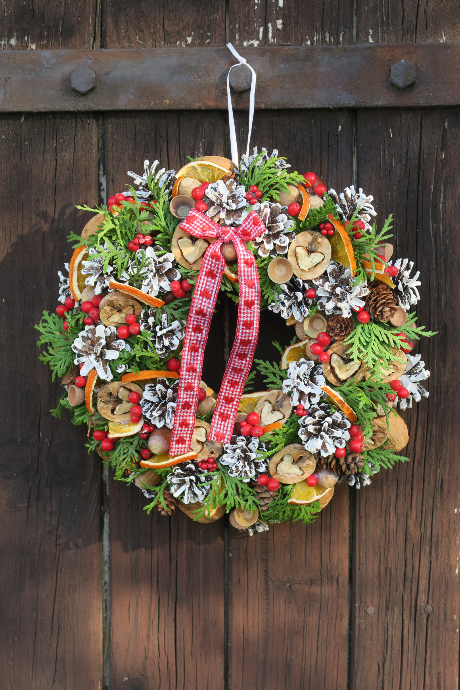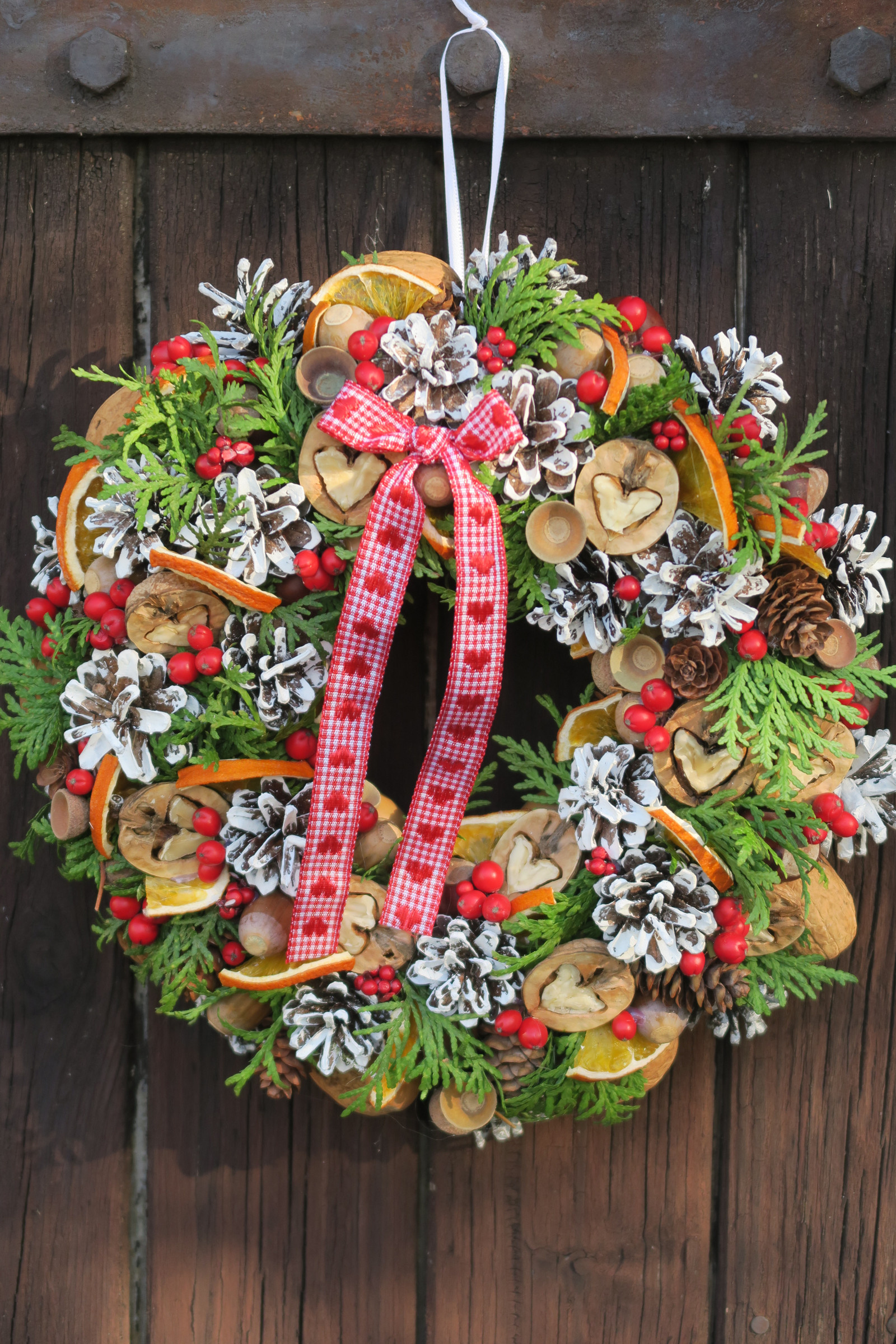 Přírodní věneček s příchutí vánočních svátků. Zdobený šiškami, oříšky, pomeranči, větvičkami túje aj.