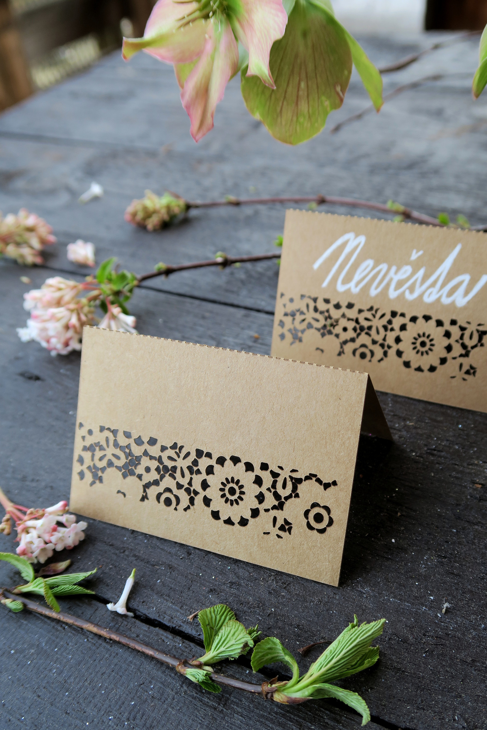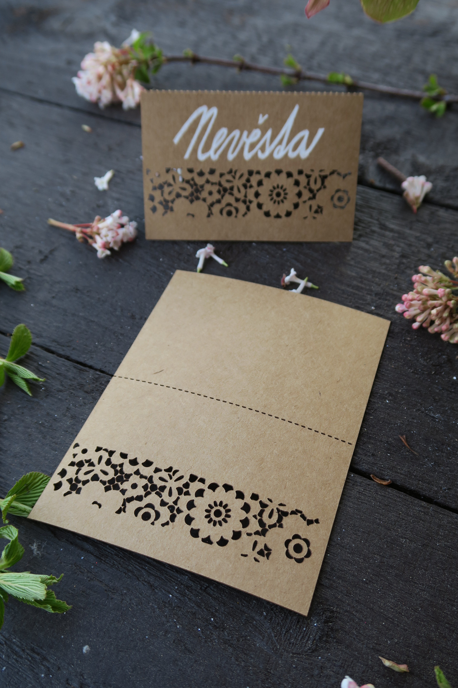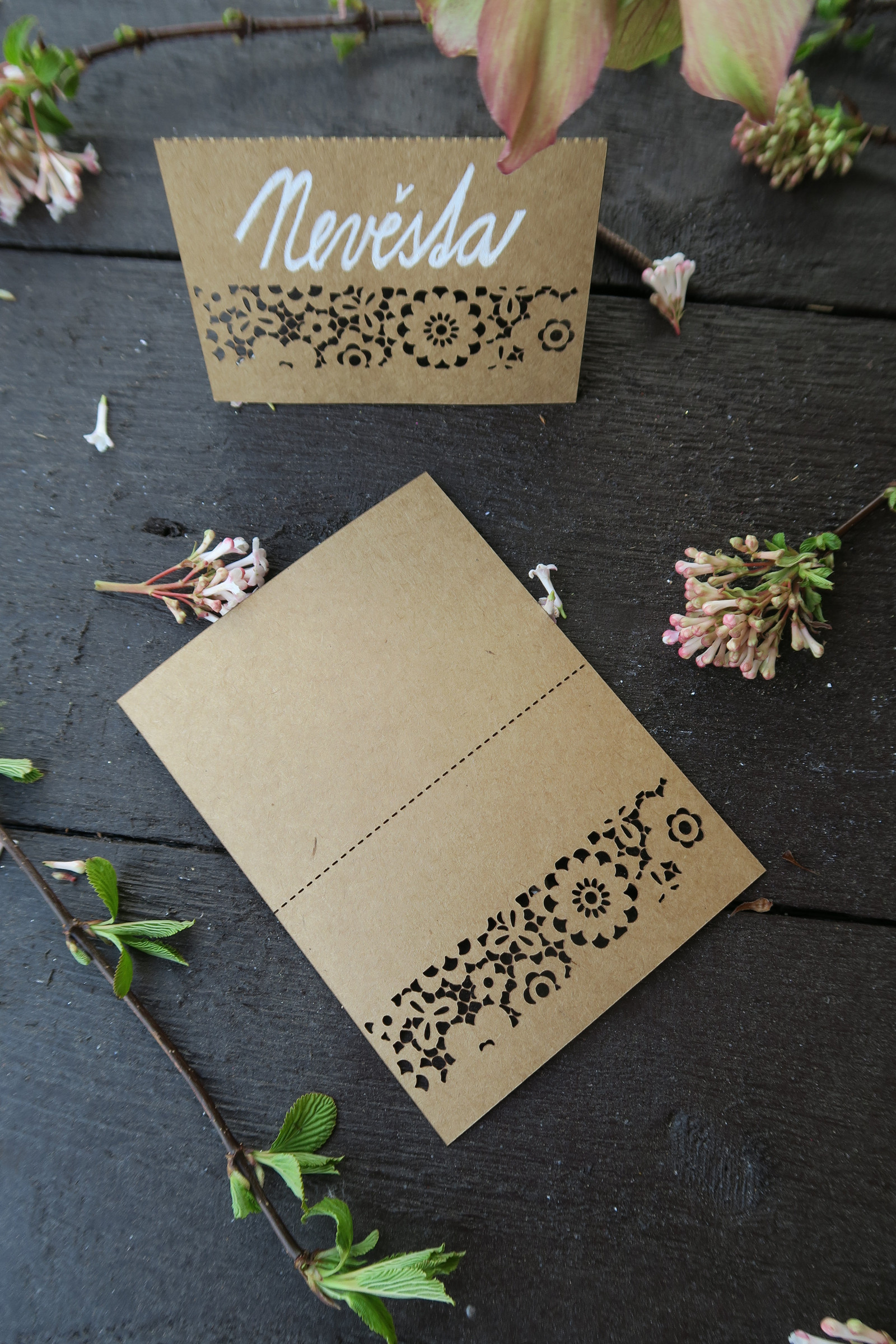 Jmenovka na svatební tabuli z tvrdšího kraftového papíru má rozměry 9 x 12 cm. Perforování pro snadný ohyb.