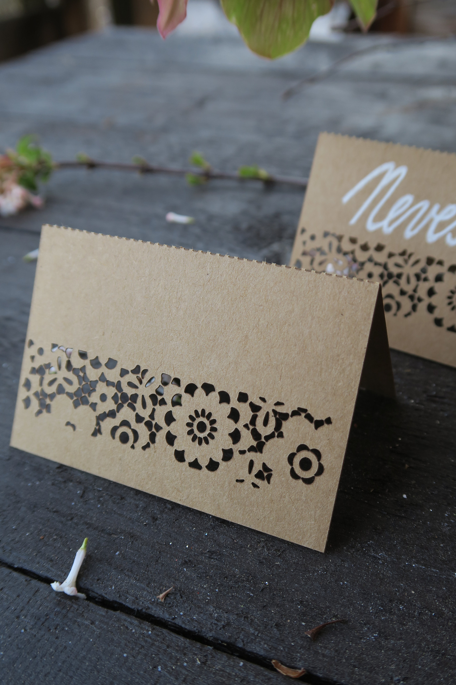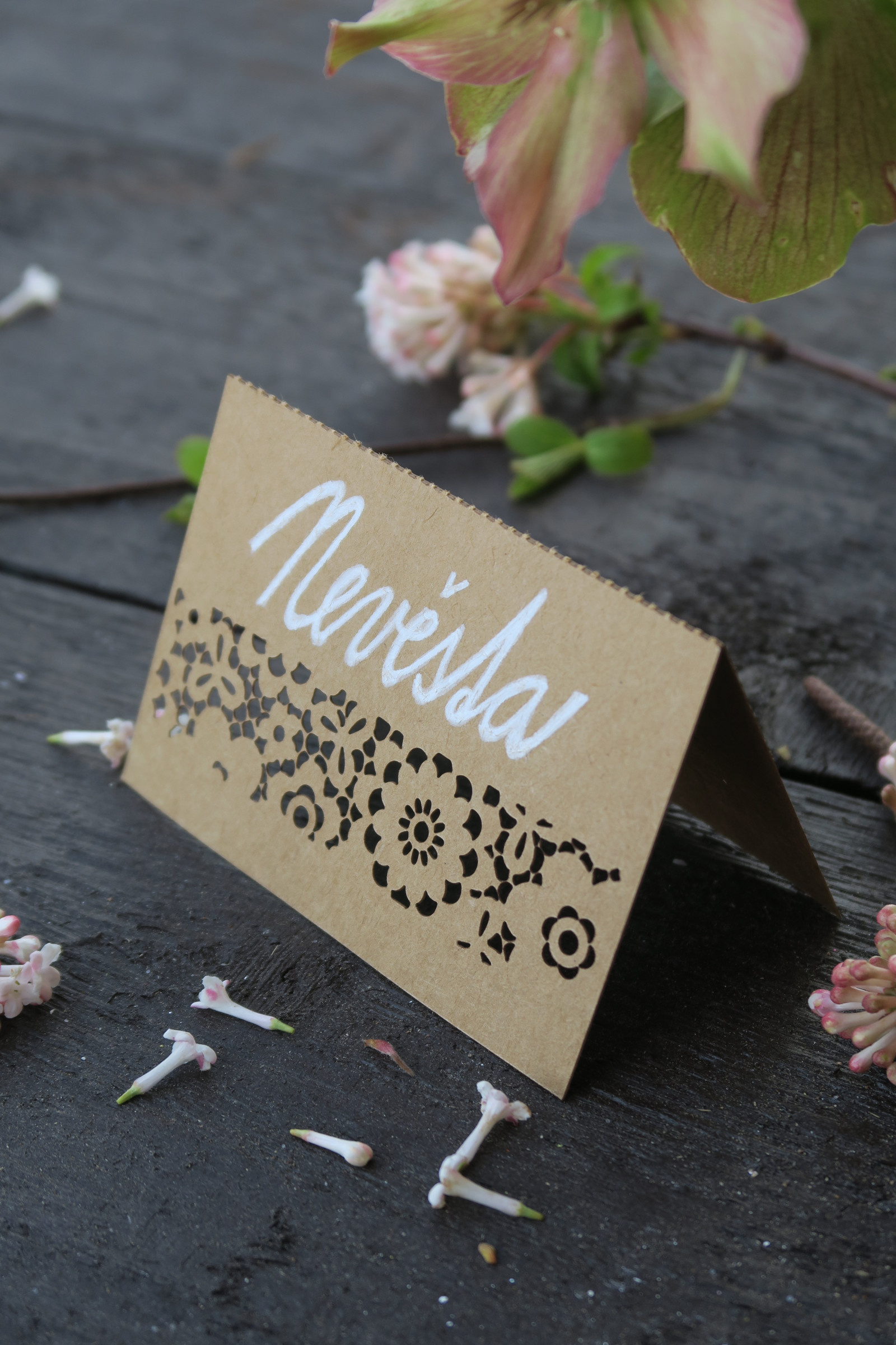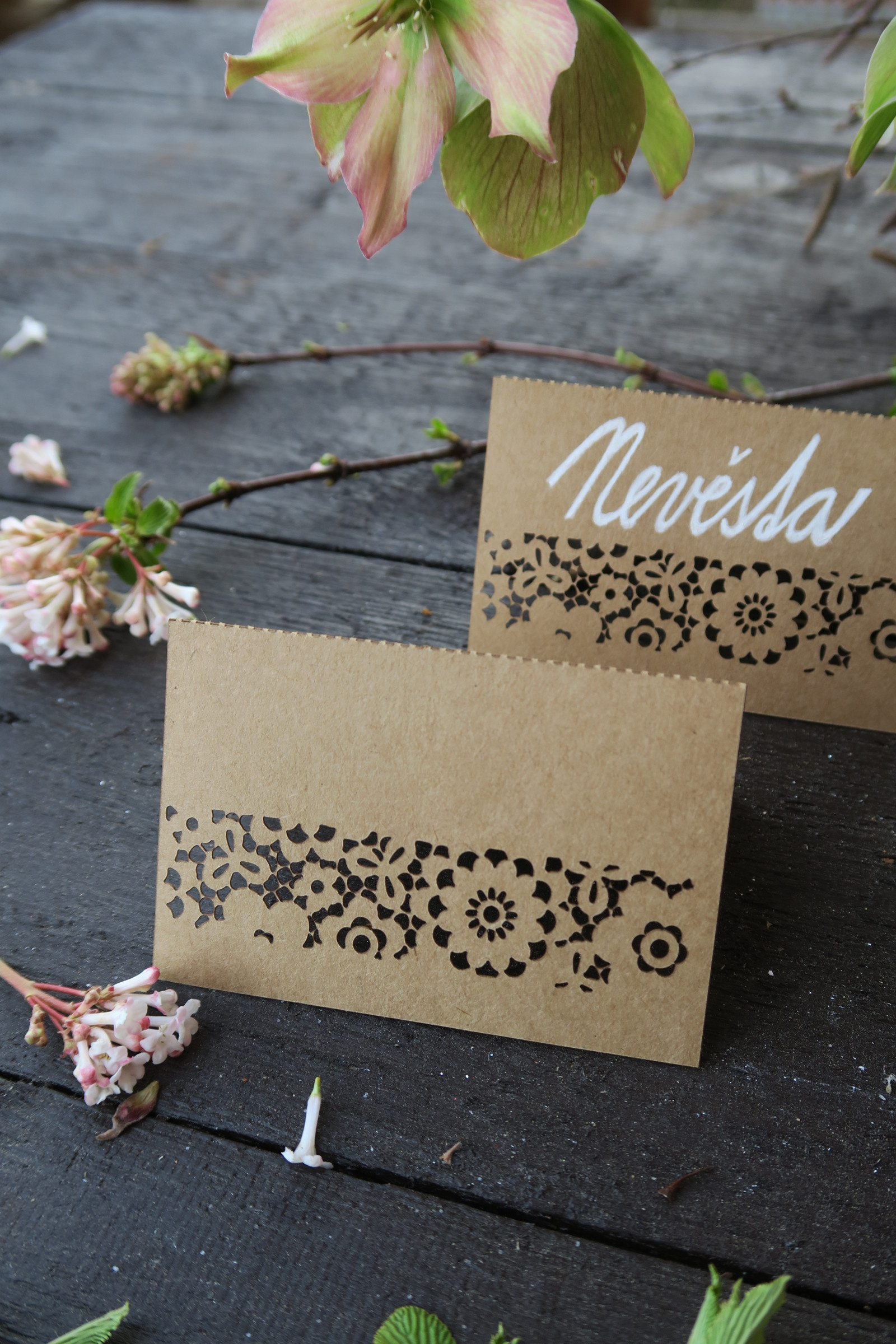 Jmenovka na svatební tabuli z tvrdšího kraftového papíru má rozměry 9 x 12 cm. Perforování pro snadný ohyb.