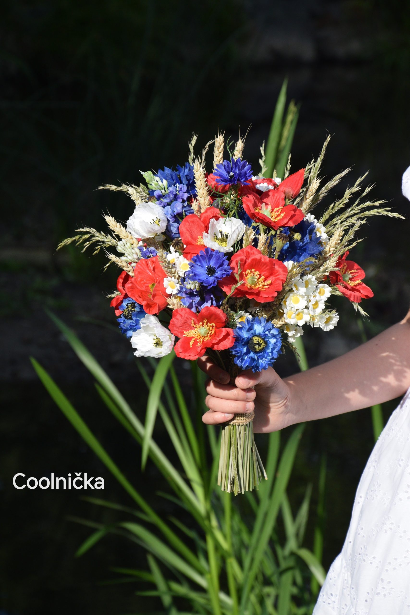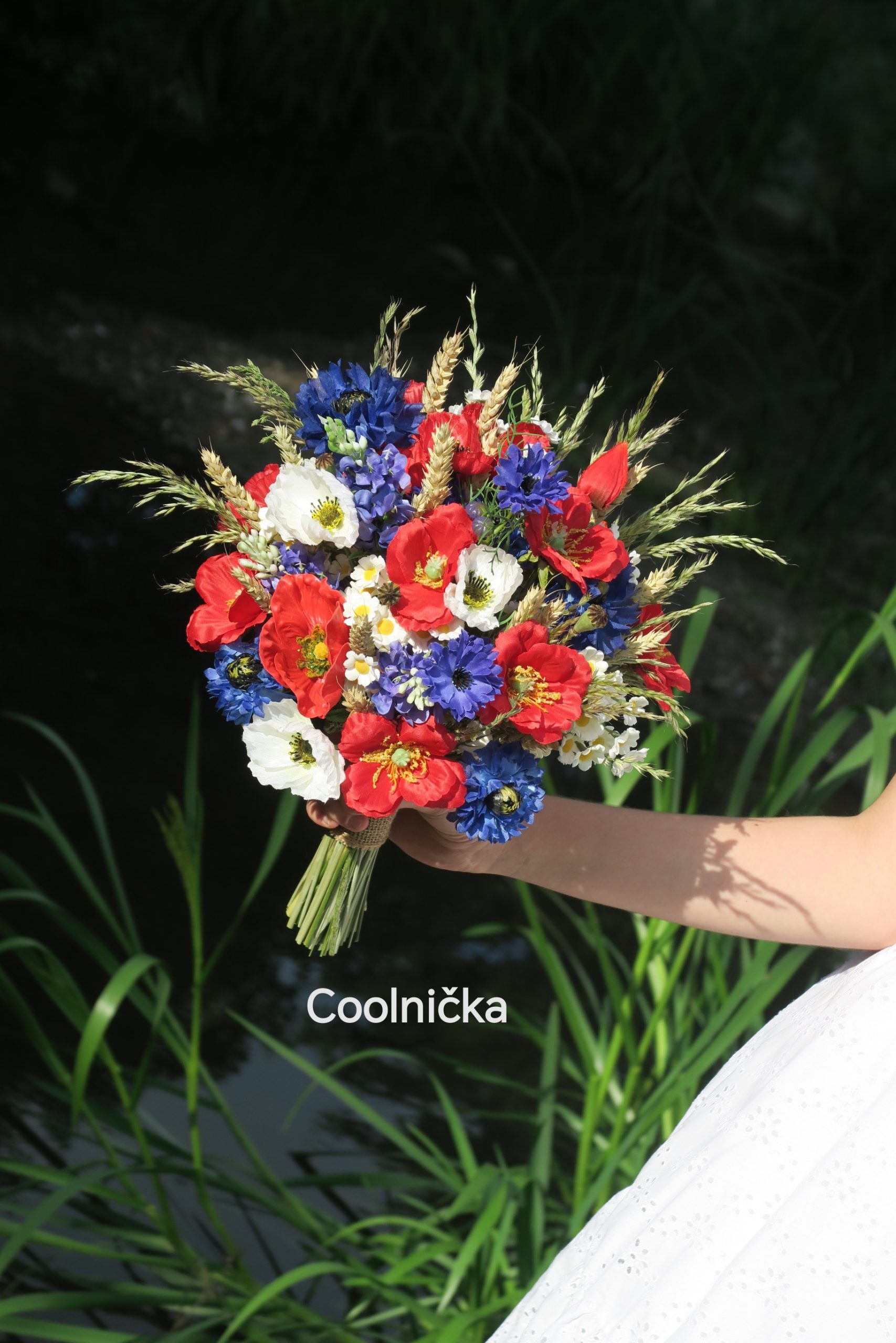 Svatební kytice z kvalitních látkových květin a přírodnin – obilí, traviny. Průměr cca 30 cm.