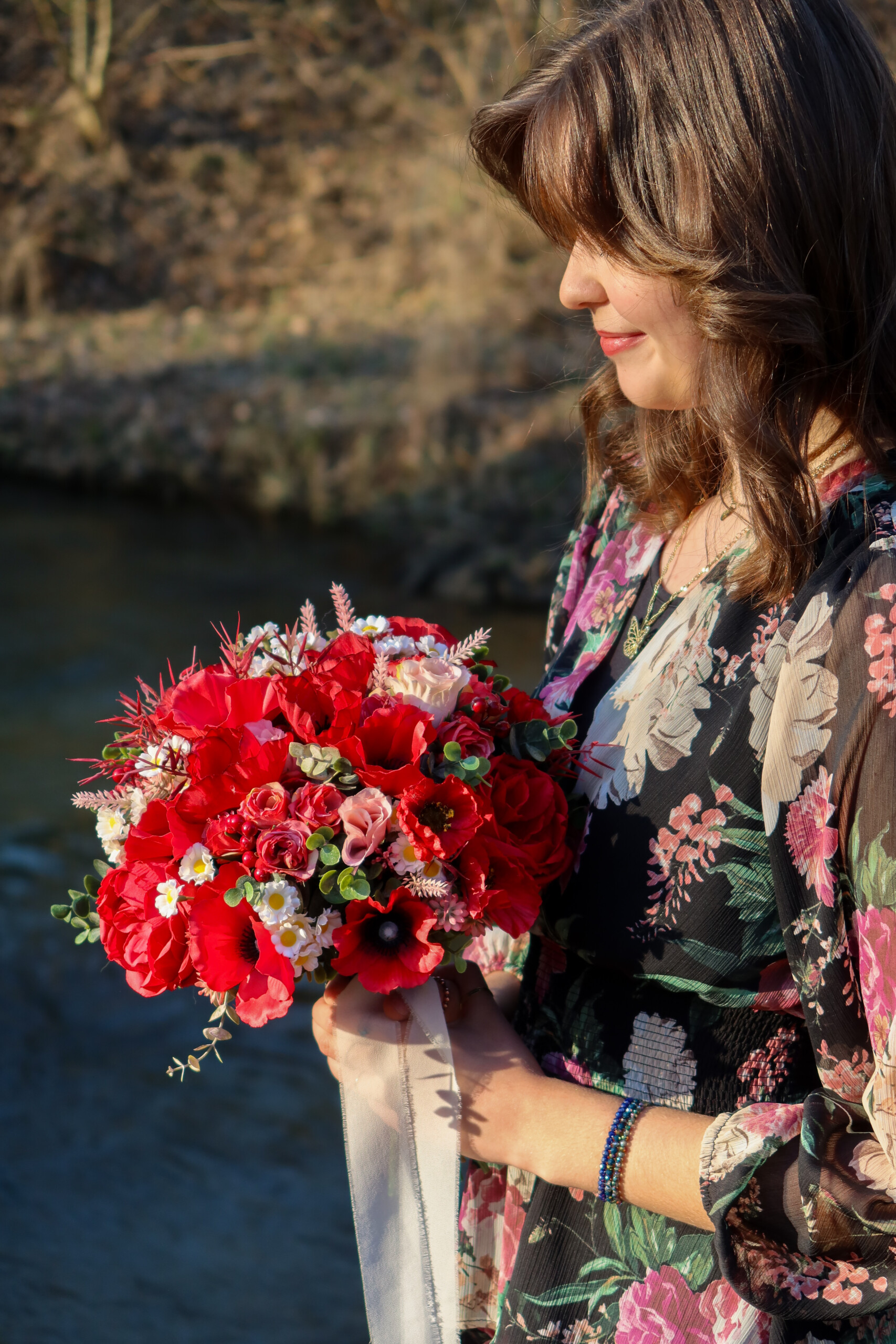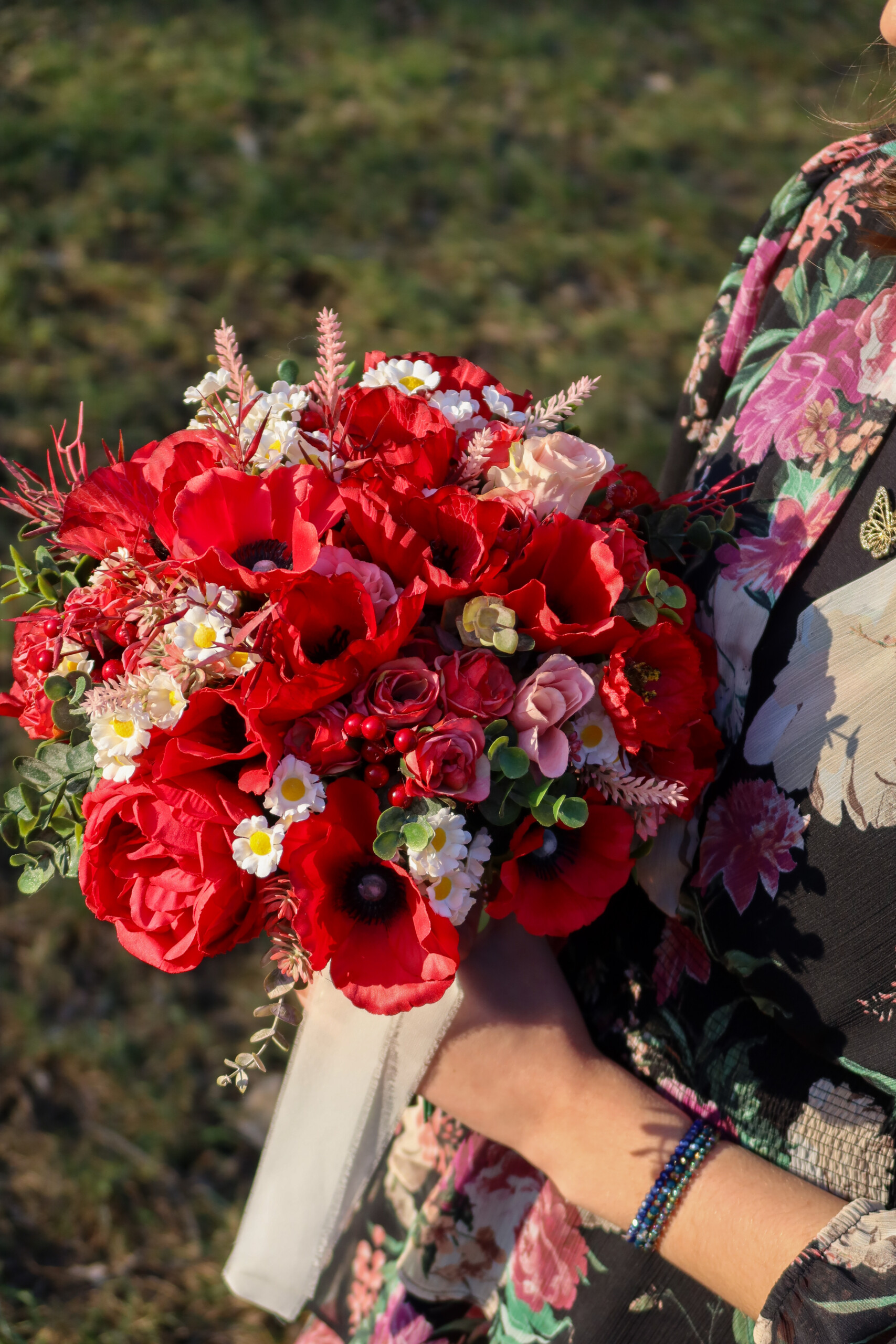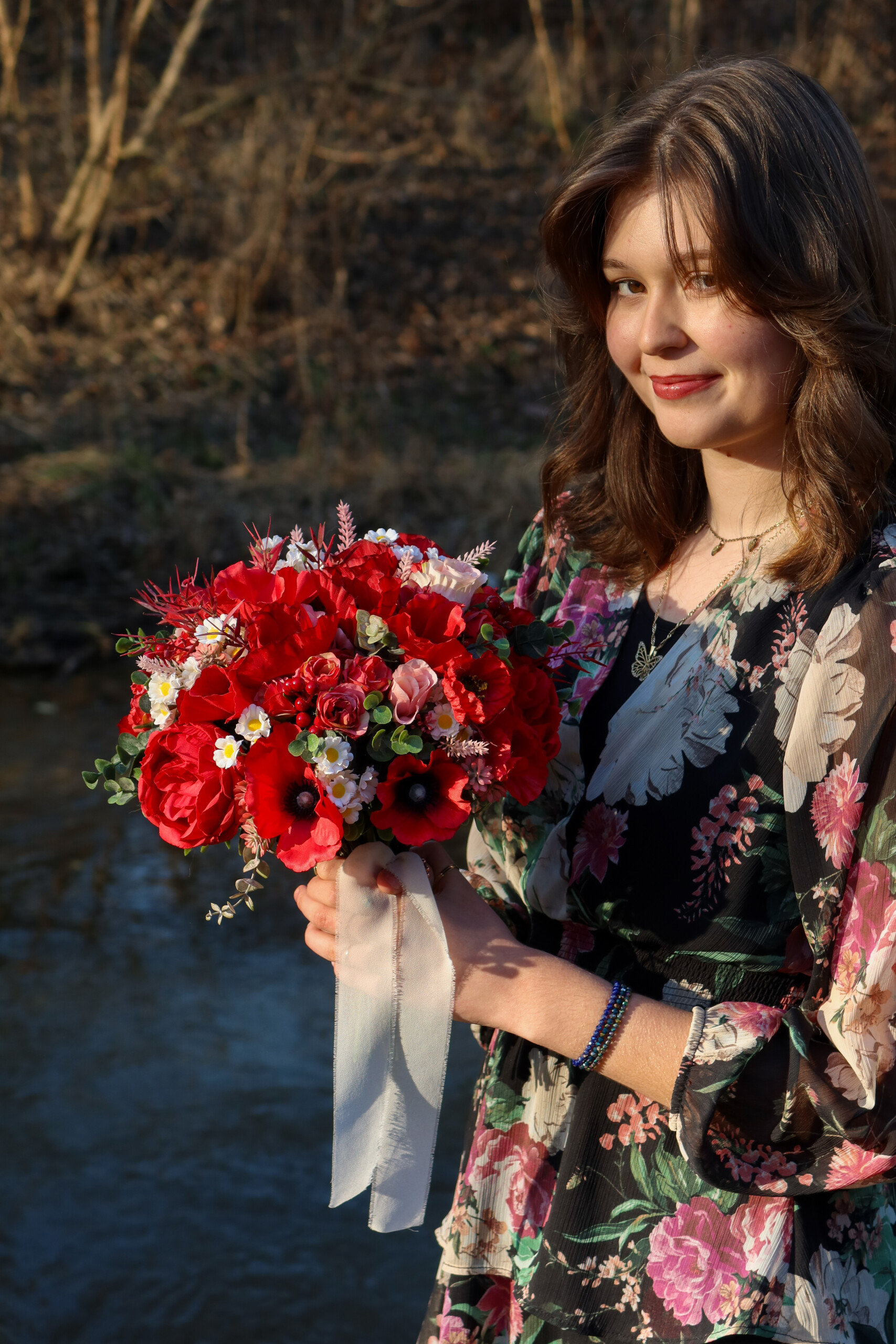 Svatební kytice z kvalitních látkových květin a různých přízdob. Stuha bílé barvy.