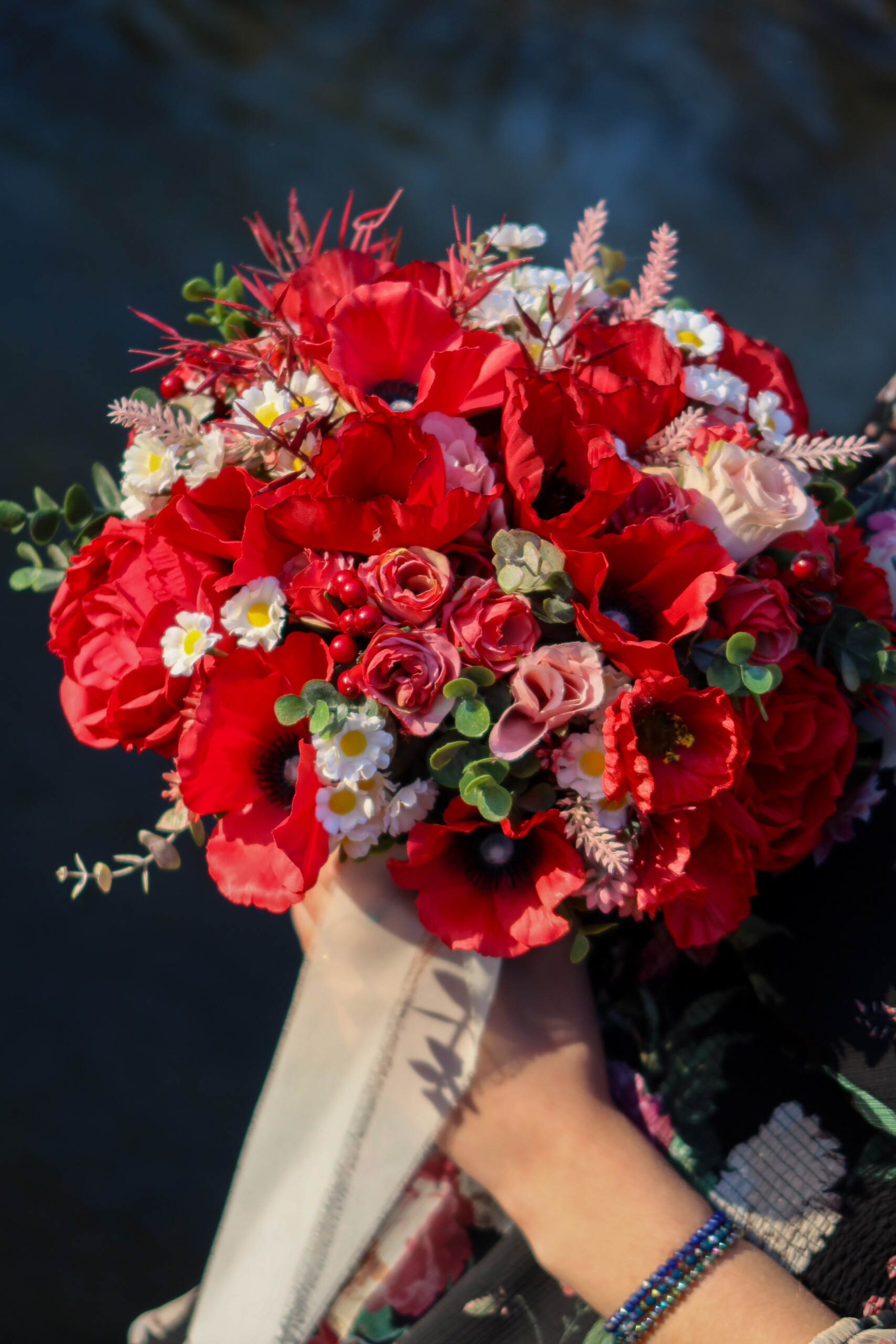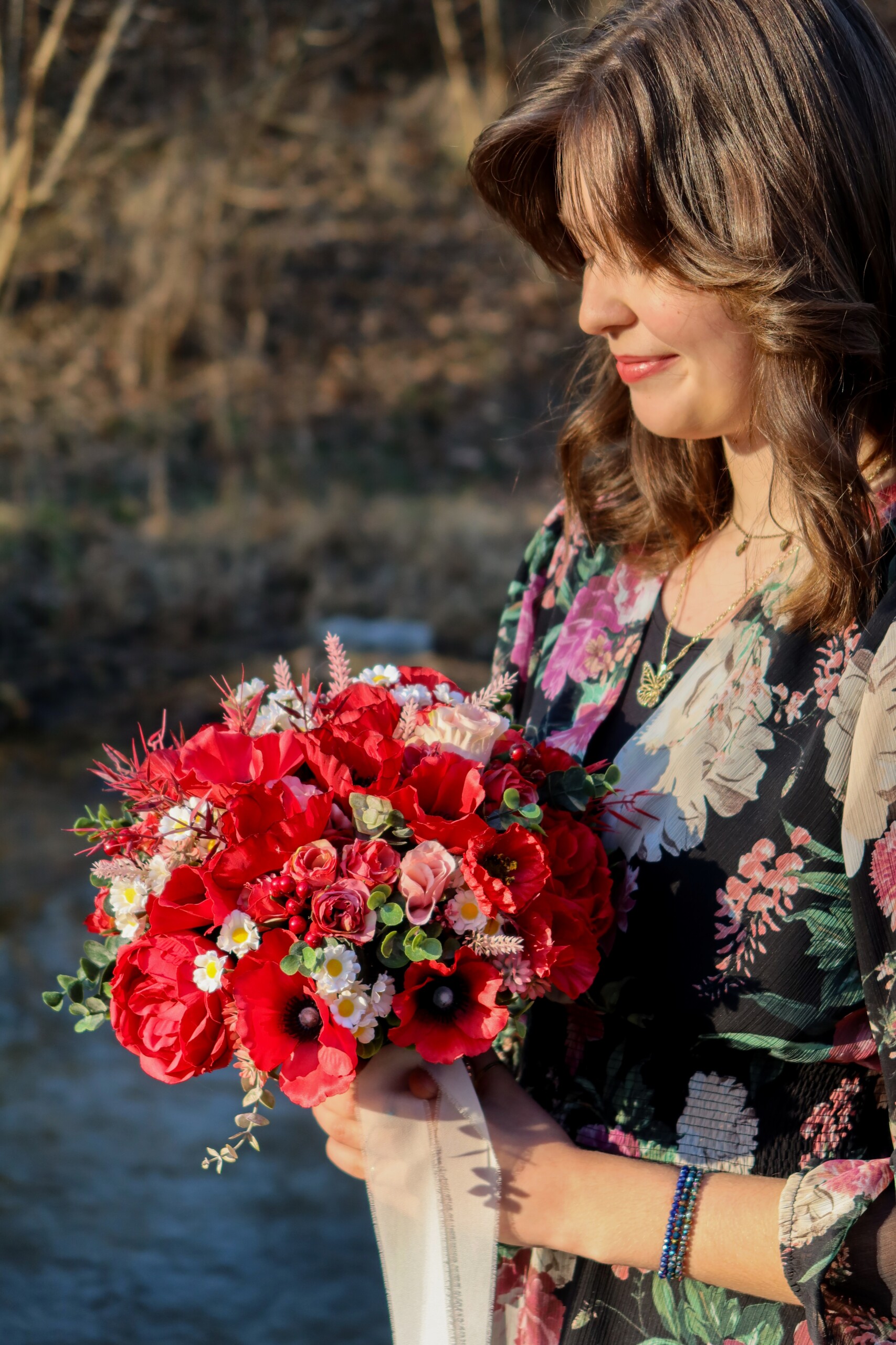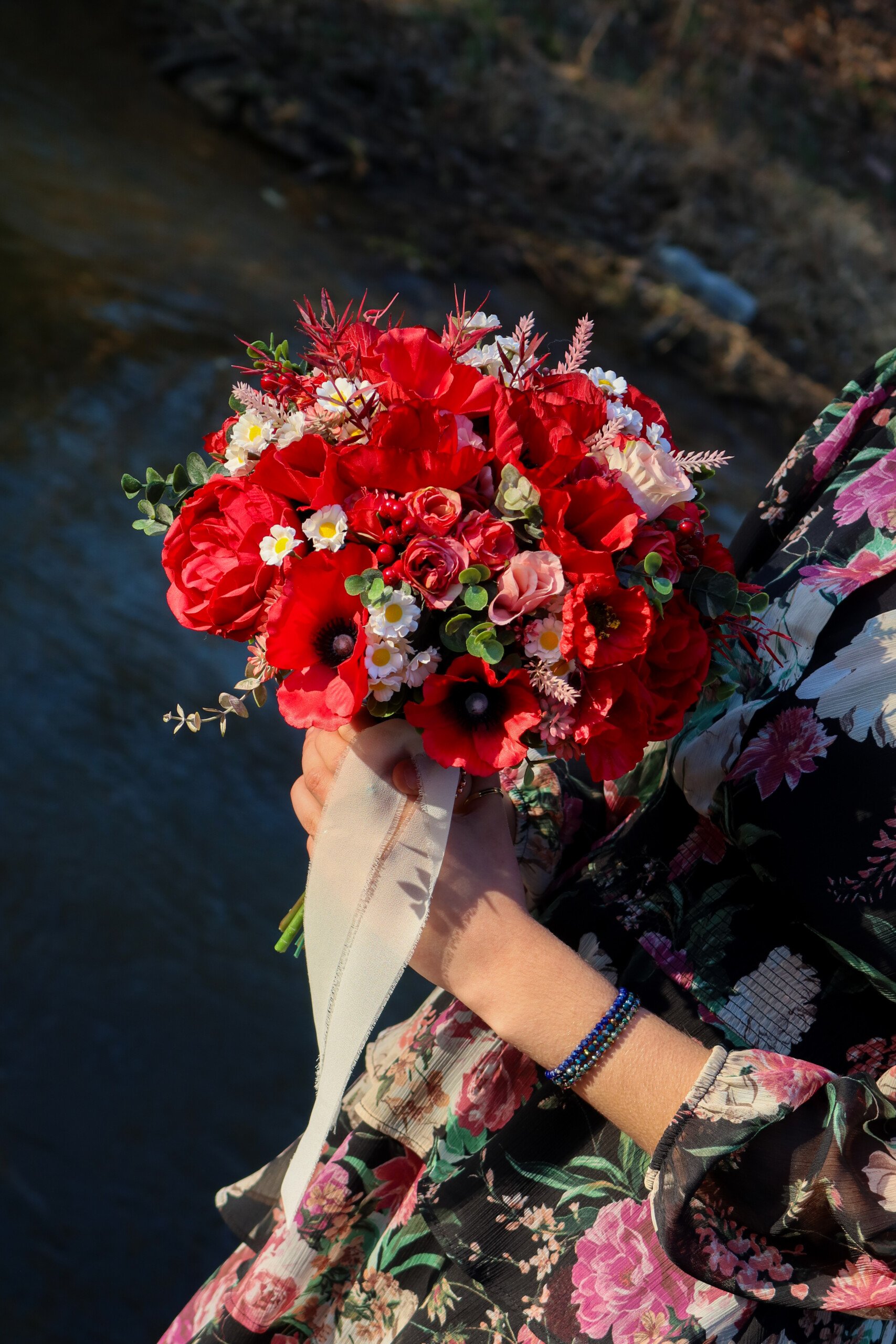 Svatební kytice z kvalitních látkových květin a různých přízdob. Stuha bílé barvy.